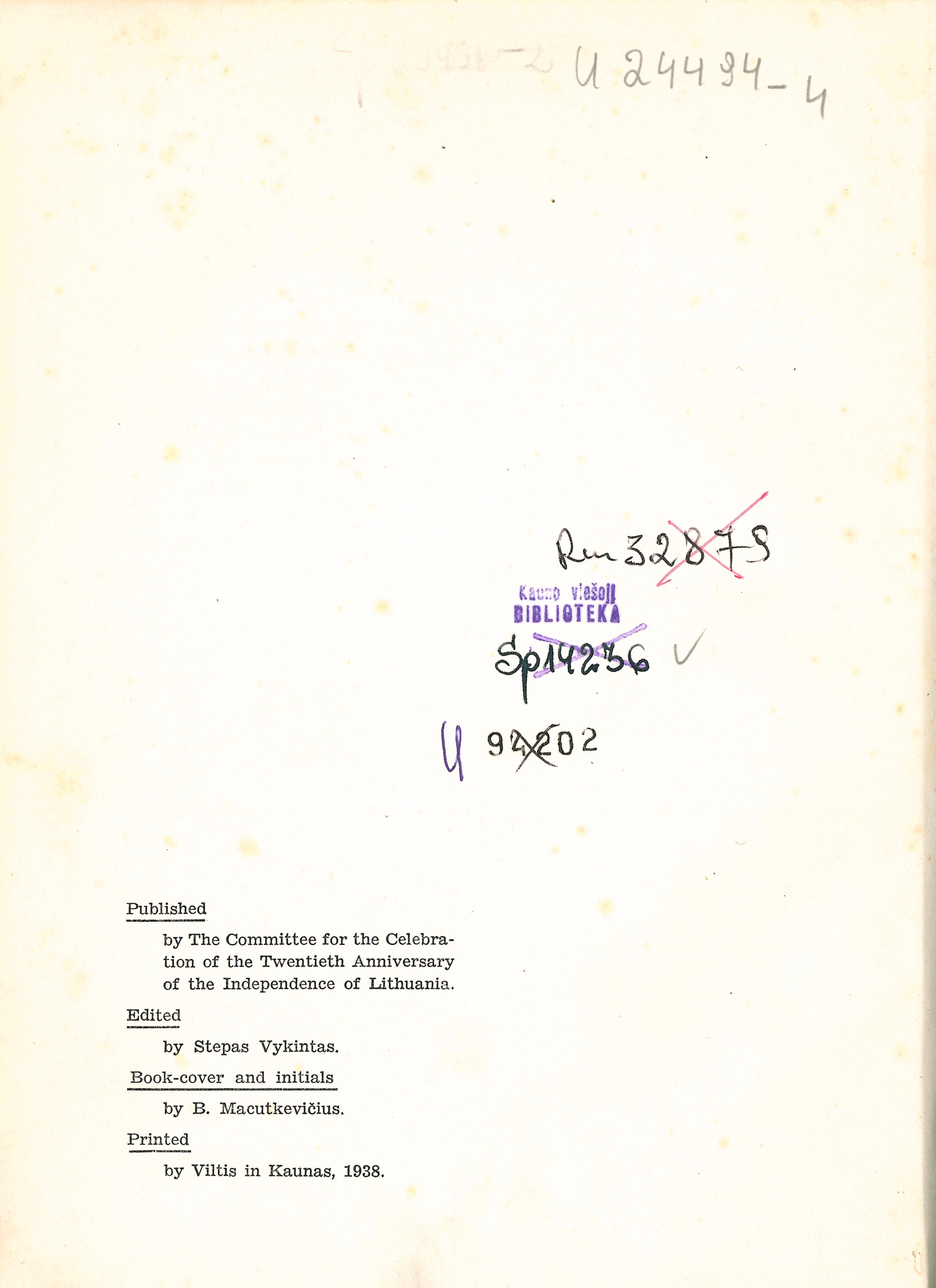 Published Kaunas : The Committee for the Celebration of the Twentieth Anniversary of the Independence of Lithuania, 1938