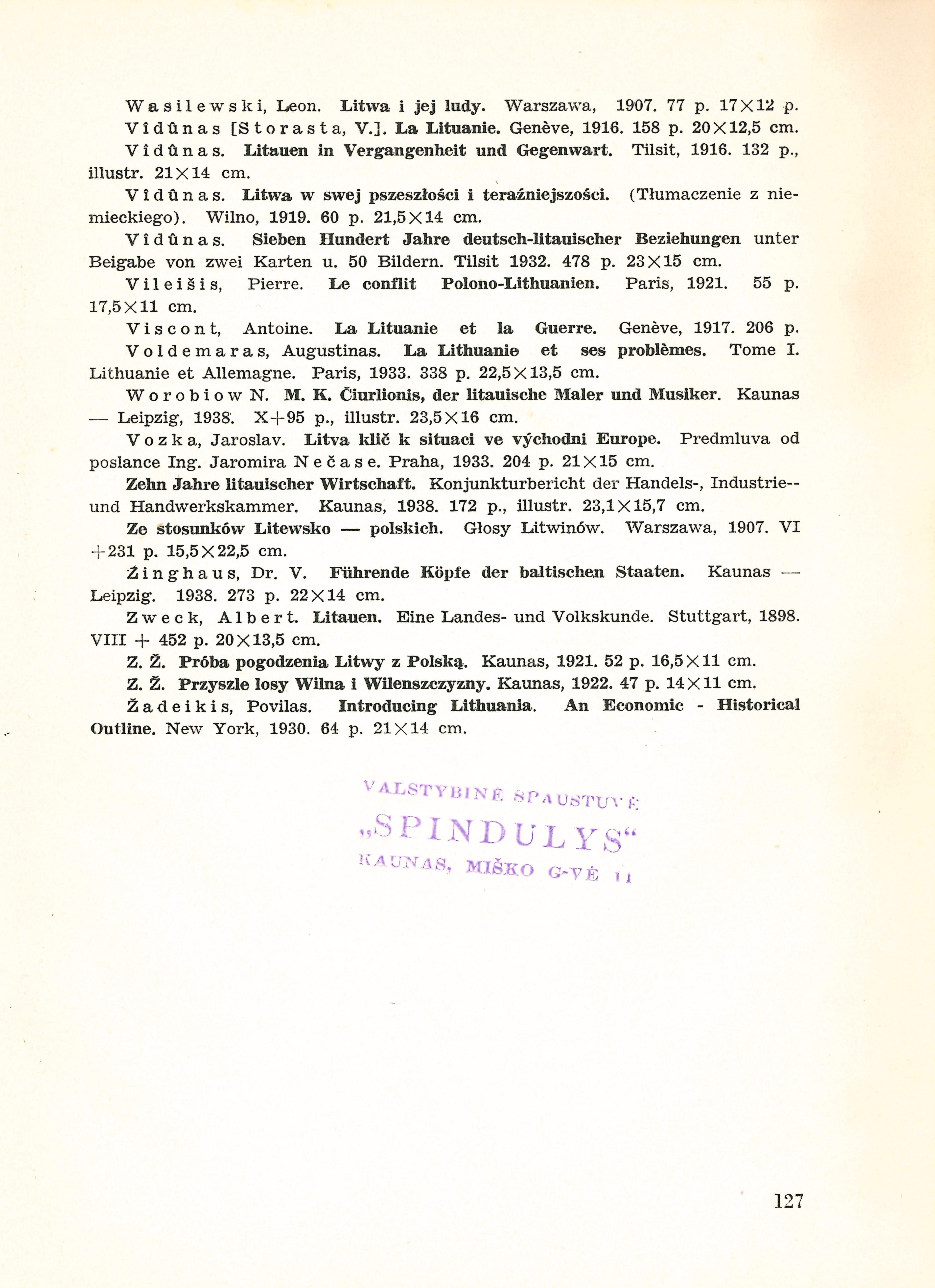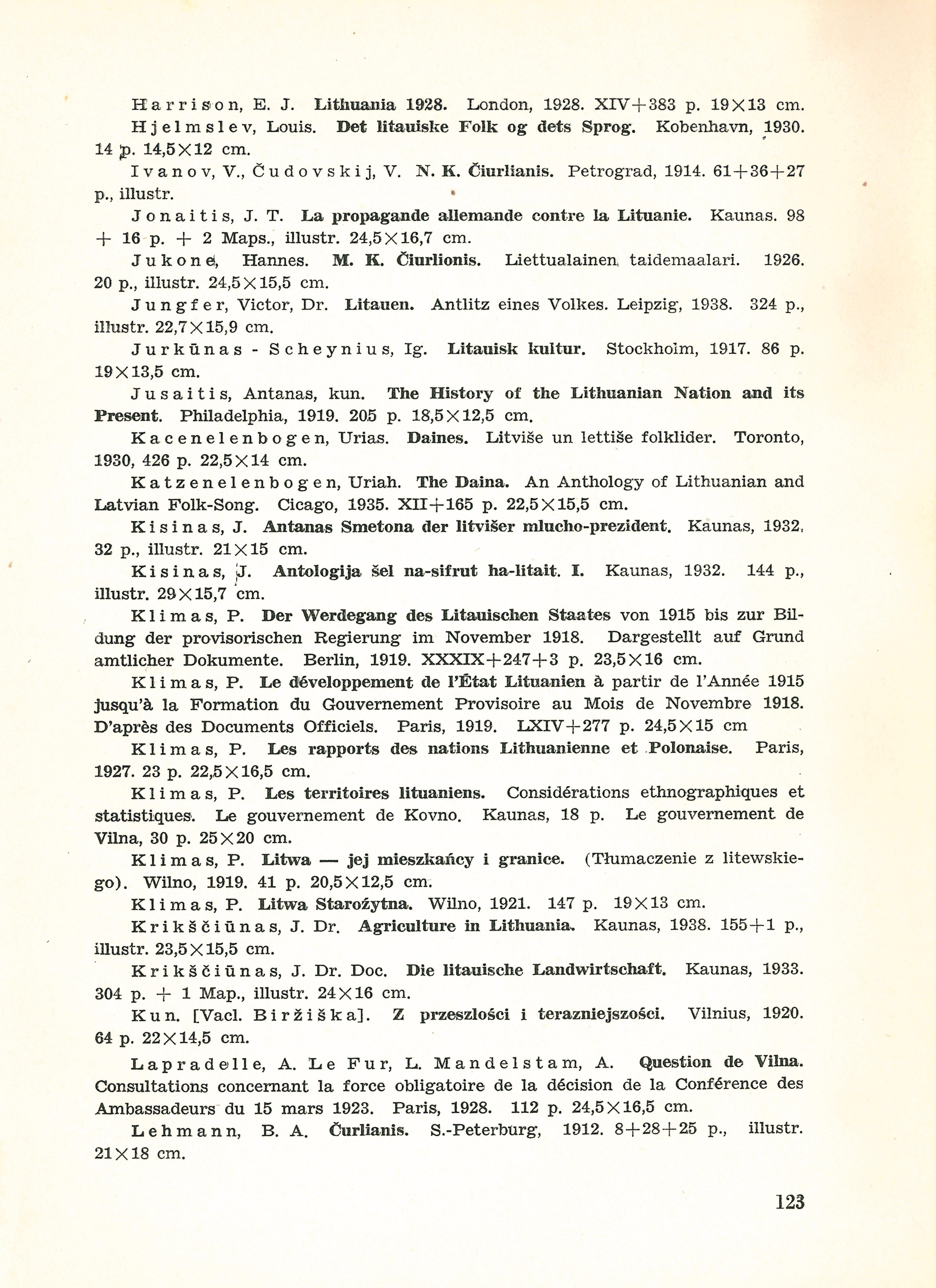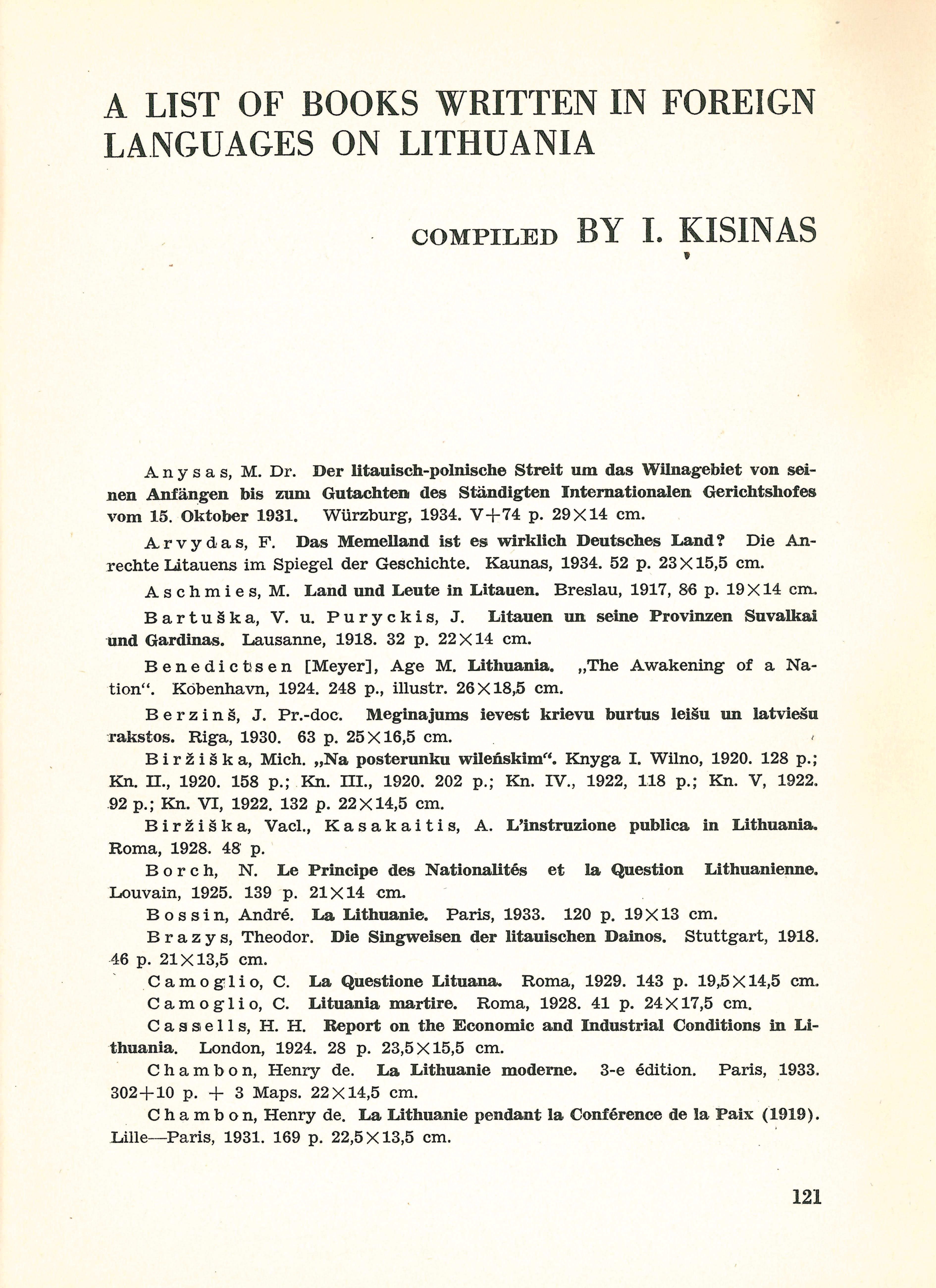 A List of books written in foreign languages on Lithuania / compiled by I. Kisinas. – Iš: Lithuanian culture / edited by Stepas Vykintas. – Kaunas : The Committee for the Celebration of the Twentieth Anniversary of the Independence of Lithuania, 1938. – p. 121-127.