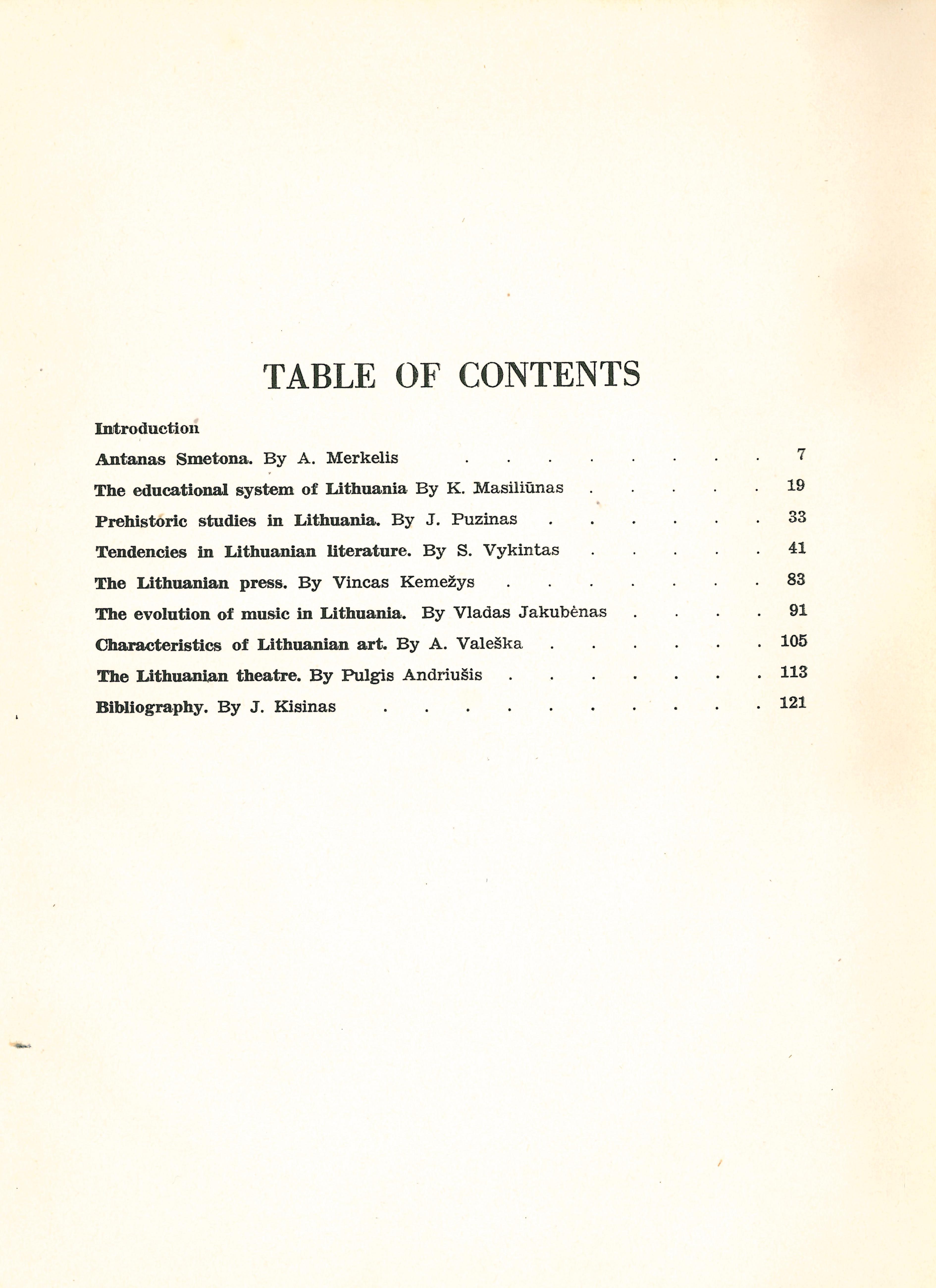 Merkelis Aleksandras. Antanas Smetona (p. 7-18); Masiliūnas Kazimieras. The educational system of Lithuania (p. 19-32); Puzinas Jonas. Prehistoric studies in Lithuania (p. 33-40); Povilavičius-Vykintas Stepas. Tendencies in Lithuanian literature (p. 41-82); Kemežys Vincas. The Lithuanian press (p. 83-90); Jakubėnas Vladas. The evolution of music in Lithuania (p. 91-104); Valeška Adolfas. Characteristics of Lithuanian art (p. 105-112); Andriušis Pulgis. The Lithuanian theatre (p. 113-120); Kisinas Izidorius. A list of books written in foreign languages on Lithuania (p. 121-127)
