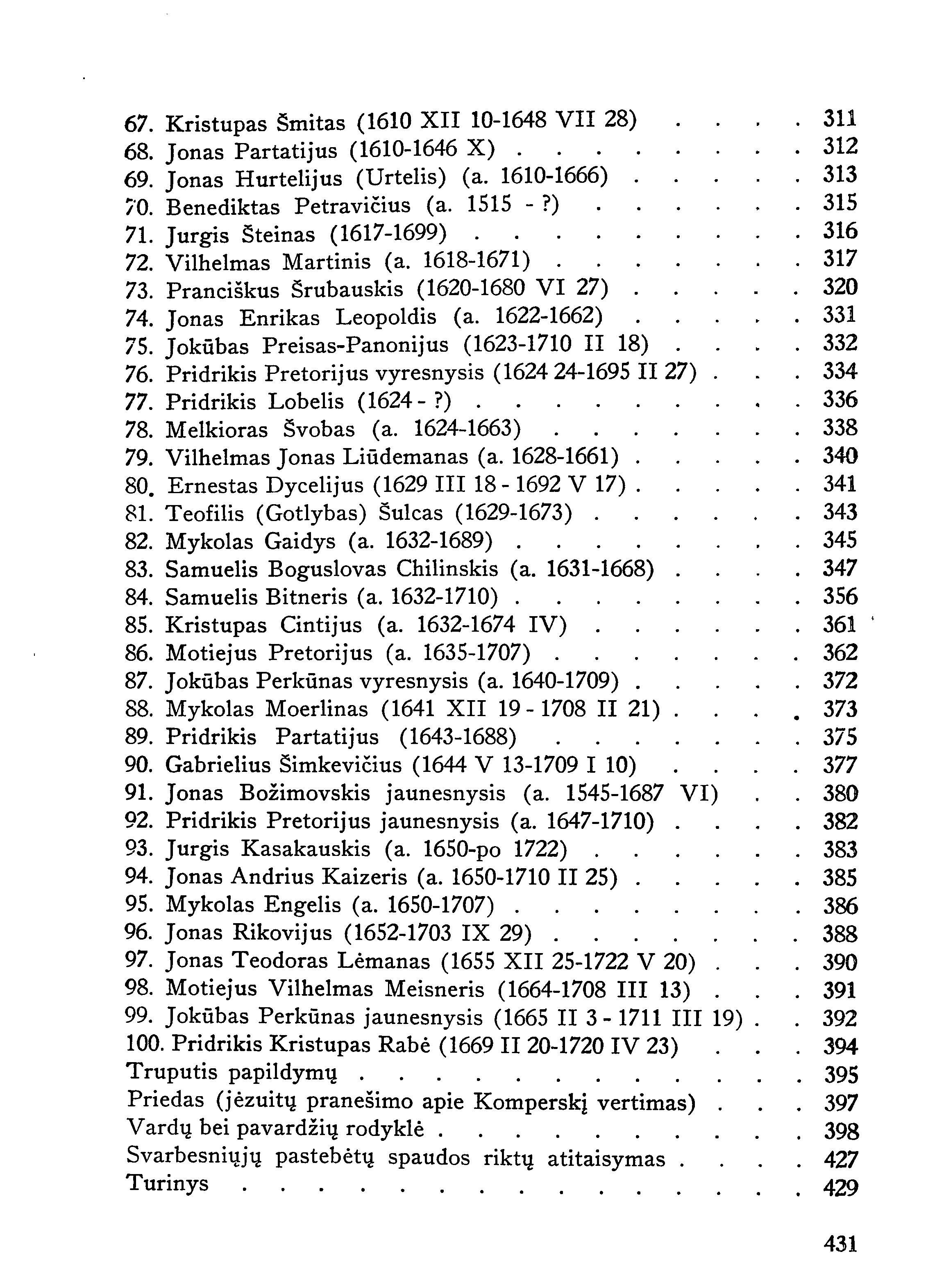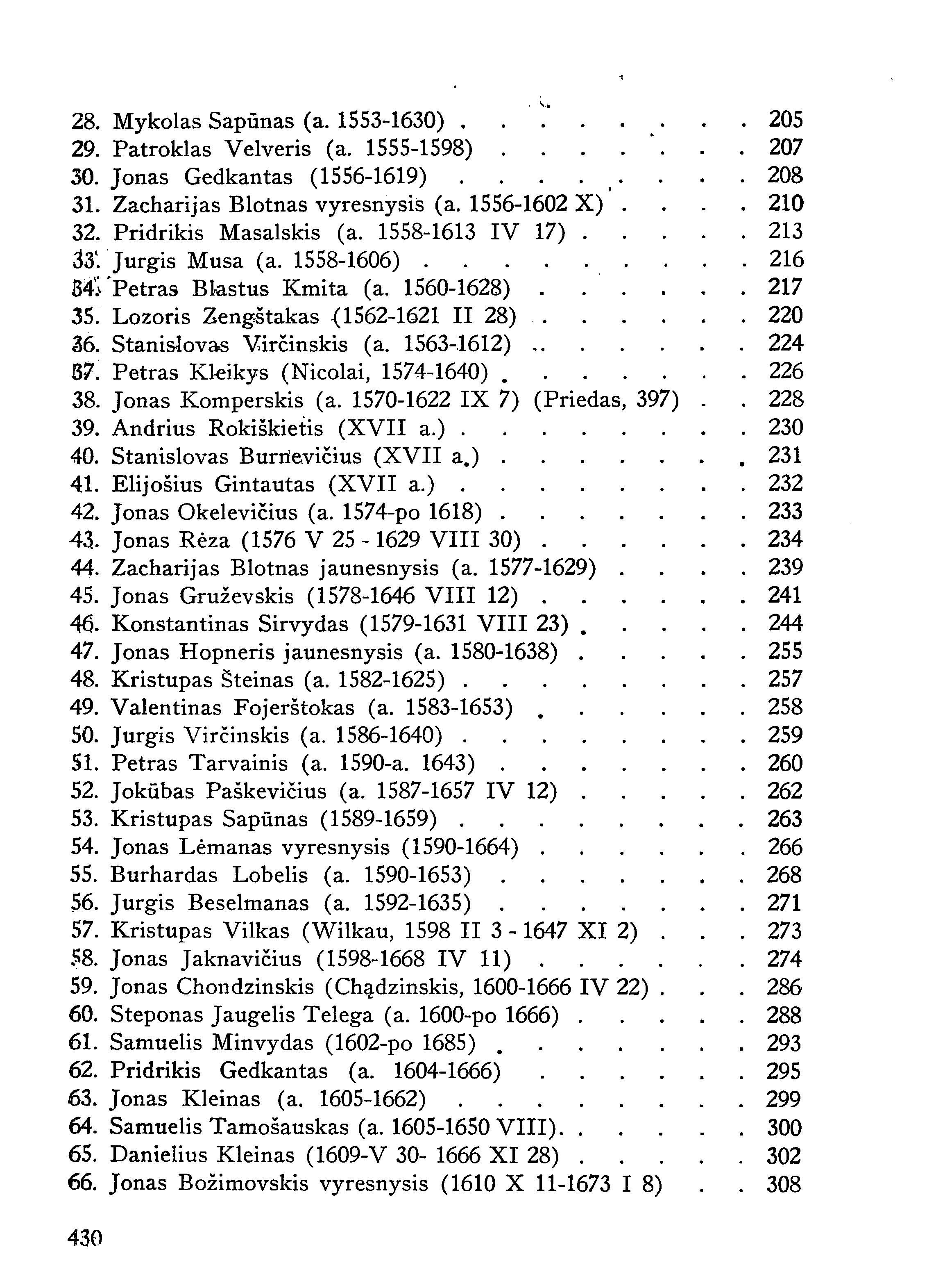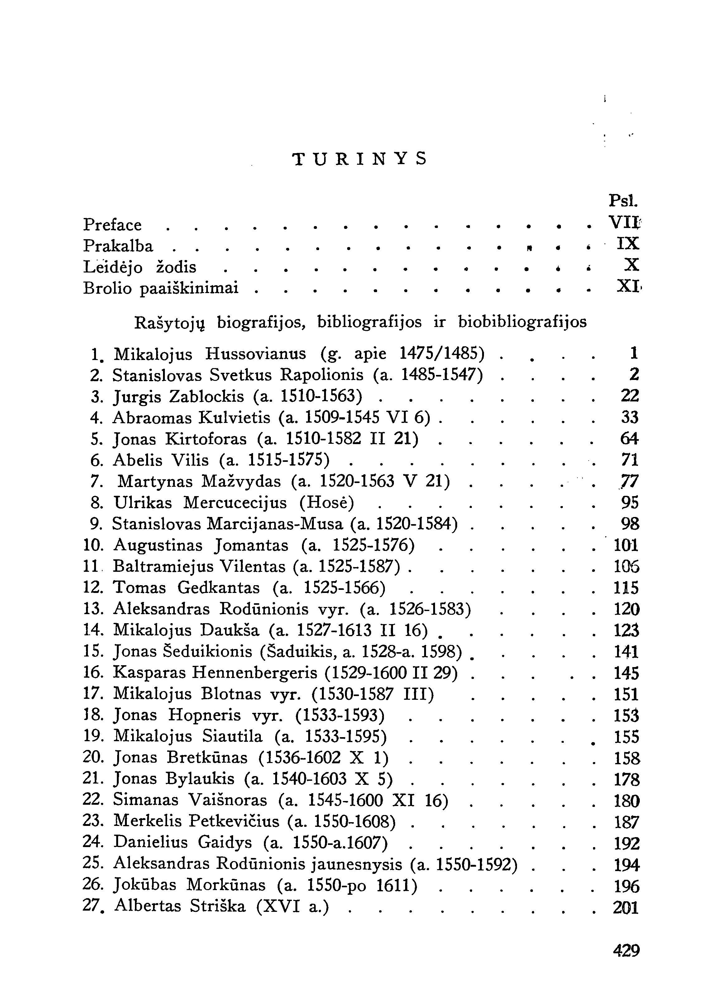| Mikalojus Hussovianus (g. apie 1475/1485) [p. 1-2]; Stanislovas Rapolionis (a. 1485-1547) [p. 2-21]; Jurgis Zablockis (a. 1510-1563) [p. 22-32]; Abraomas Kulvietis (a. 1509-1545) [p. 33-63]; Jonas Kirtoforas (a. 1510-1582) [p. 64-70); Abelis Vilis (a. 1515-1575) [p. 71-77] ; Martynas Mažvydas (a. 1520-1563 V 21) [p. 77-94]; Ulrikas Mercucecijus (Hosė) [p. 95-97]; Stanislovas Marcijanas-Musa (a. 1520-1584) [p. 98-100]; Augustinas Jomantas (a. 1525-1576) [p. 101-105]; Baltramiejus Vilentas (a. 1525-1587) [p. 106-114]; Tomas Gedkantas (a. 1525-1566) [p. 115-119]; Aleksandras Rodūnionis vyr. (a. 1526-1583) [p. 120-122]; Mikalojus Daukša (a. 1527-1613 II 16) [p. 123-140]; Jonas Šeduikionis (Šaduikis, a. 1528-a. 1598) [p. 141-144]; Kasparas Hennenbergeris (1529-1600 II 29) [p. 145-150]; Mikalojus Blotnas vyr. (1530-1587 III) [p. 151-152]; Jonas Hopneris vyr. (1533-1593) [p. 153-154]; Mikalojus Siautila (a. 1533-1595) [p. 155-158]; Jonas Bretkūnas (1536-1602 XI) [p. 158-177]; Jonas Bylaukis (a. 1540-1603 X 5) [p. 178-179]; Simanas Vaišnoras (a. 1545-1600 XI 16) [p. 180-186]; Merkelis Petkevičius (a. 1550-1608) [p. 187-191]; Danielius Gaidys (a. l550-a,1607) [p. 192-193]; Aleksandras Rodūnionis jaunesnysis (a. 1550-1592) [p. 194-195]; Jokūbas Morkūnas (a. 1550-po 1611) [p. 196-200]; Albertas Striška (XVI a.) [p. 201-204] ; Mykolas Sapūnas (a. 1553-1630) [p. 205-206]; Patroklas Velveris (a. 1555-1598) [p. 207]; Jonas Gedkantas (1556-1619) [p. 208-209]; Zacharijas Blotnas vyresnysis (a. 1556-1602 X) [p. 210-212]; Pridrikis Masalskis (a. 1558-1613 IV 17) [p. 213-215]; Jurgis Muša (a. 1558-1606) [p. 216]; Petras Blastus Kmita (a. 1560-1628) [p. 217-219]; Lozoris Zengštakas (1562-1621 II 28) [p. 220-223]; Stanislovas Virčinskis (a. 1563-1612) [p. 224-225]; Petras Kleikys (Nicolai, 1574-1640) [p. 226-227]; Jonas Komperskis (a. 1570-1622 IX 7) [p. 228-229]; Andrius Rokiškietis (XVII a.) [p. 230]; Stanislovas Burnevičius (XVII a.) [p. 231]; Elijošius Gintautas (XVII a.) [p. 232]; Jonas Okelevičius (a. 1574-po 1618) [p. 233]; Jonas Rėza (1576 V 25 - 1629 VIII 30) [p. 234-238]; Zacharijas Blotnas jaunesnysis (a. 1577-1629) [p. 239-240]; Jonas Gruževskis (1578-1646 VIII 12) [p. 241-243]; Konstantinas Sirvydas (1579-1631 VIII 23) [p. 244-254]; Jonas Hopneris jaunesnysis (a. 1580-1638) [p. 255-256]; Kristupas Šteinas (a. 1582-1625) [p. 257]; Valentinas Fojerštokas (a. 1583-1653) [p. 258]; Jurgis Virčinskis (a. 1586-1640) [p. 259]; Petras Tarvainis (a. 1590-a. 1643) [p. 260-261]; Jokūbas Paškevičius (a. 1587-1657 IV 12) [p. 262]; Kristupas Sapūnas (1589-1659) [p. 263-265]; Jonas Lėmanas vyresnysis (1590-1664) [p. 266-267]; Burhardas Lobelis (a. 1590-1653) [p. 268-270]; Jurgis Beselmanas (a. 1592-1635) [p. 271-272]; Kristupas Vilkas (Wilkau, 1598 II 3 - 1647 XI 2) [p. 273]; Jonas Jaknavičius (1598-1668 IV 11) [p. 274-285]; Jonas Chondzinskis (Chądzinskis, 1600-1666 IV 22) [p. 286-287]; Steponas Jaugelis Telega (a. 1600-po 1666) [p. 288-292]; Samuelis Minvydas (1602-po 1685) [p. 293-294]; Pridrikis Gedkantas (a. 1604-1666) [p. 295-298]; Jonas Kleinas (a. 1605-1662) [p. 299]; Samuelis Tamošauskas (a. 1605-1650 VIII) [p. 300-301]; Danielius Kleinas (1609-V 30- 1666 XI 28) [p. 302-307]; Jonas Božimovskis vyresnysis (1610 X 11-1673 1 8) [p. 308-310]; Kristupas Šmitas (1610 XII 10-1648 VII 28) [p. 311]; Jonas Partatijus (1610-1646 X) [p. 312]; Jonas Hurtelijus (Urtelis) (a. 1610-1666) [p. 313-314]; Benediktas Petravičius (a. 1515 - ?) [p. 315]; Jurgis Šteinas (1617-1699) [p. 316]; Vilhelmas Martinis (a. 1618-1671) [p. 317-319]; Pranciškus Šrubauskis (1620-1680 VI 27) [p. 320-330]; Jonas Enrikas Leopoldis (a. 1622-1662) [p. 331]; Jokūbas Preisas-Panonijus (1623-1710 II 18) [p. 332-333]; Pridrikis Pretorijus vyresnysis (1624 24-1695 II 27) [p. 334-335]; Pridrikis Lobelis (1624- ?) [p. 336-337]; Melkioras Švobas (a. 1624-1663) [p. 338-339]; Vilhelmas Jonas Liūdemanas (a. 1628-1661) [p. 340]; Ernestas Dycelijus (1629 III 18- 1692 V 17) [p. 341-342]; Teofilis (Gotlybas) Šulcas (1629-1673) [p. 343-344]; Mykolas Gaidys (a. 1632-1689) [p. 345-346]; Samuelis Boguslovas Chilinskis (a. 1631-1668) [p. 347-355]; Samuelis Bitneris (a. 1632-1710) [p. 356-360]; Kristupas Cintijus (a. 1632-1674 IV) [p. 361]; Motiejus Pretorijus (a. 1635-1707) [p. 362-371]; Jokūbas Perkūnas vyresnysis (a. 1640-1709) [p. 372]; Mykolas Moerlinas (1641 XII 19- 1708 II 21) [p. 373-374]; Pridrikis Partatijus (1643-1688) [p. 375-376]; Gabrielius Šimkevičius (1644 V 13-1709 I 10) [p. 377-379]; Jonas Božimovskis jaunesnysis (a. 1545-1687 VI) [p. 380-391]; Pridrikis Pretorijus jaunesnysis (a. 1647-1710) [p. 382]; Jurgis Kasakauskis (a. 1650-po 1722) [p. 383-384]; Jonas Andrius Kaizeris (a. 1650-1710 II 25) [p. 385]; Mykolas Engelis (a. 1650-1707) [p. 386-387]; Jonas Rikovijus (1652-1703 IX 29)[p. 388-389]; Jonas Teodoras Lėmanas (1655 XII 25-1722 V 20) [p. 390]; Motiejus Vilhelmas Meisneris (1664-1708 III 13) [p. 391]; Jokūbas Perkūnas jaunesnysis (1665 II 3 - 1711 III 19) [p. 392-393]; Pridrikis Kristupas Rabė (1669 II 20-1720 IV 23) [p. 394]. | |