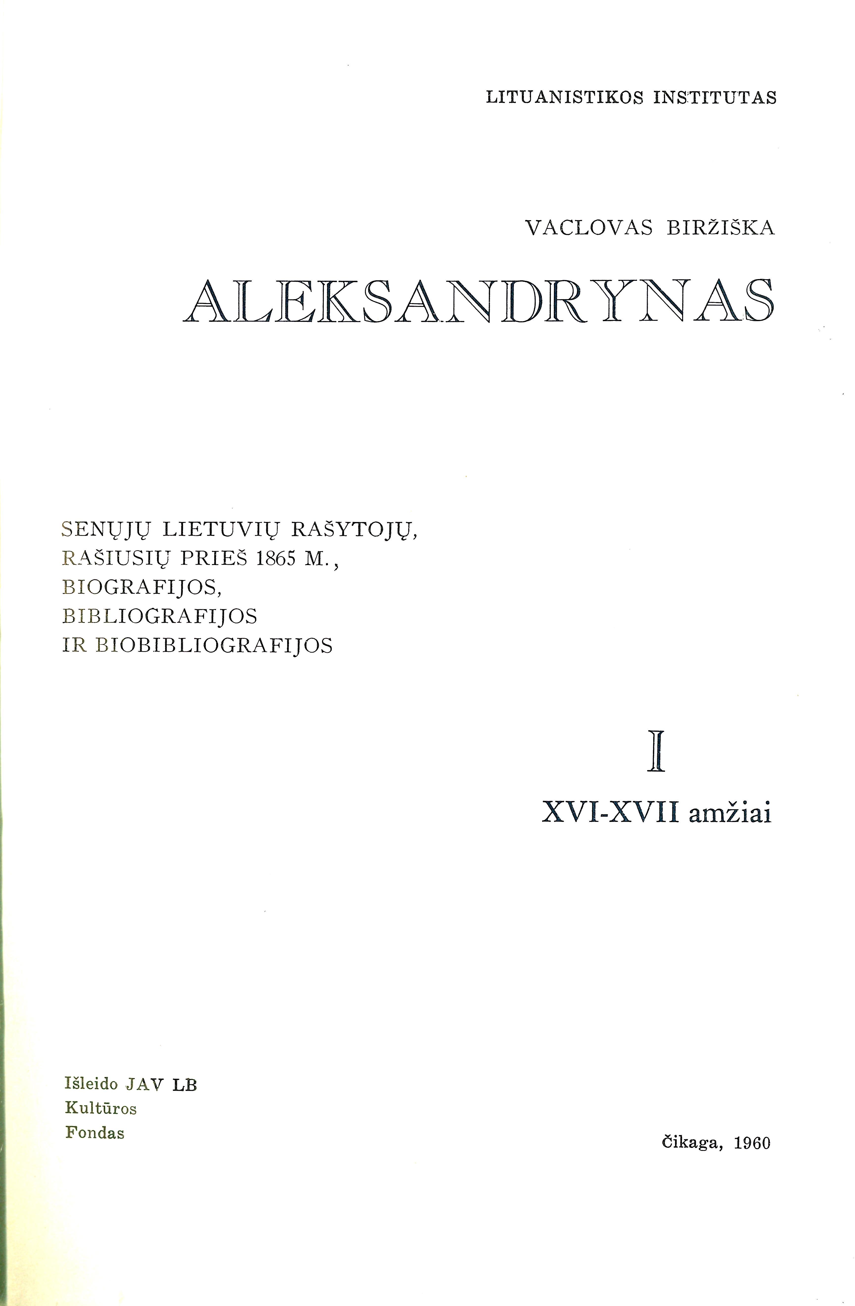 | Antraštė | Aleksandrynas. T. 1 : XVI – XVII amžiai (1960) |