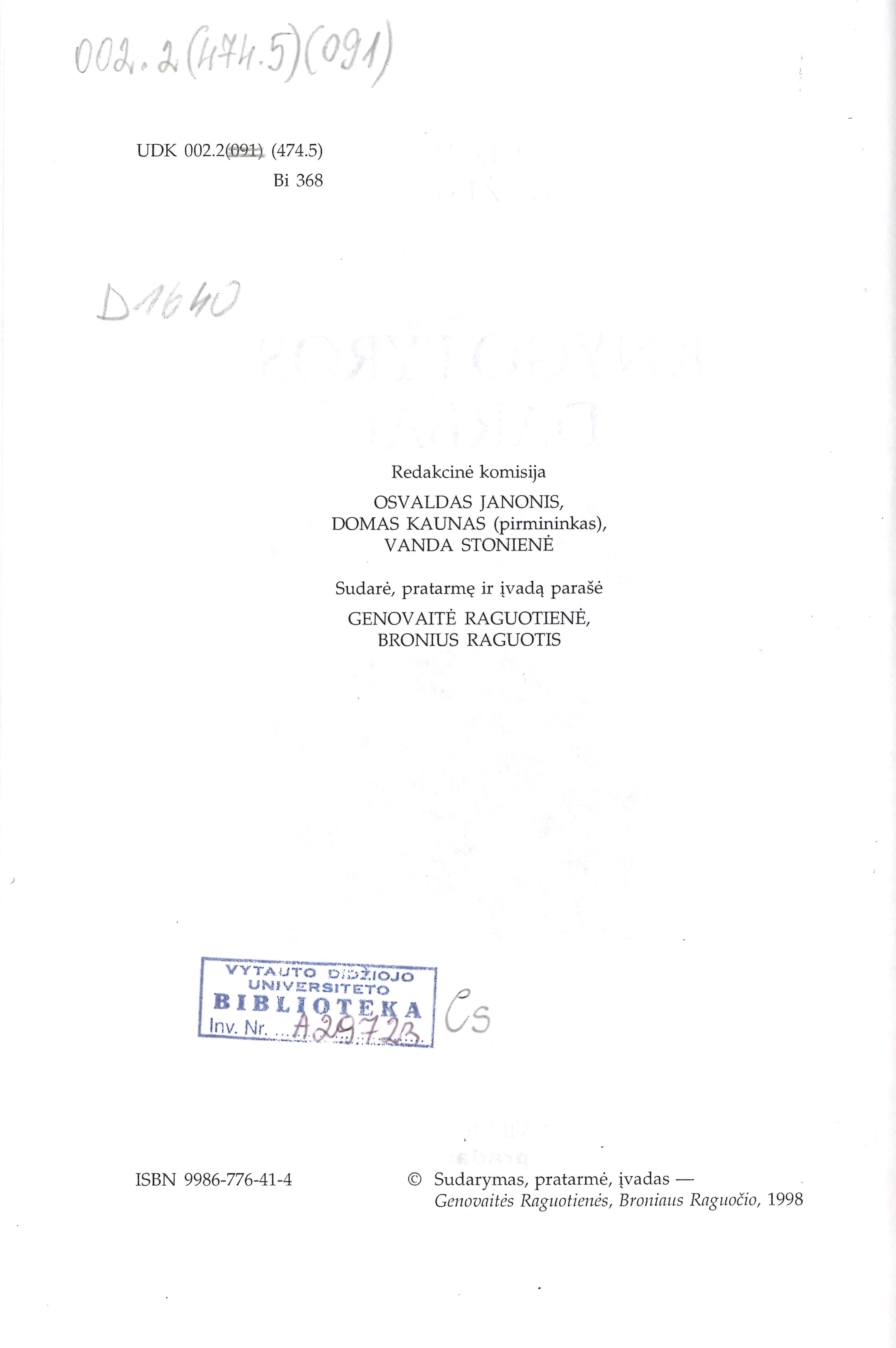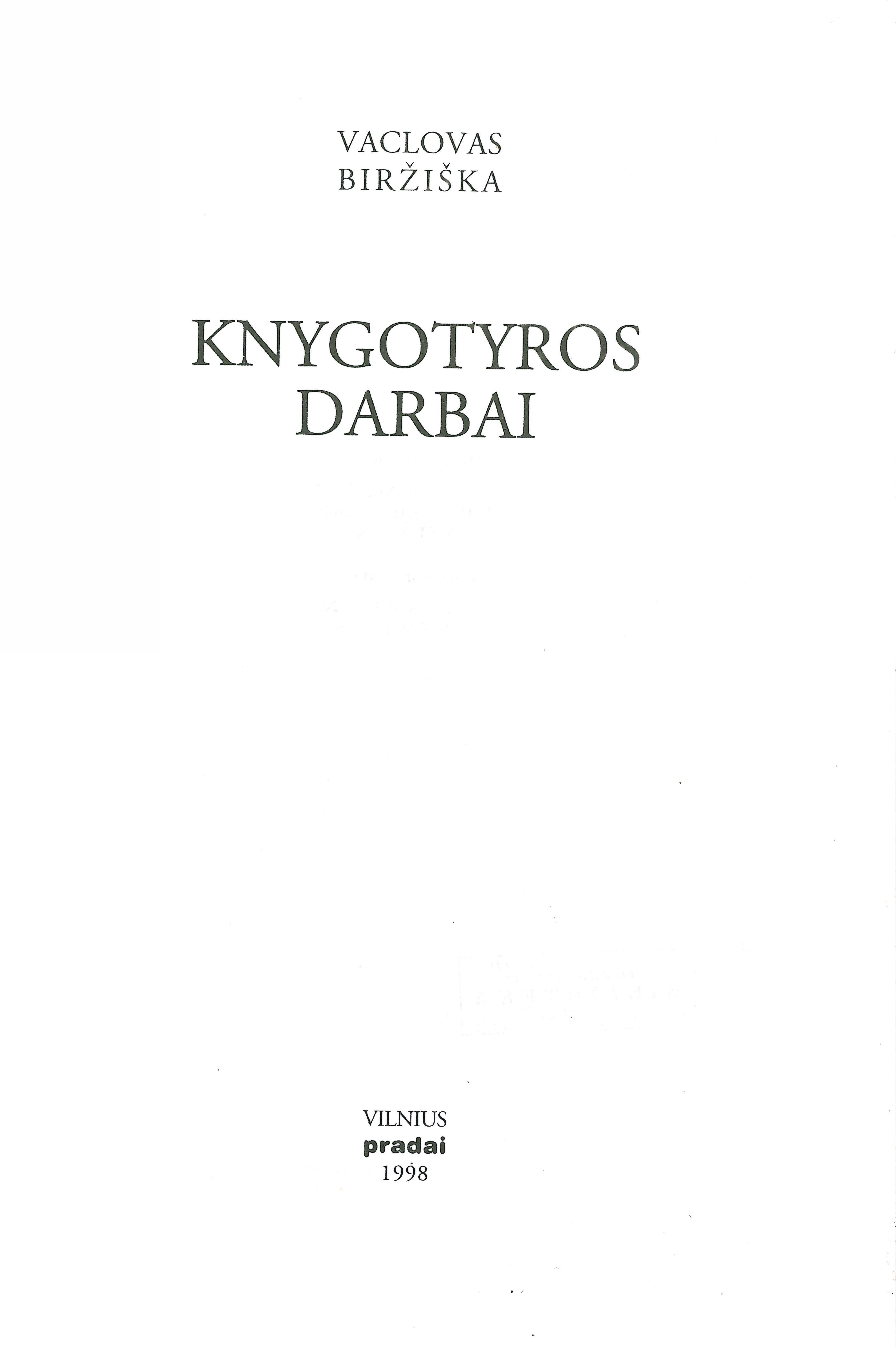 | Antraštė | Knygotyros darbai / Vaclovas Biržiška. – Vilnius: Pradai, 1998. – 550, [2] p. [lt] |