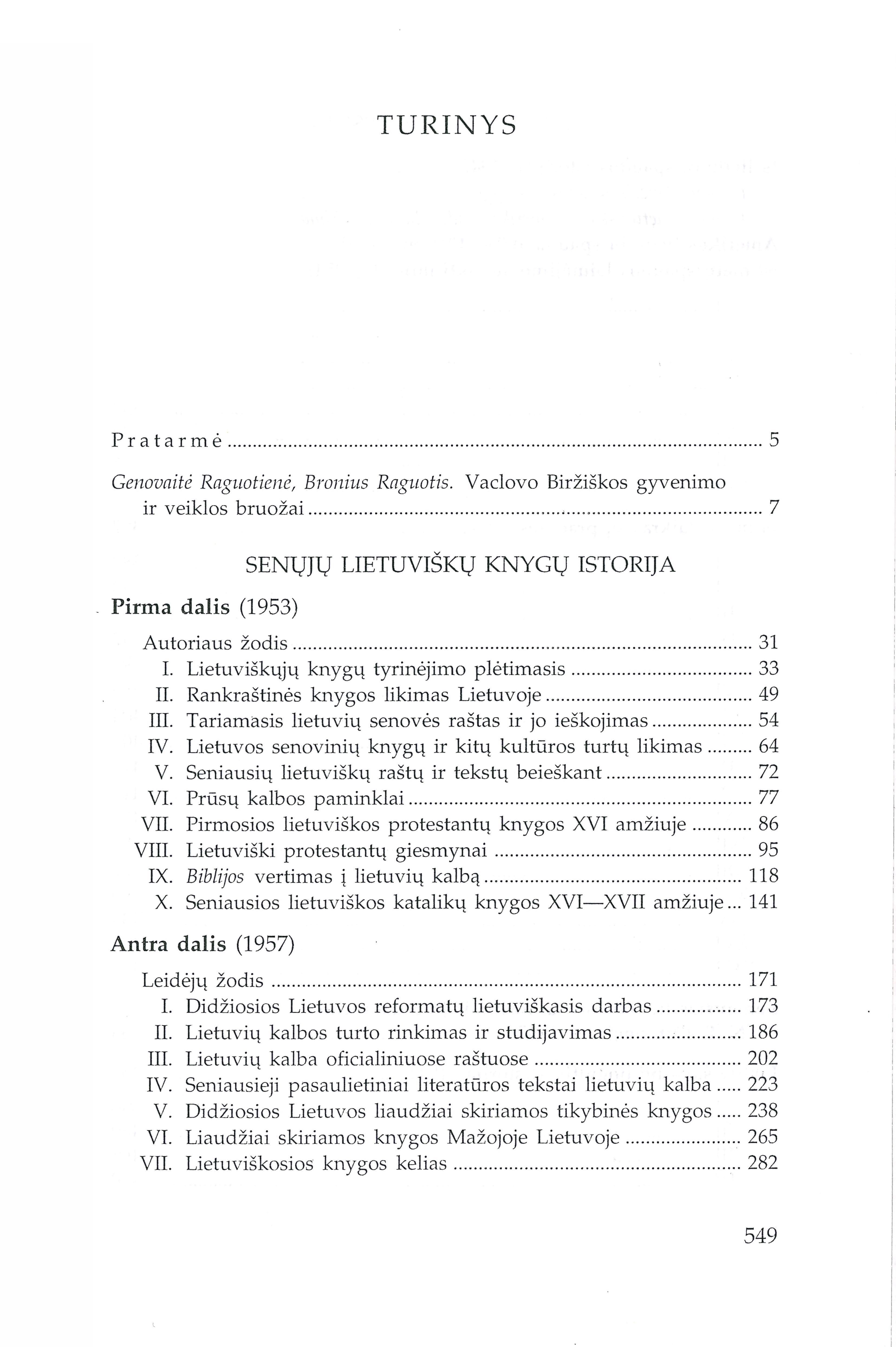 | Turinys: Raguotienė Genovaitė, Raguotis Bronius. Vaclovo Biržiškos gyvenimo ir veiklos bruožai (p. 7-30); Senųjų lietuviškų knygų istorija (1930–1953–1957, p. 31-322); Iš lietuvių spaudos istorijos (1947, p. 323-327); Amerikos lietuvių spauda 1875–1910 m. (1951, p. 328-340); 50 metų spaudos laimėjimo sukaktį minint (1954, p. 341-381); Iš mūsų laikraščių praeities (1932, p. 382-452); Seniausias lietuviškas laikraštis ir jo redaktorius N. P. Ostermejeris (1947, p. 453-455); Lietuviškos bibliografijos istorija (1944, p. 456-523). [lt] | |