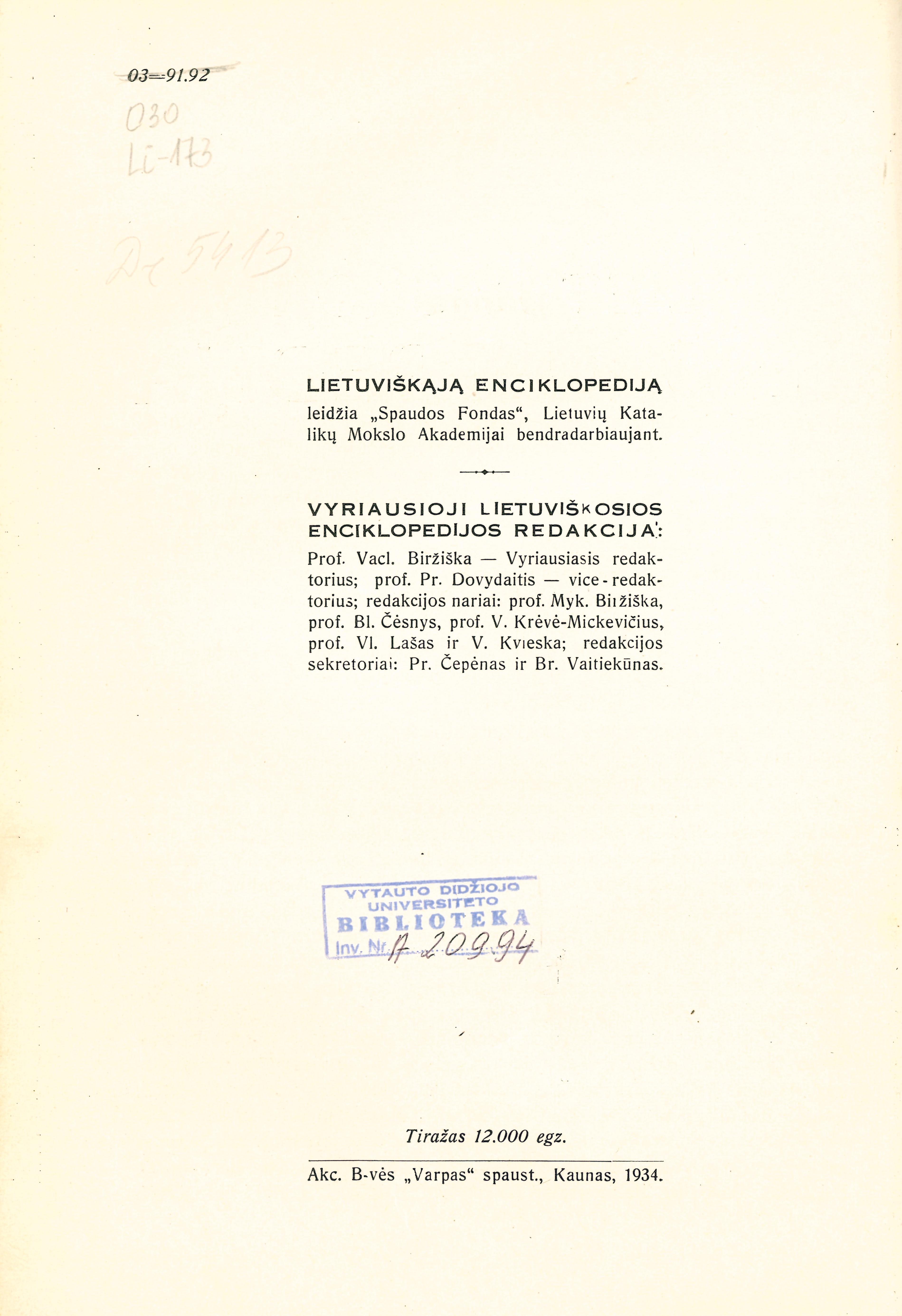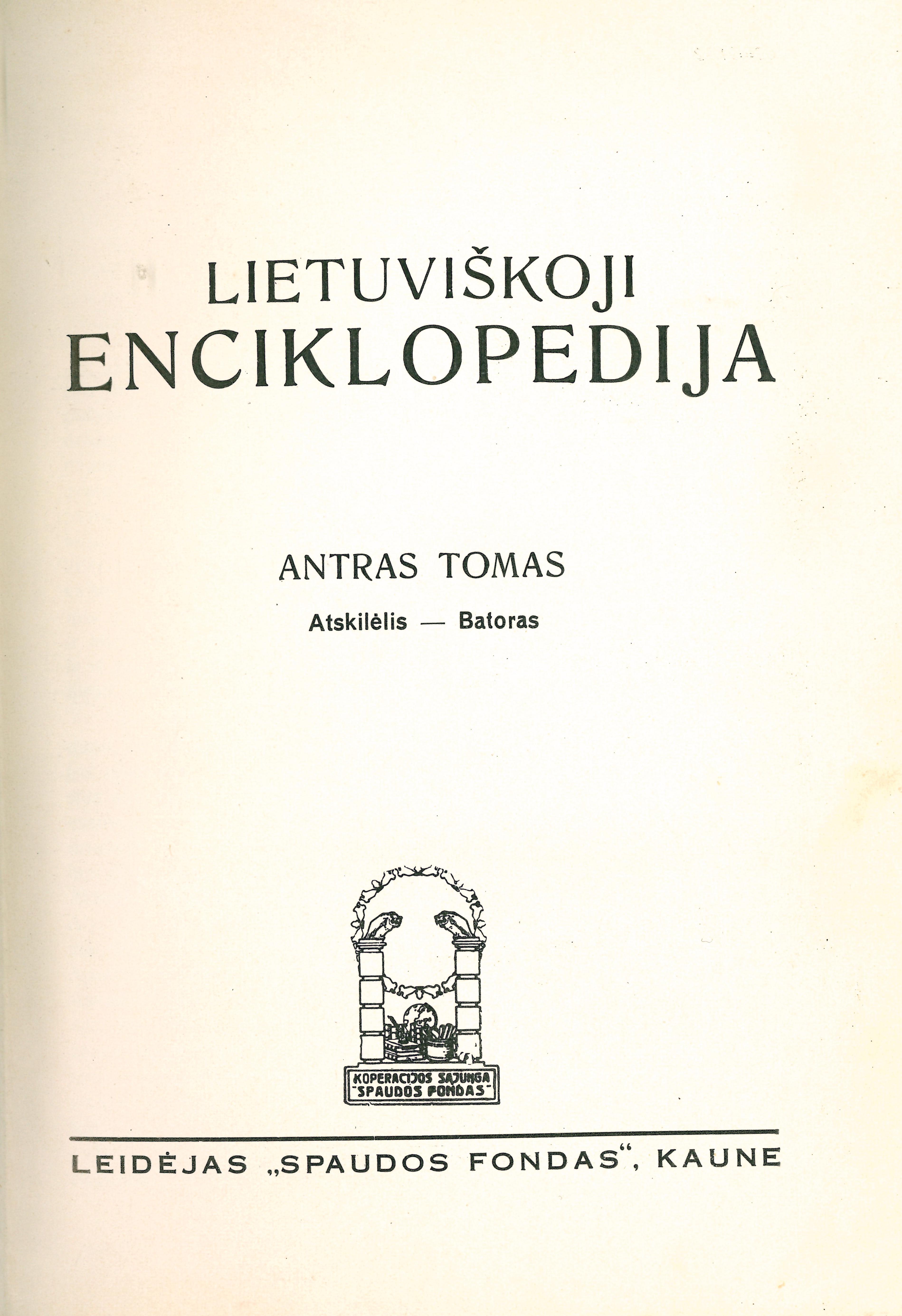 | Antraštė | Lietuviškoji enciklopedija. T. 2: Atskilėlis – Batoras / redaktorius Vaclovas Biržiška. – Kaunas: Spaudos fondas, 1934. – XVI p., 1534 sklt. [lt] |