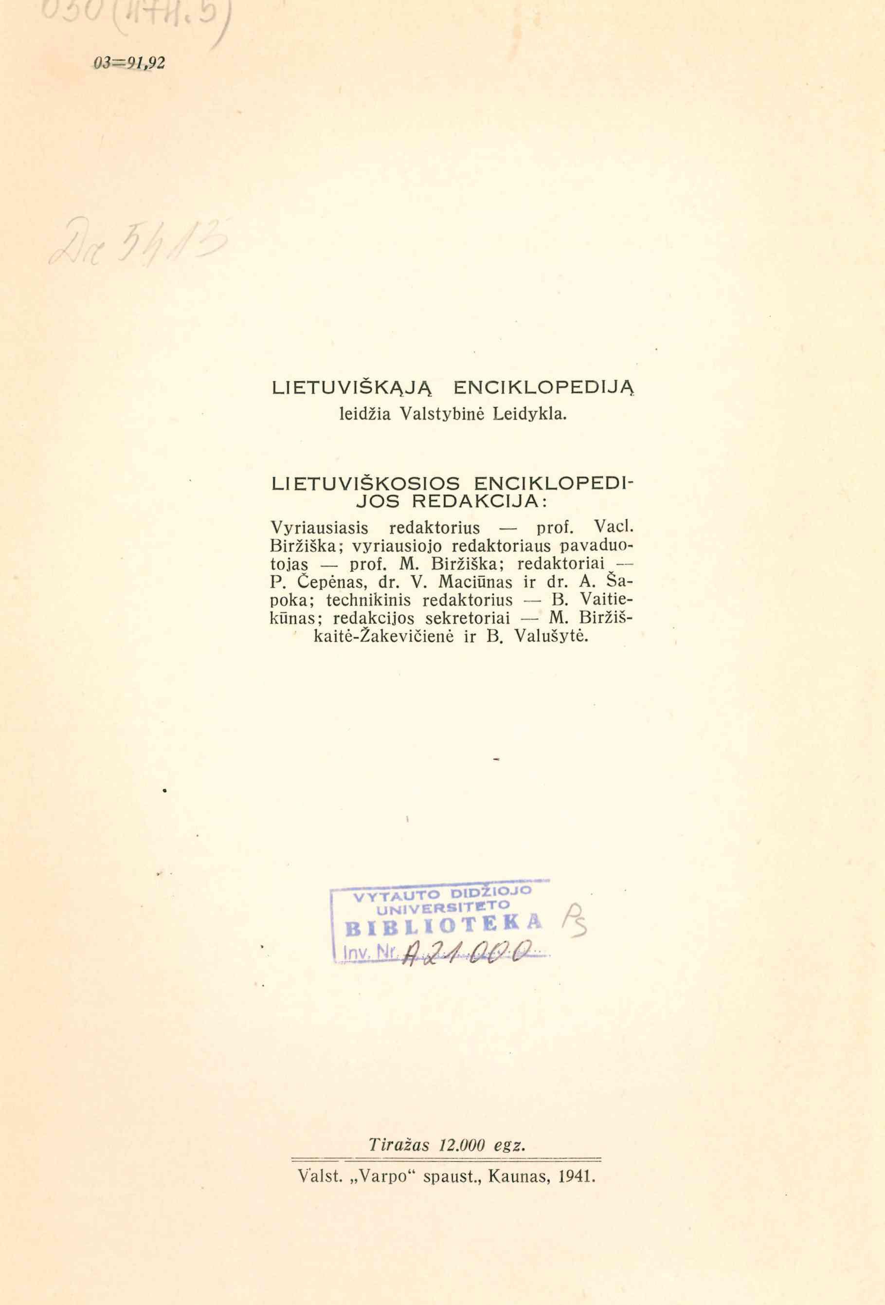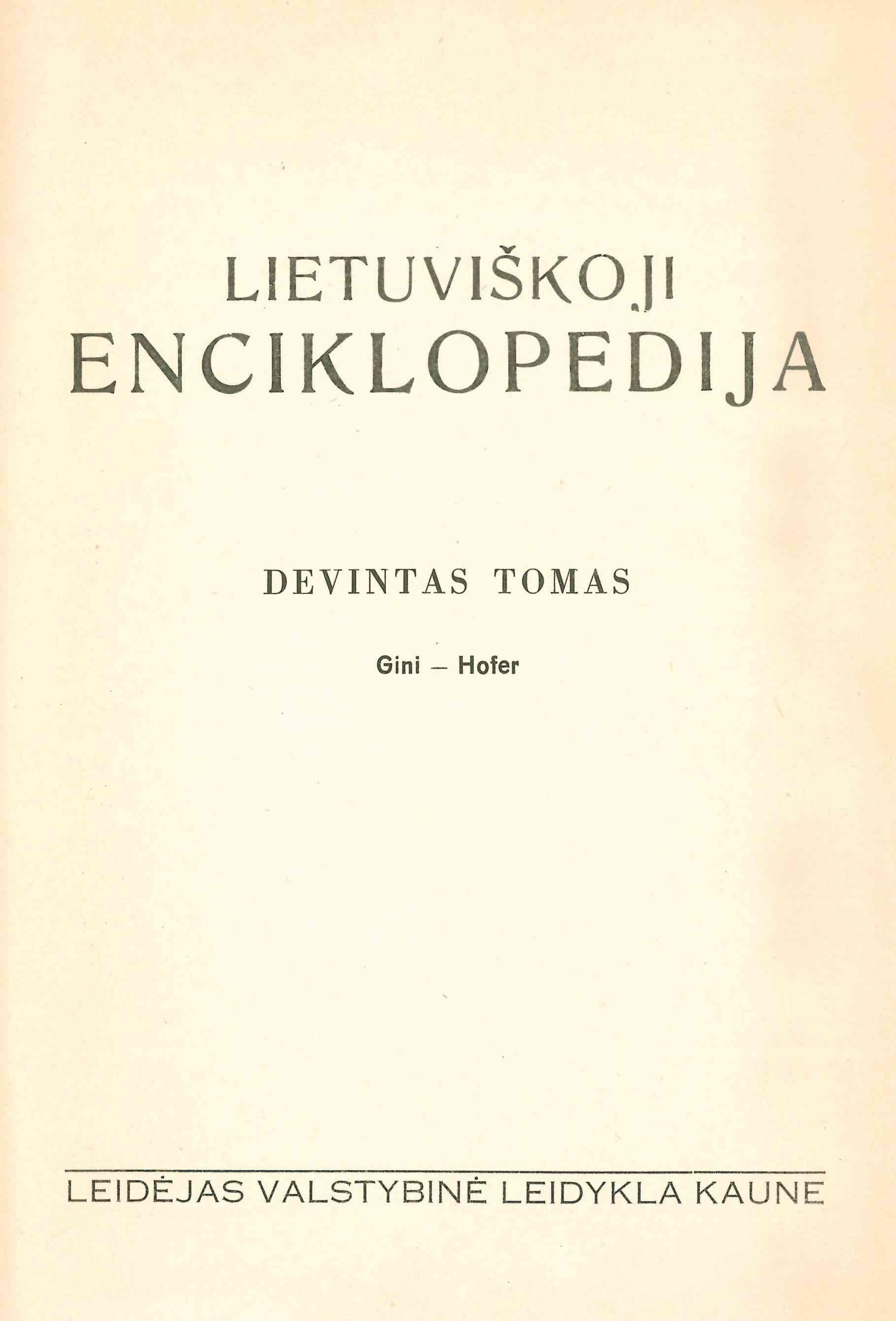 | Antraštė | Lietuviškoji enciklopedija. T. 9: Gini – Hofer / redaktorius Vaclovas Biržiška. – Kaunas: Spaudos fondas, 1941. – XII p., 1534 sklt. [lt] |