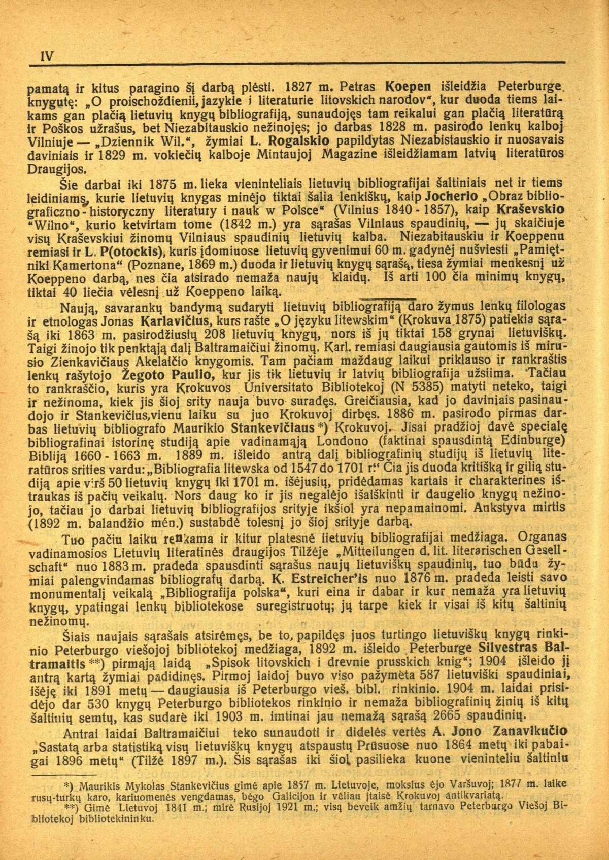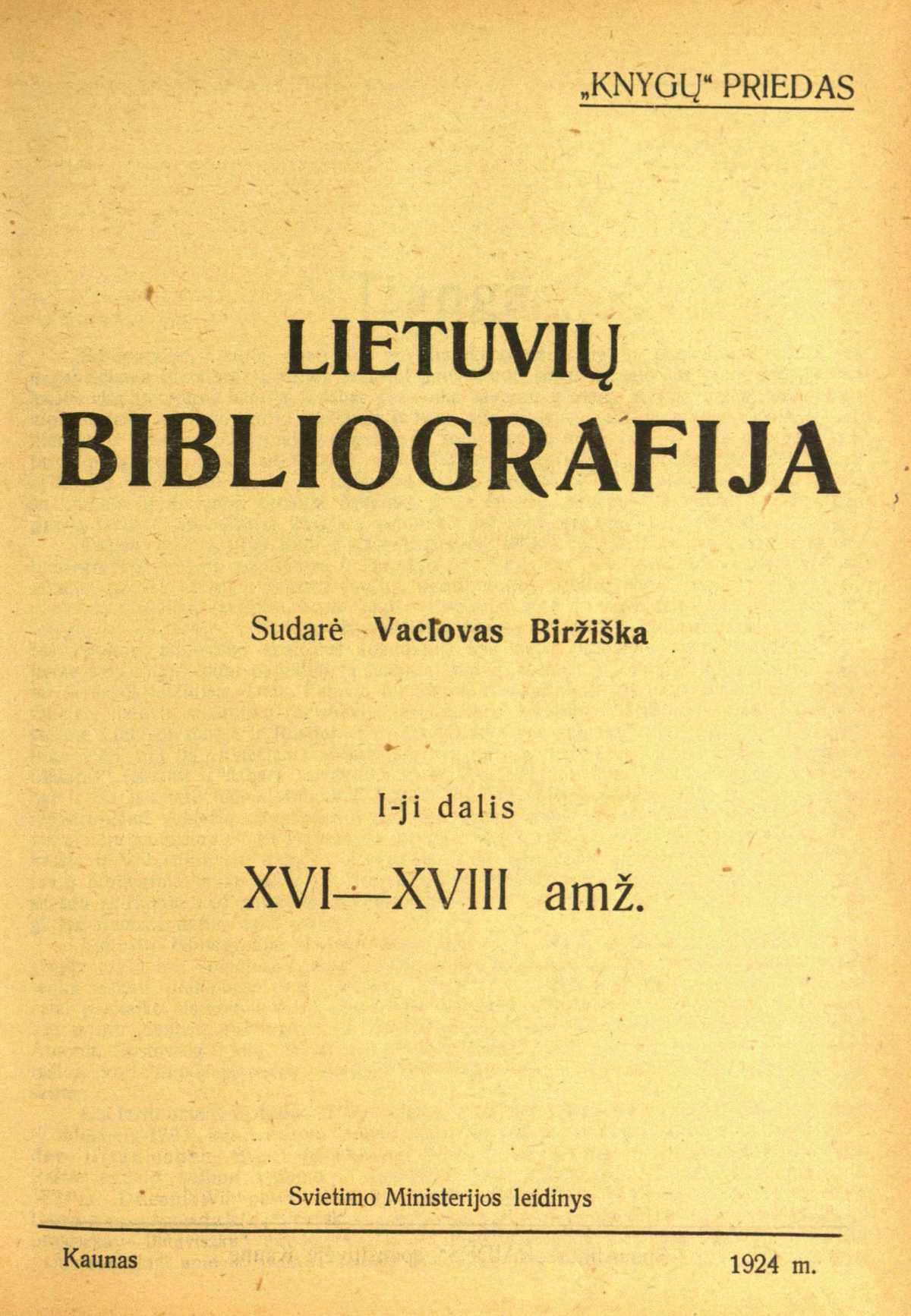 | Antraštė | Lietuvių bibliografija. D. 1: XVI–XVIII amž. / sudarė Vaclovas Biržiška – Kaunas: Švietimo ministerijos leidinys, 1924. – VI, 1–104, LVI sklt. [lt] |