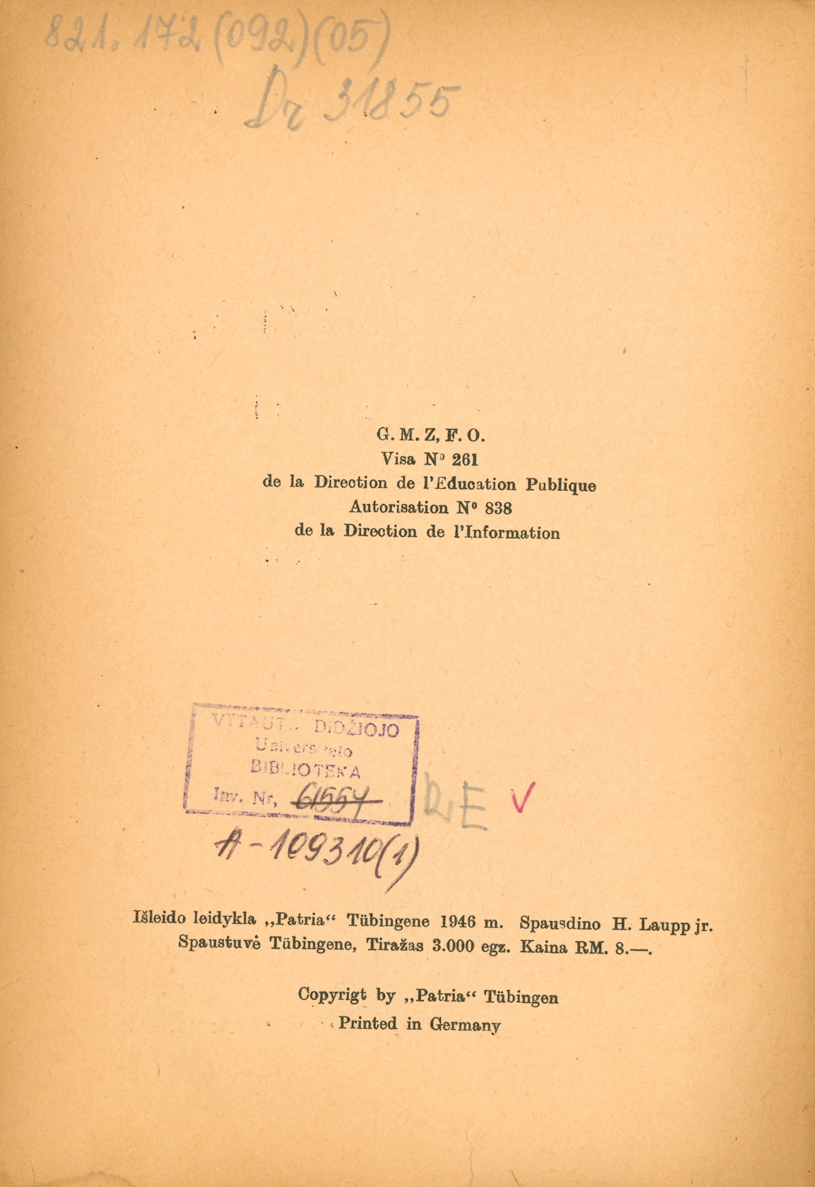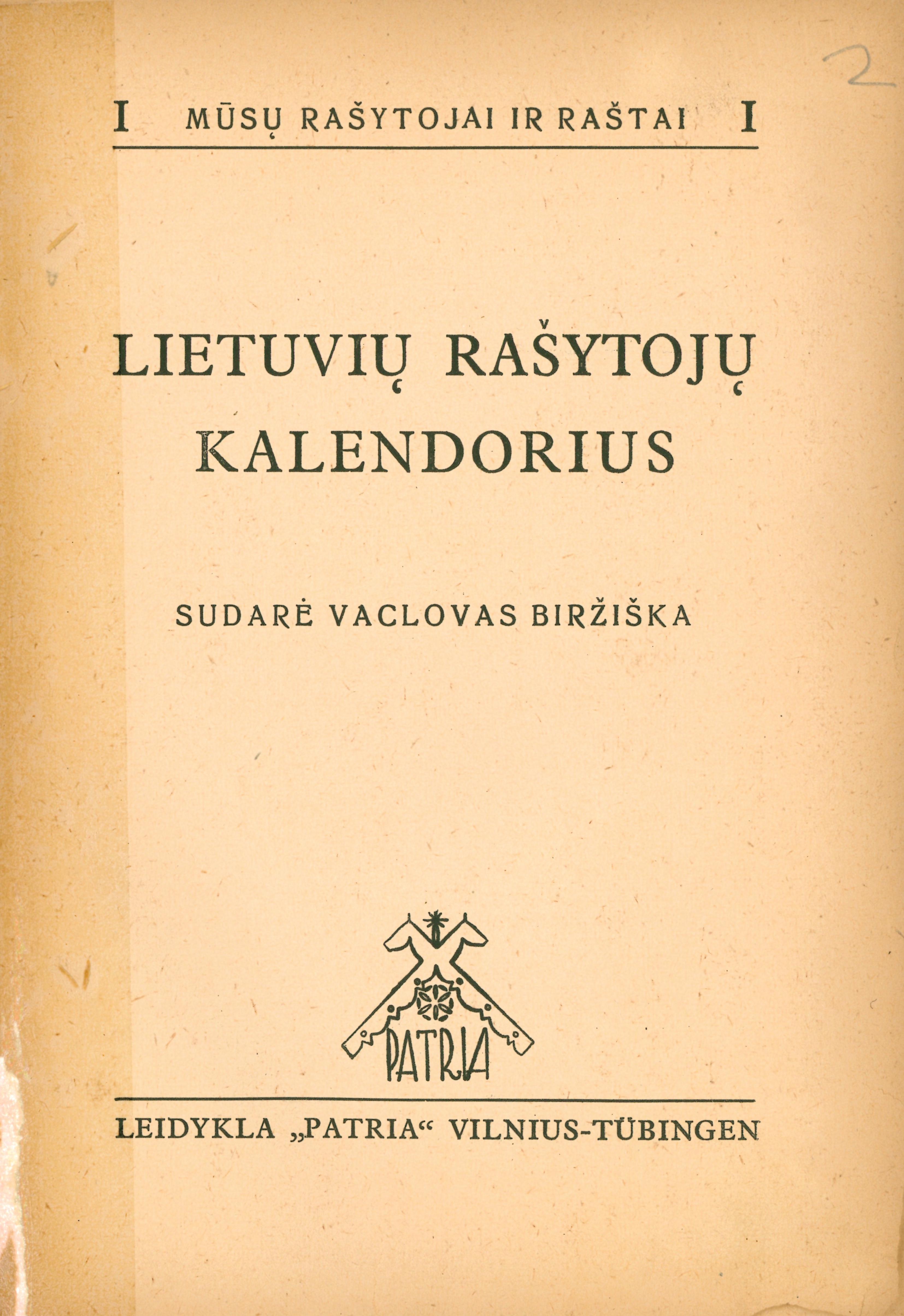 Lietuvių rašytojų kalendorius / sudarė Vaclovas Biržiška. -- Vilnius ; Tübingen : Patria, 1946. – 263 p. – (Mūsų rašytojai ir raštai ; 1)