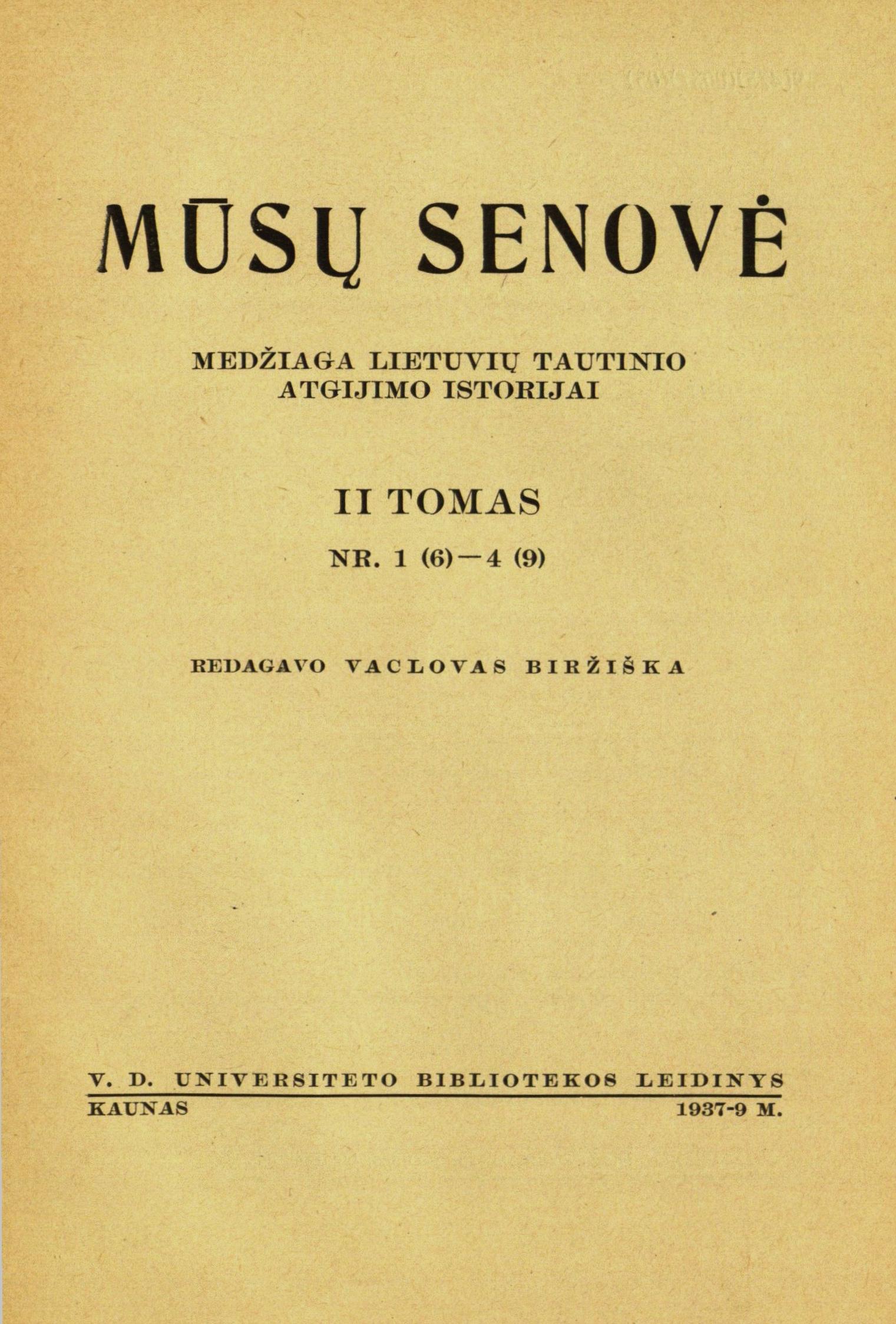 Mūsų senovė / redagavo Vaclovas Biržiška. – T. 2, Nr. 1(6)-4(9), 1937-1939. – Su V. Biržiškos straipsniais ir vertimais.