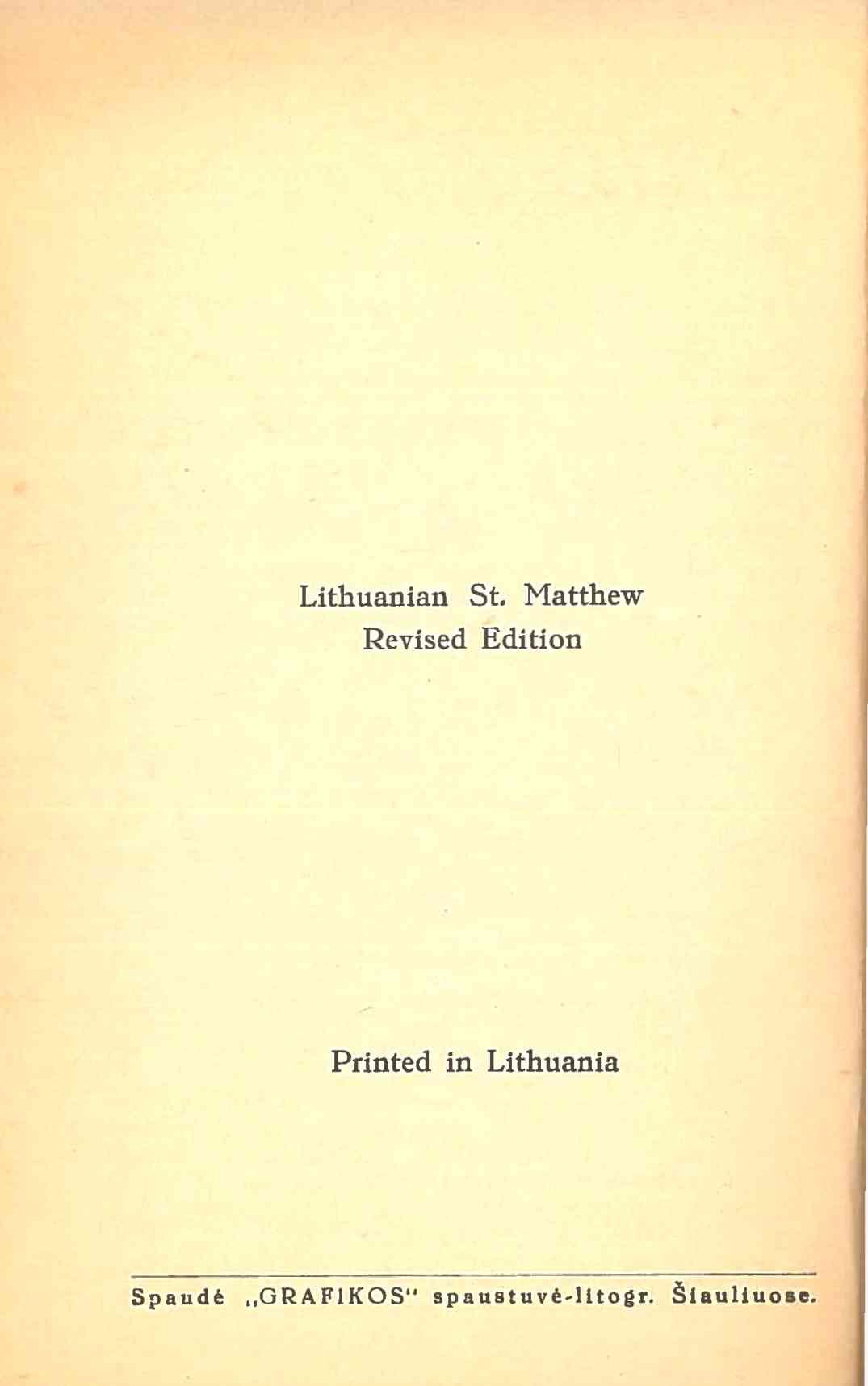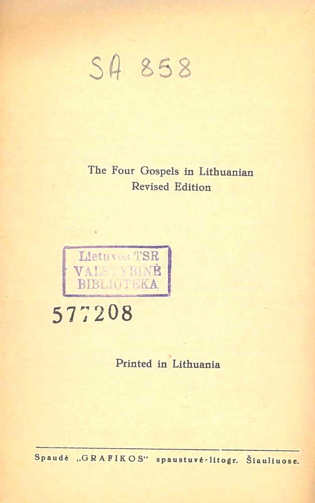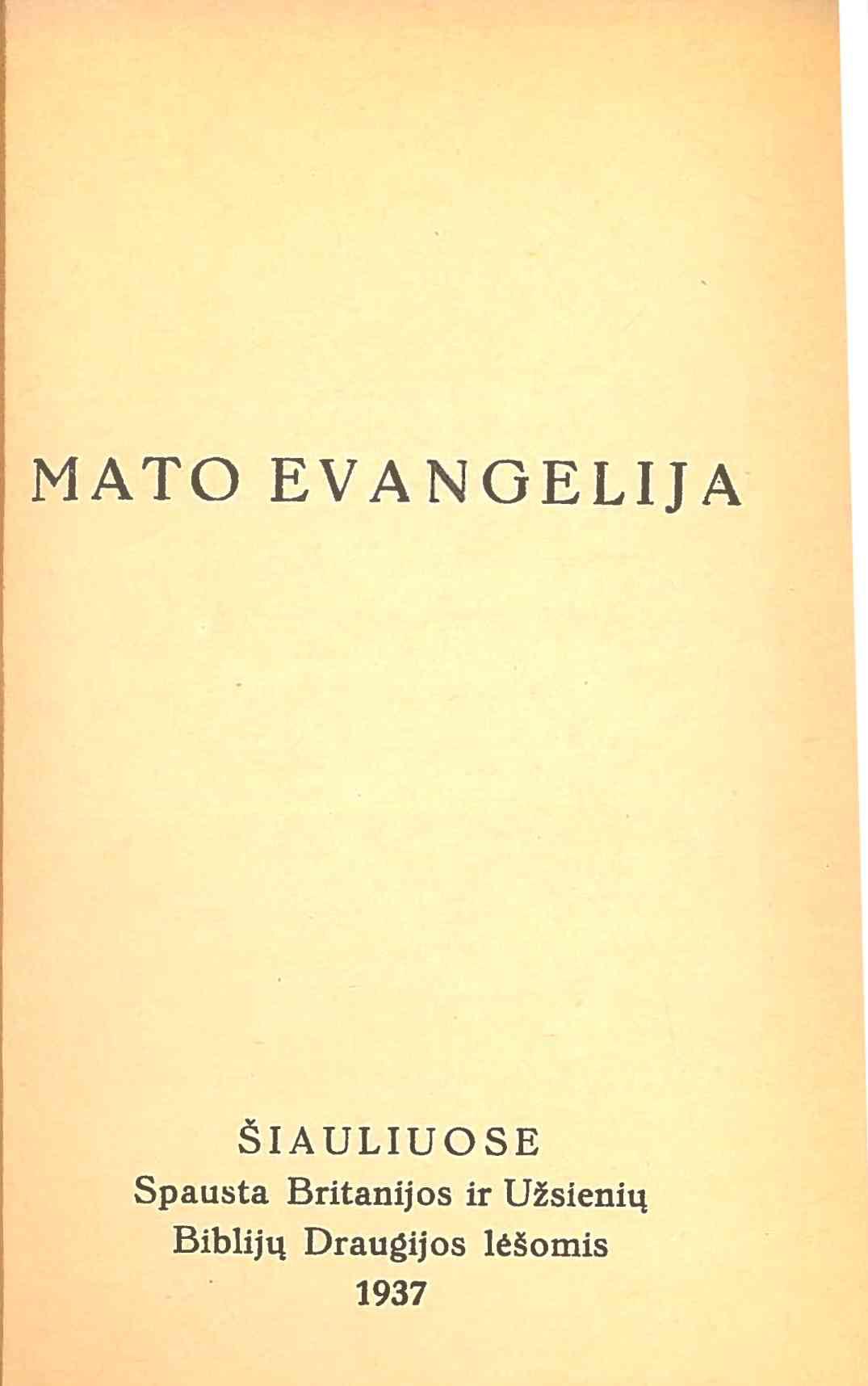 | Antraštė | Mato, Morkaus, Luko ir Jono evangelijos / [vertė Povilas Jakubėnas ir Adomas Šernas]. – Šiauliuose: spausta Britanijos ir Užsienio Biblijų draugijos lėšomis, 1937. – 63, 39, 64, 51 p. [lt] |