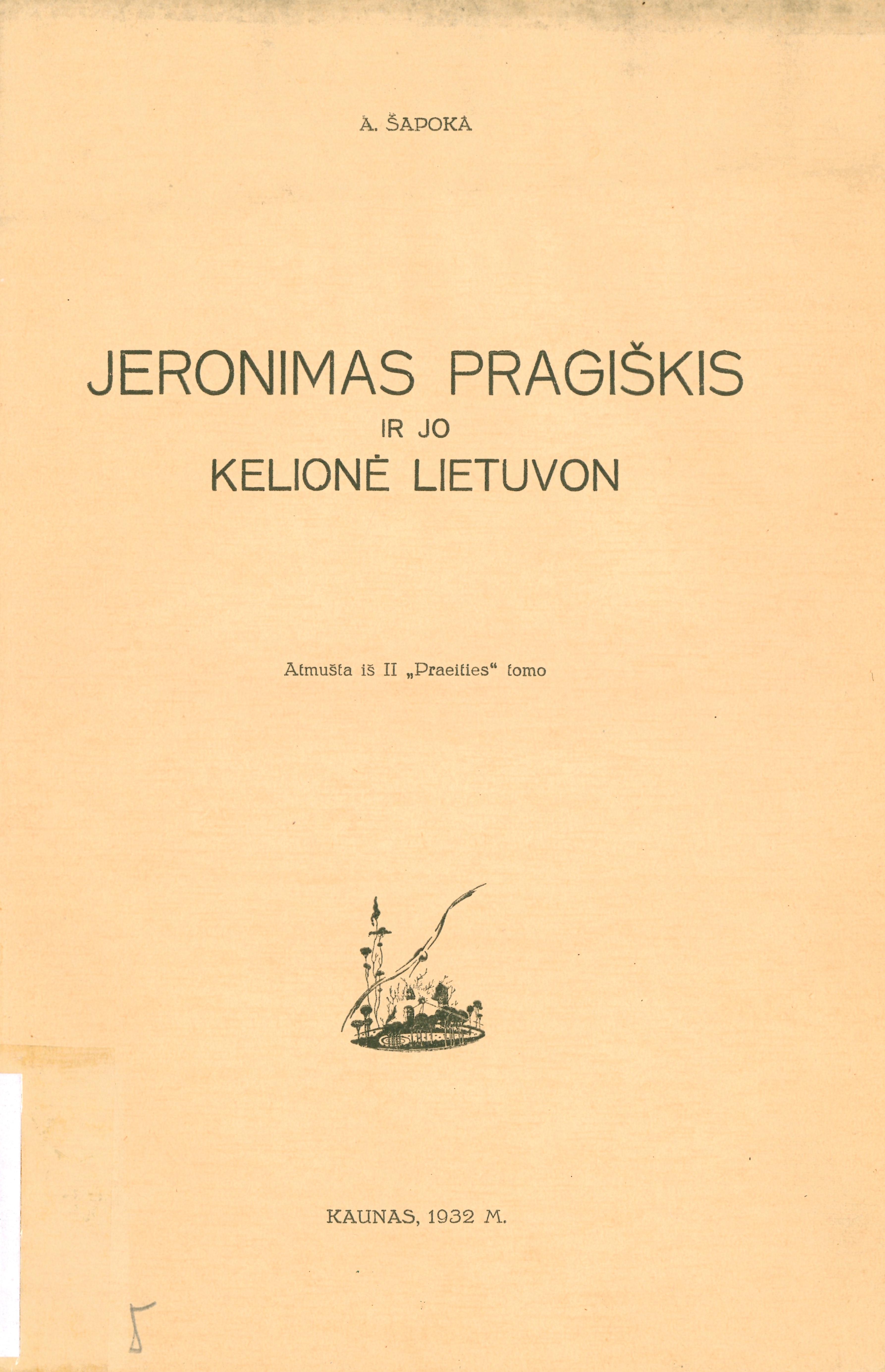 | Antraštė | Jeronimas Pragiškis ir jo kelionė Lietuvon / A. Šapoka. In: Praeitis. T. 2 (1933), p. 252–290 [lt] |
