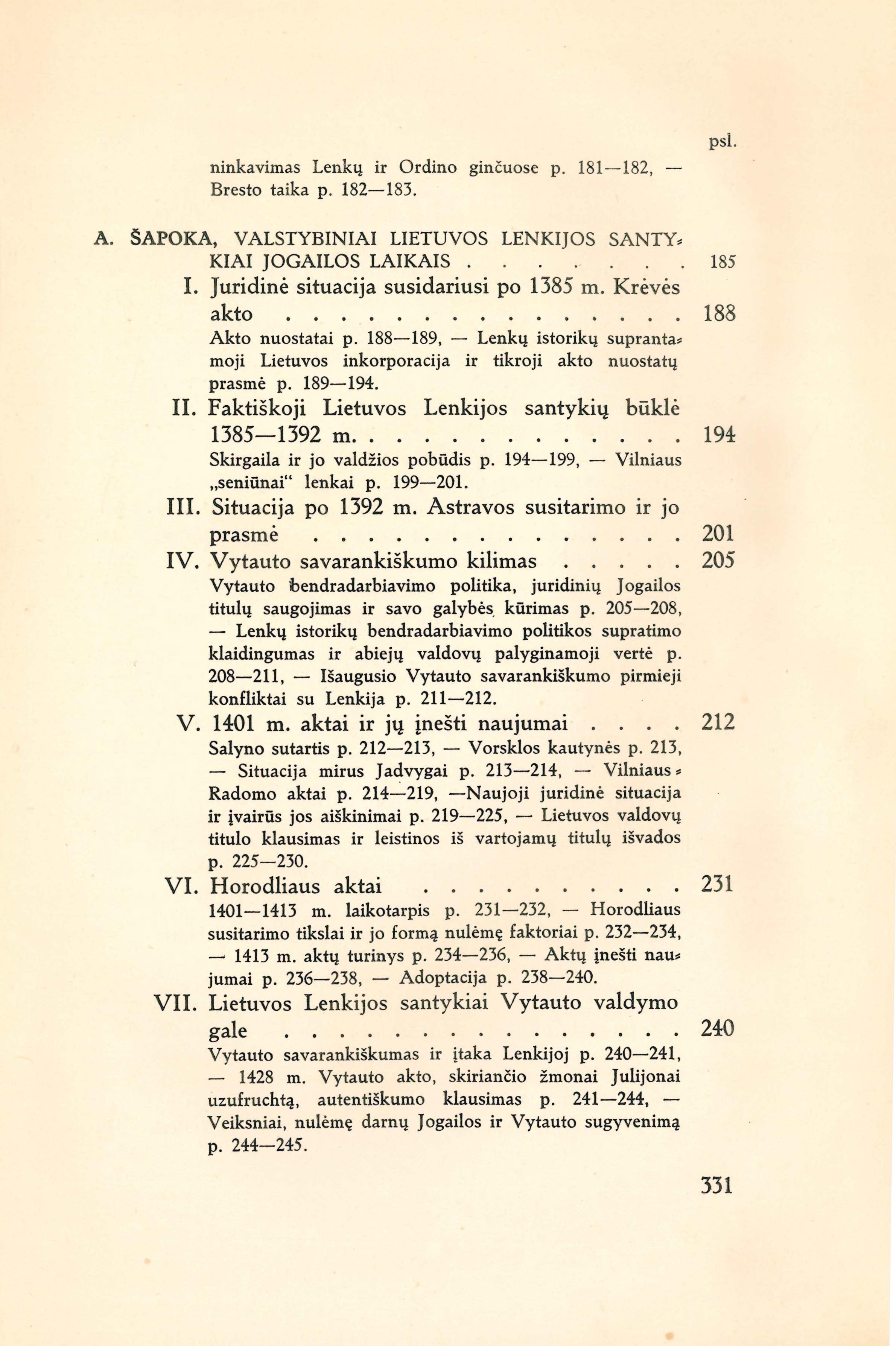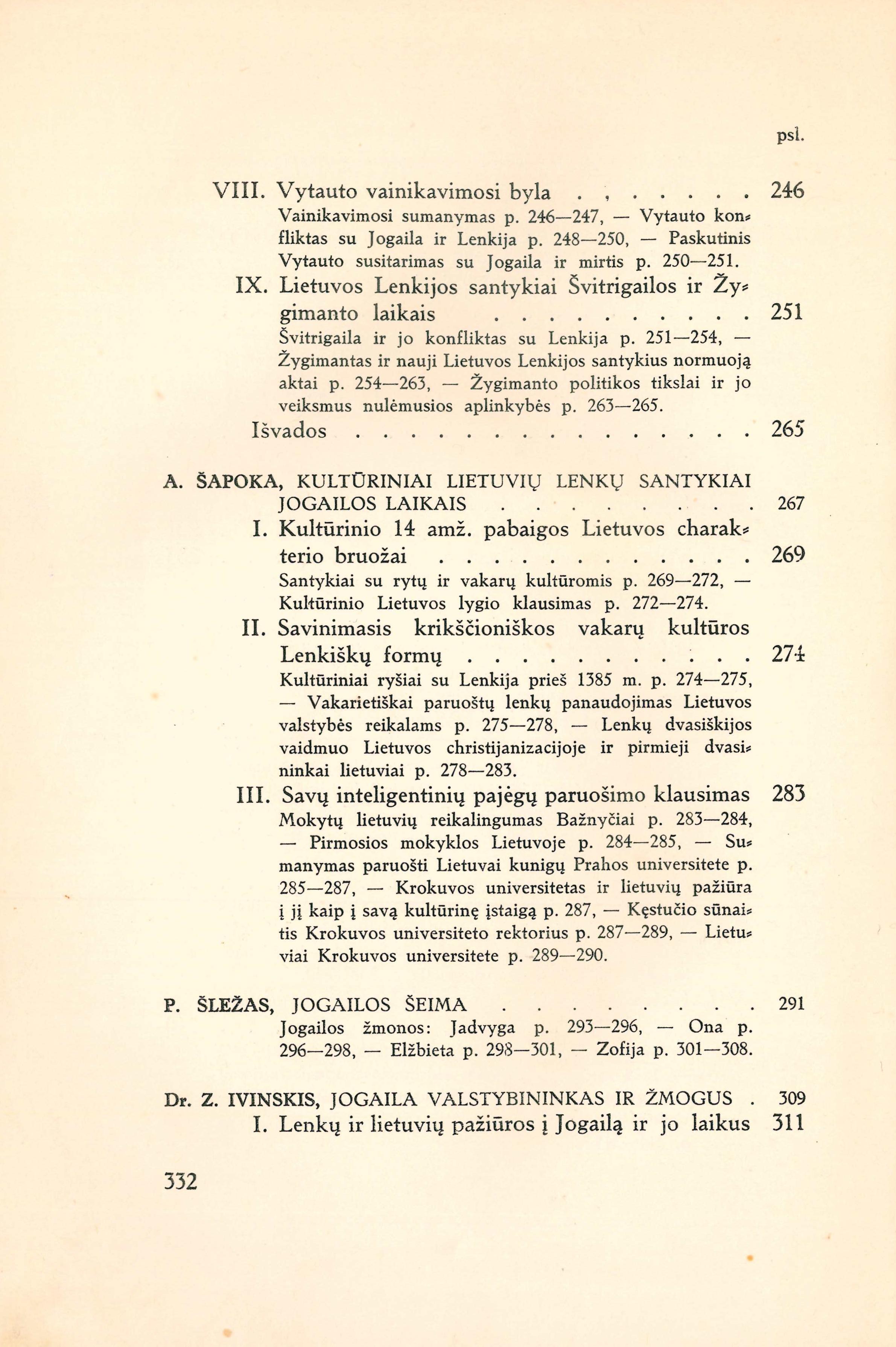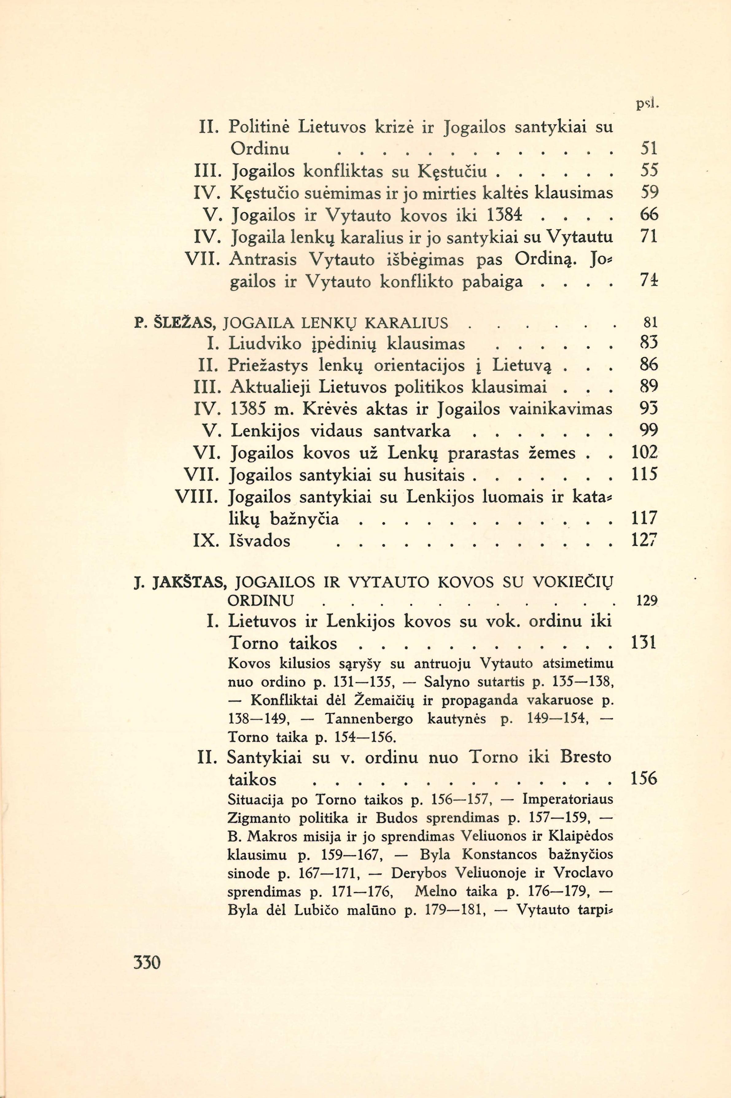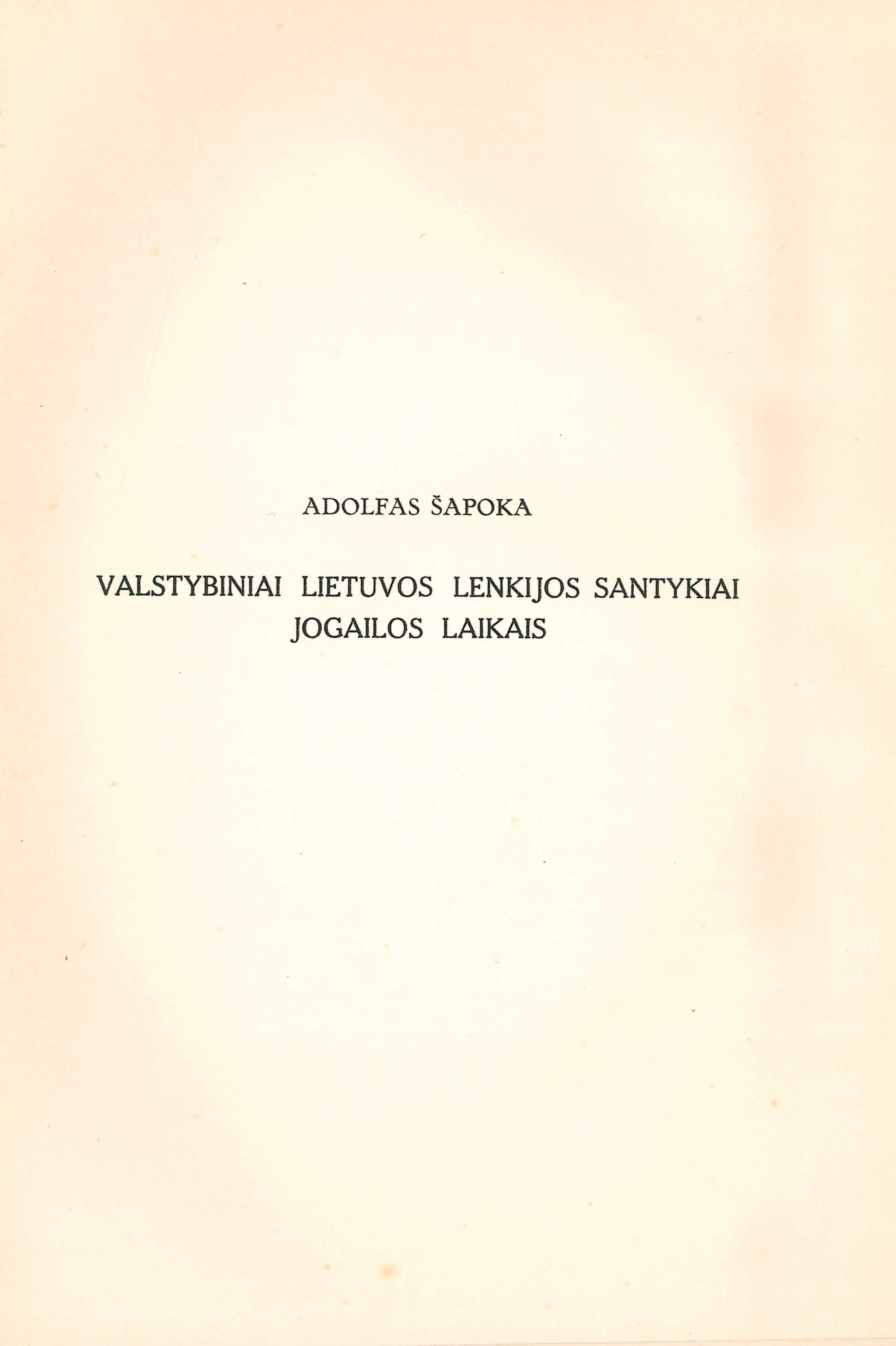 Jogaila / redagavo A. Šapoka. – Kaunas: Švietimo ministerijos Knygų leidimo komisija, 1935. – 333 p. Turinys: Šapoka Adolfas. Pratarmė (p. 7-10); Sužiedėlis Simas. Lietuva ir Gediminaičiai sėdant Jogailai į Didžiojo kunigaikščio sostą (p. 12-44); Ivinskis Zenonas. Jogailos santykiai su Kęstučiu ir Vytautu iki 1392 metų (p. 46-79); Šležas Paulius. Jogaila Lenkų karalius (p. 82-128); Jakštas Juozas. Jogailos ir Vytauto kovos su Vokiečių ordinu (p. 130-183); Šapoka Adolfas. Valstybiniai Lietuvos Lenkijos santykiai Jogailos laikais (p. 186-266); Šapoka Adolfas. Kultūriniai lietuvių lenkų santykiai Jogailos laikais (p. 269-290); Šležas Paulius. Jogailos šeima (p. 292-308); Ivinskis Zenonas. Jogaila valstybininkas ir žmogus (p. 310-328). [lt]