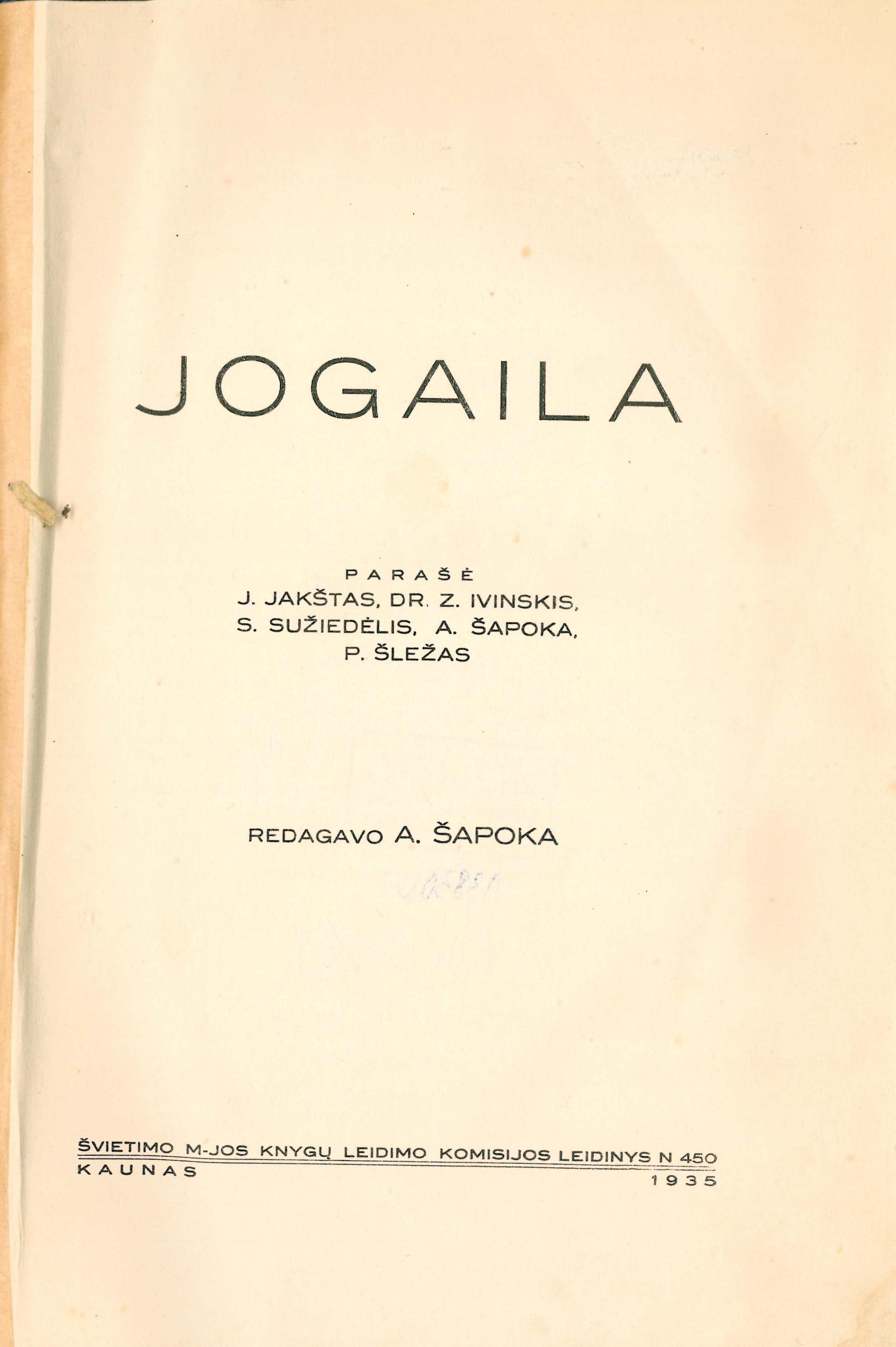 Antraštė Jogaila / redagavo A. Šapoka. – Kaunas: Švietimo ministerijos Knygų leidimo komisija, 1935. – 333 p. (Švietimo ministerijos Knygų leidimo komisijos leidinys, nr. 450). [lt]