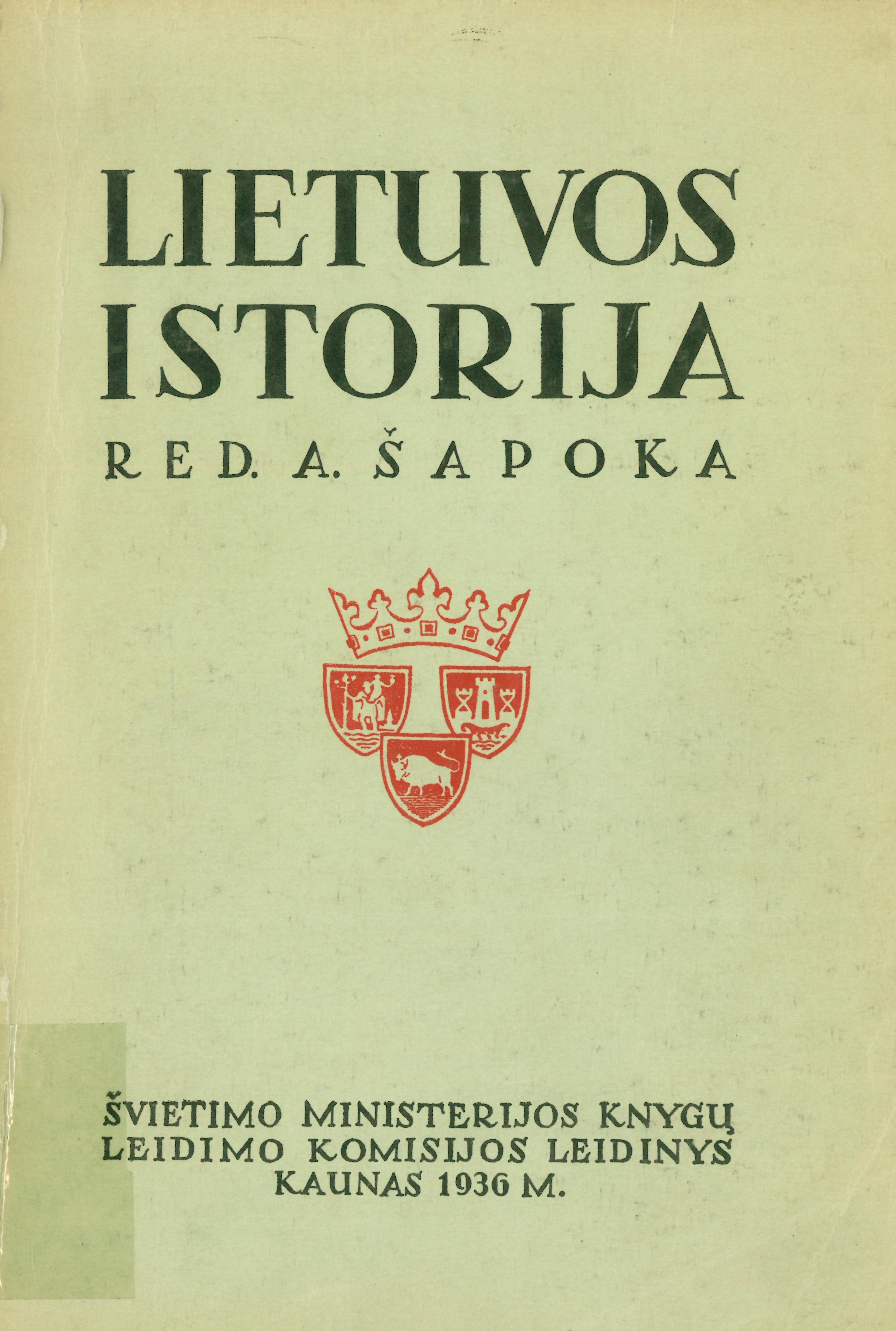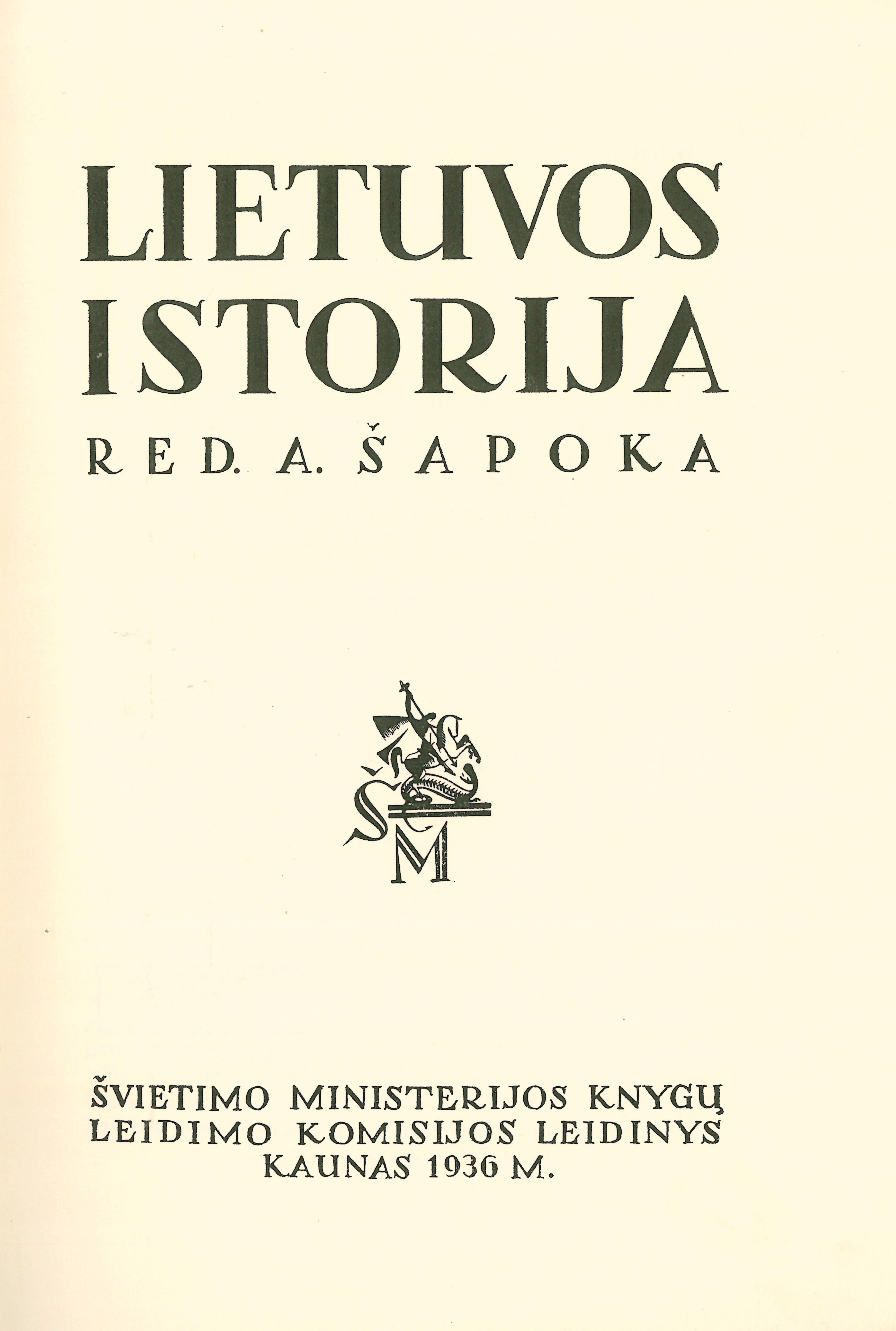 Lietuvos istorija / red. A. Šapoka. – Kaunas: Švietimo ministerijos Knygų leidimo komisija, 1936. – XVI, 688, [14] p. (Knygų leidimo komisijos leidinys, nr. 479)