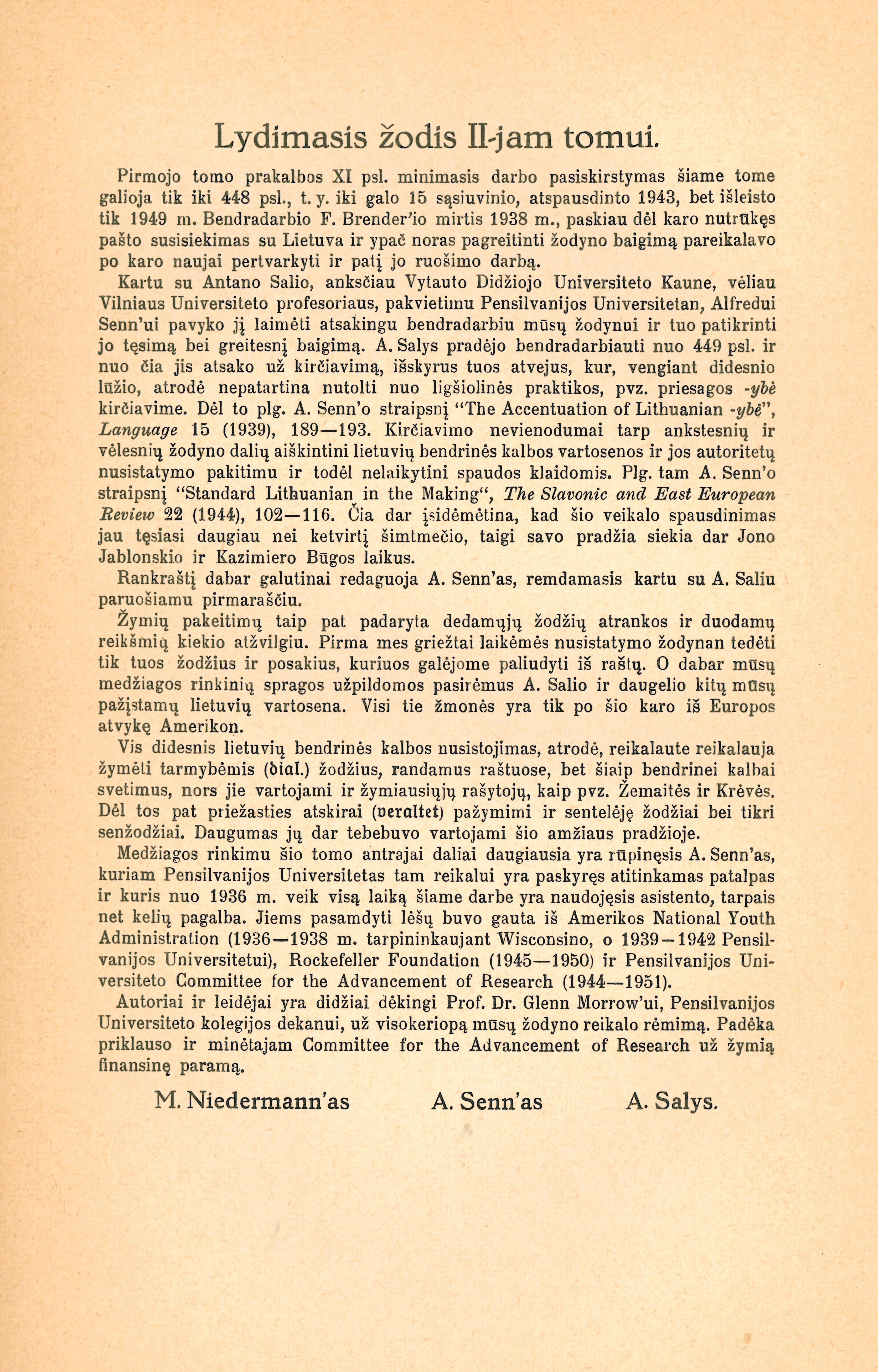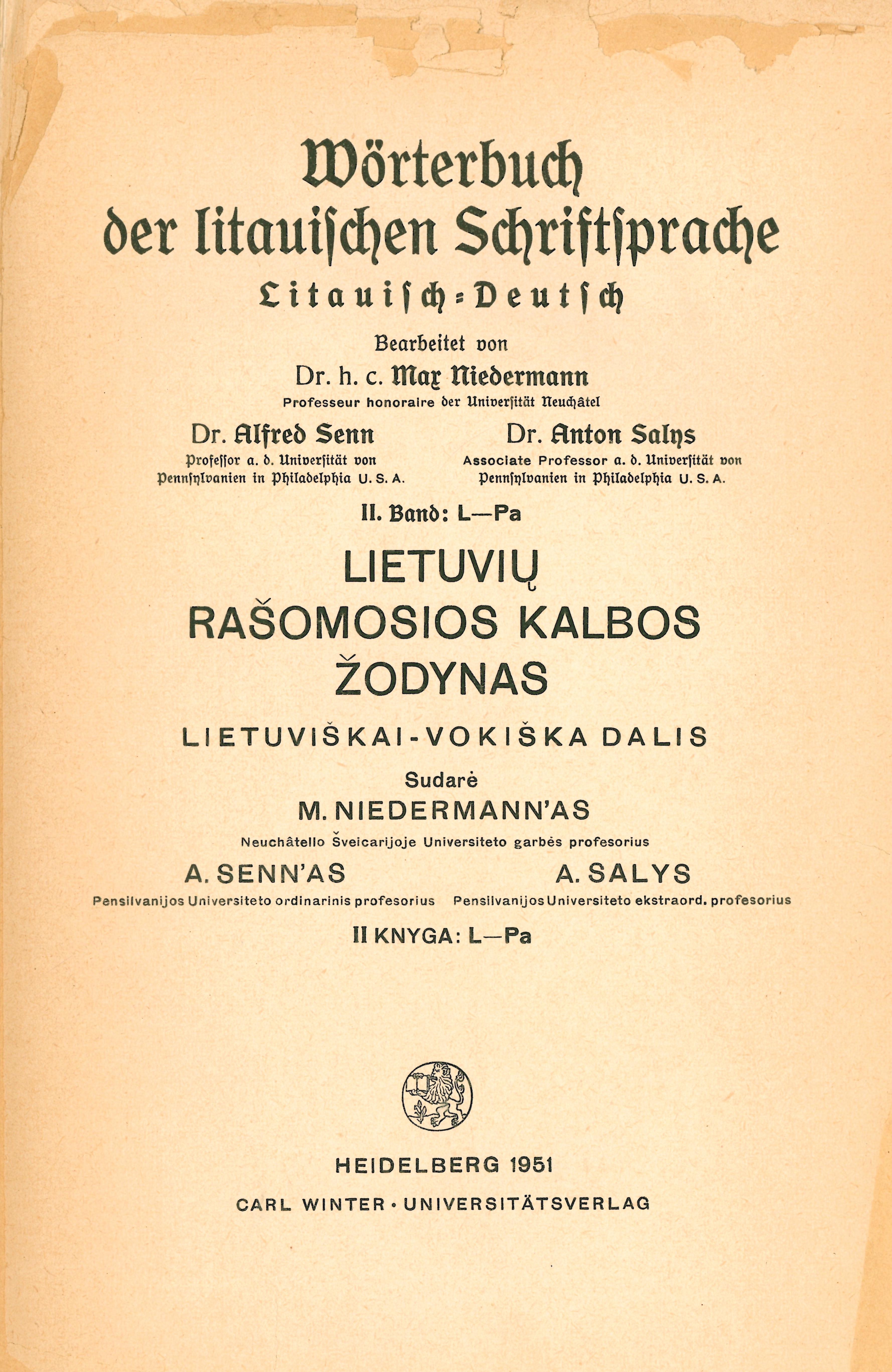 | Antraštė | Wörterbuch der litauischen Schriftsprache: Litauisch–Deutsch = Lietuvių rašomosios kalbos žodynas: lietuviškai–vokiška dalis. Bd. 2: L–Pa / bearbeitet von Max Niedermann, Alfred Senn, Anton Salys. – Heidelberg: Carl Winters Universitätsverlag, 1951. – [4], 729 p. [lt] |