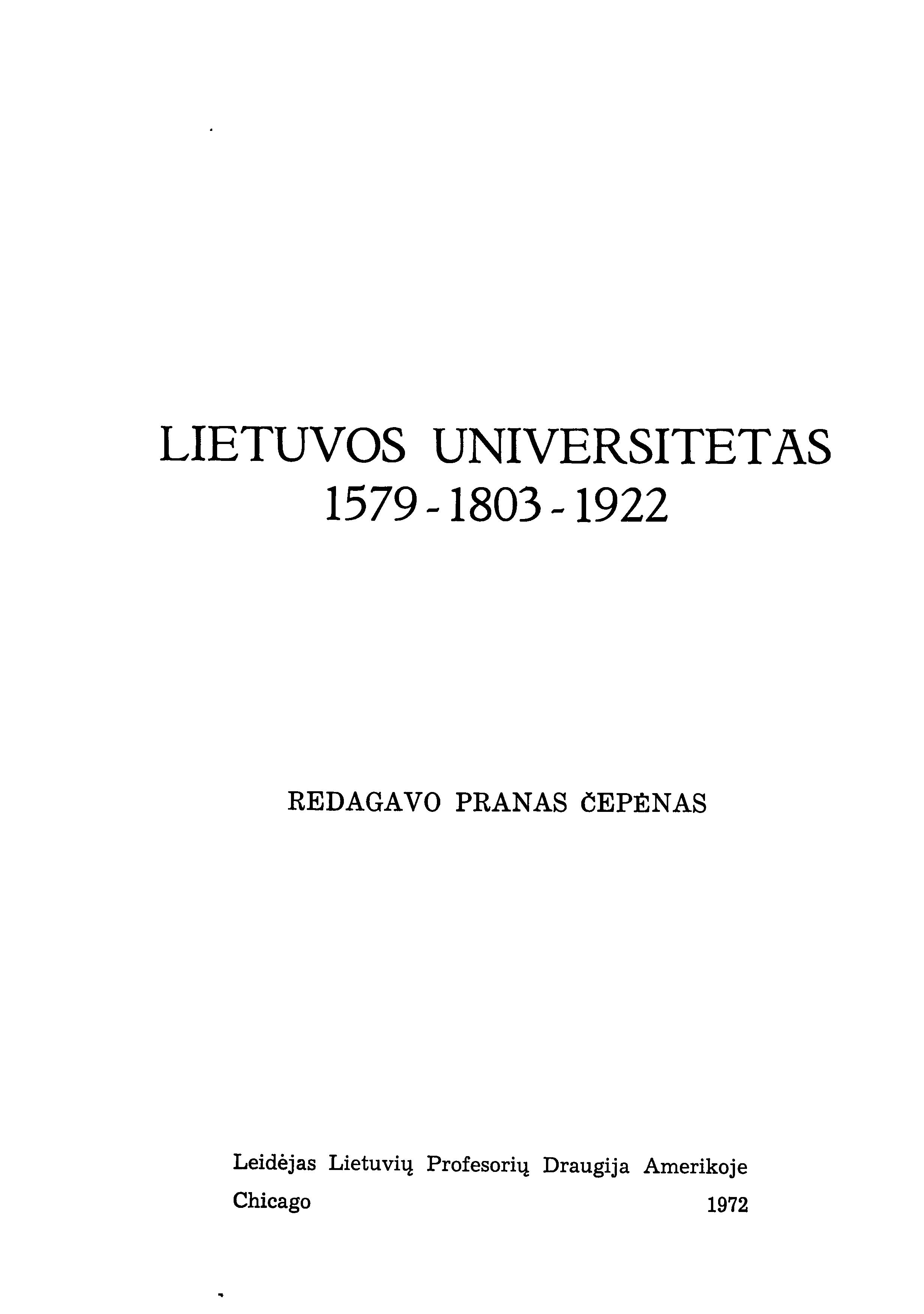 | Yra dalis | Lietuvos universitetas, 1579–1803–1922. – Chicago: Lietuvių profesorių draugija Amerikoje, 1972 |