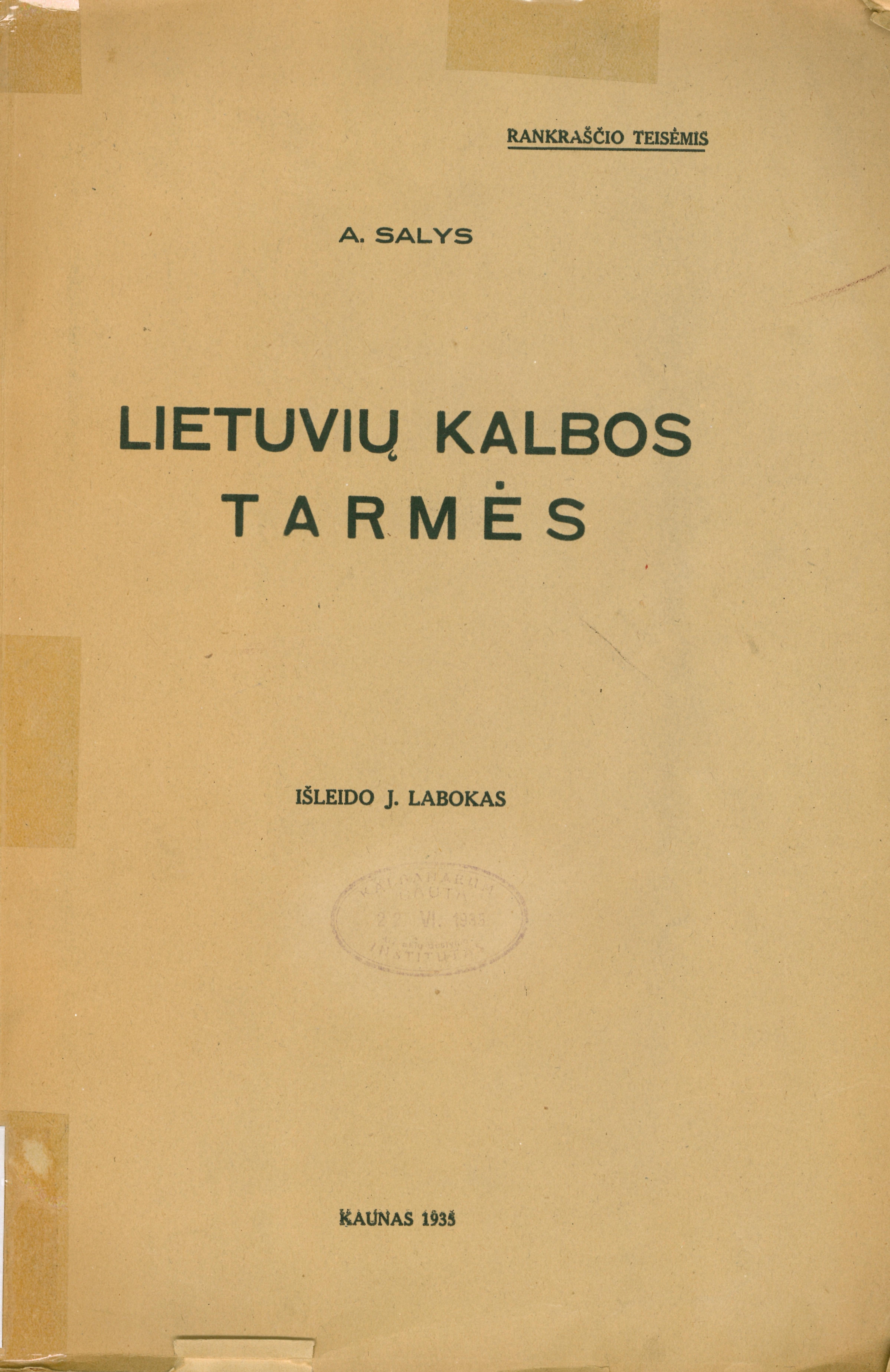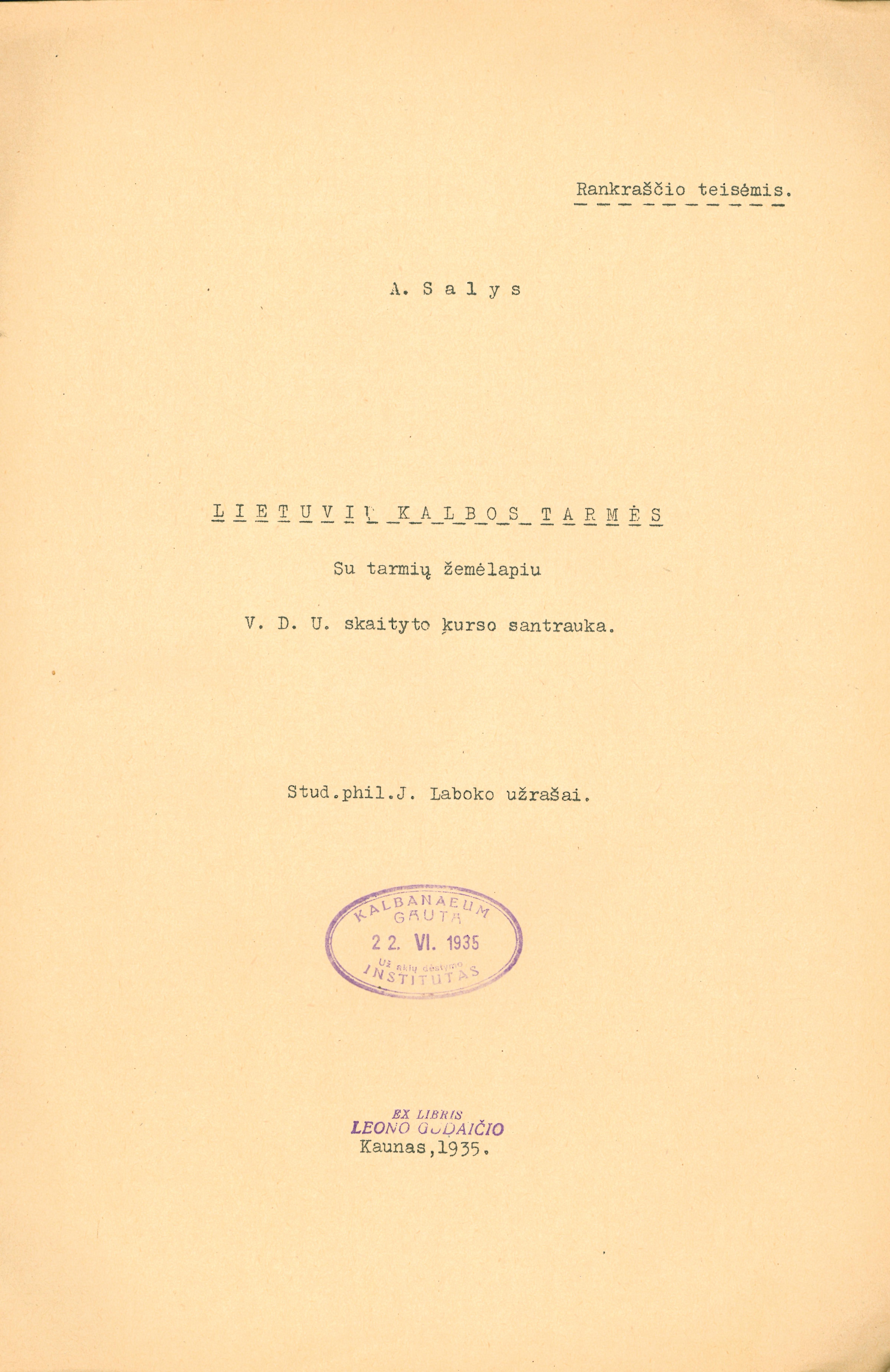 Lietuvių kalbos tarmės : su tarmių žemėlapiu : V.D.U. skaityto kurso santrauka / A. Salys. – Kaunas : J. Labokas, 1935. – 87 p., 1 sulankst. žml. lap. : iliustr. – Rankraščio teisėmis. – J. Laboko užrašai, mašinraščio tekstas.