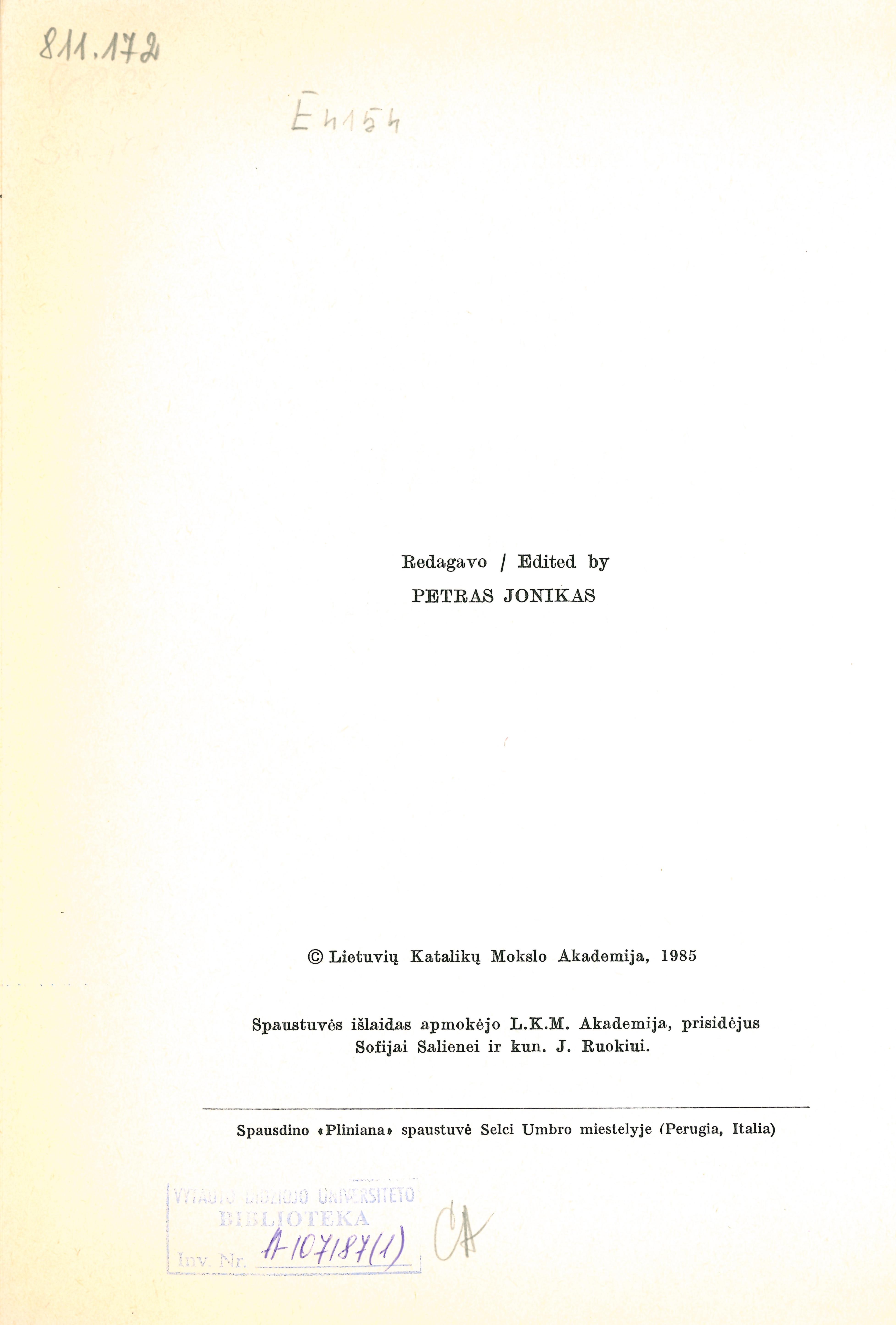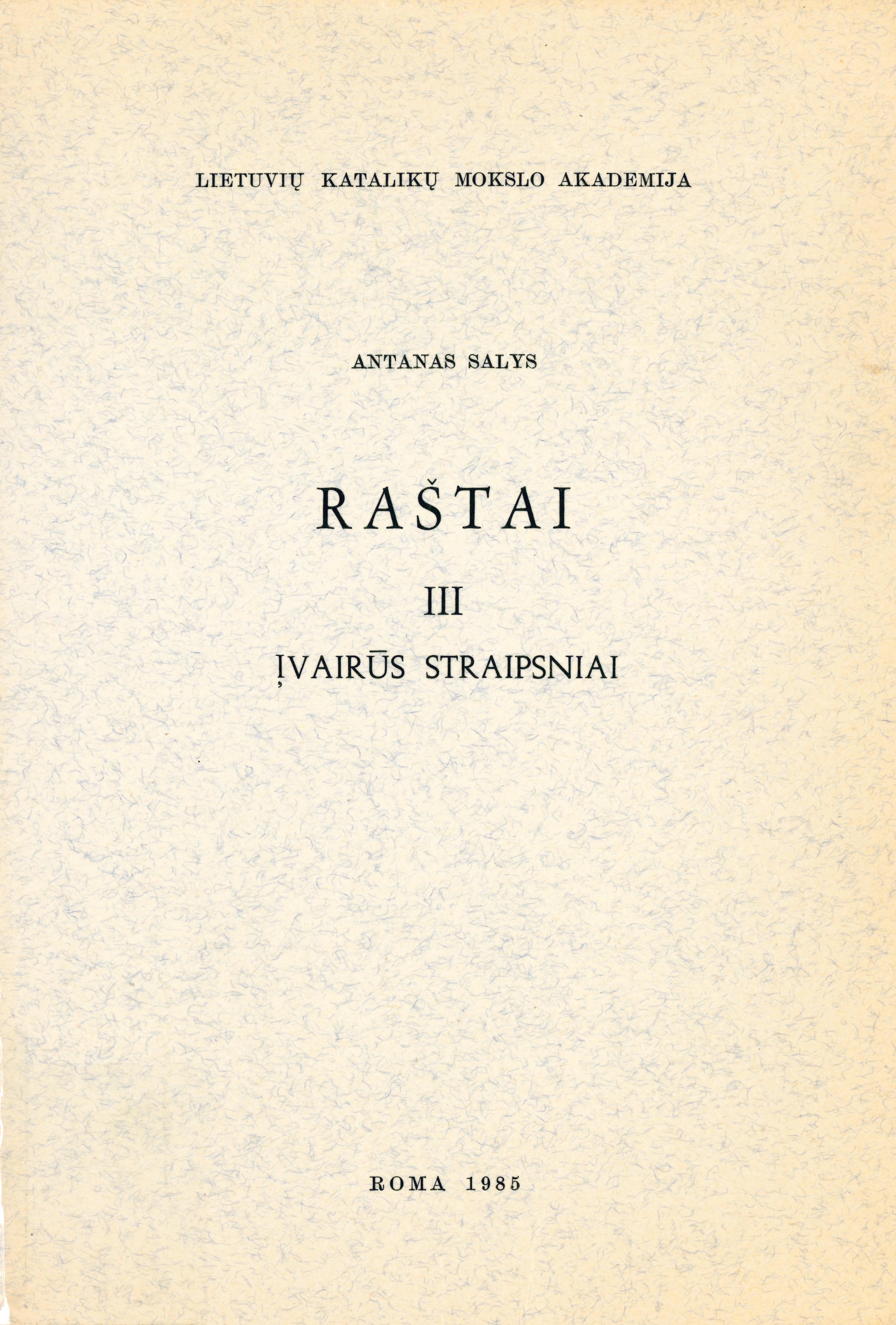 | Antraštė | Raštai. T. 3: Įvairūs straipsniai / Antanas Salys; redagavo Petras Jonikas. – Roma: Lietuvių katalikų mokslo akademija, 1985. – XIX, 545 p. [lt] |