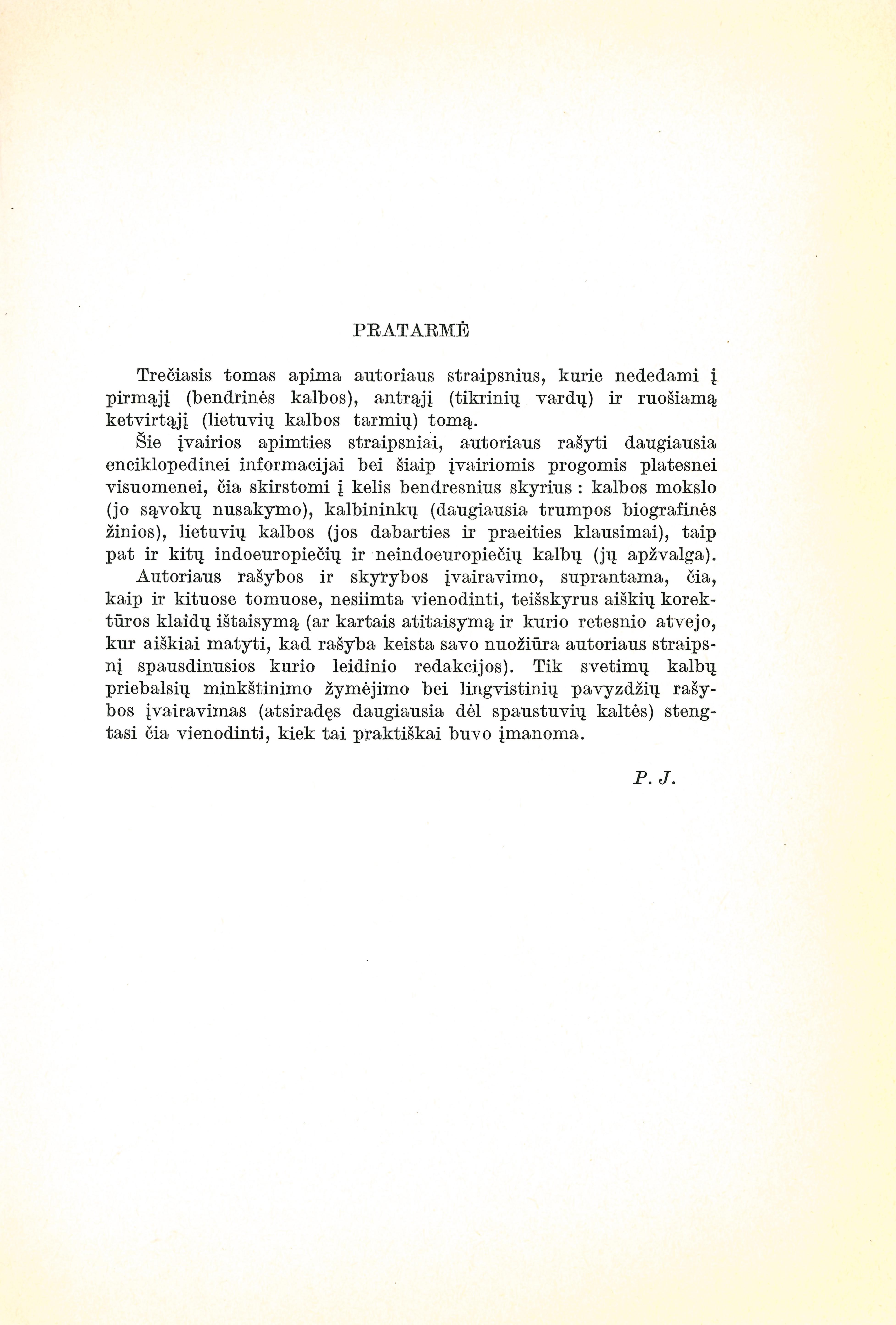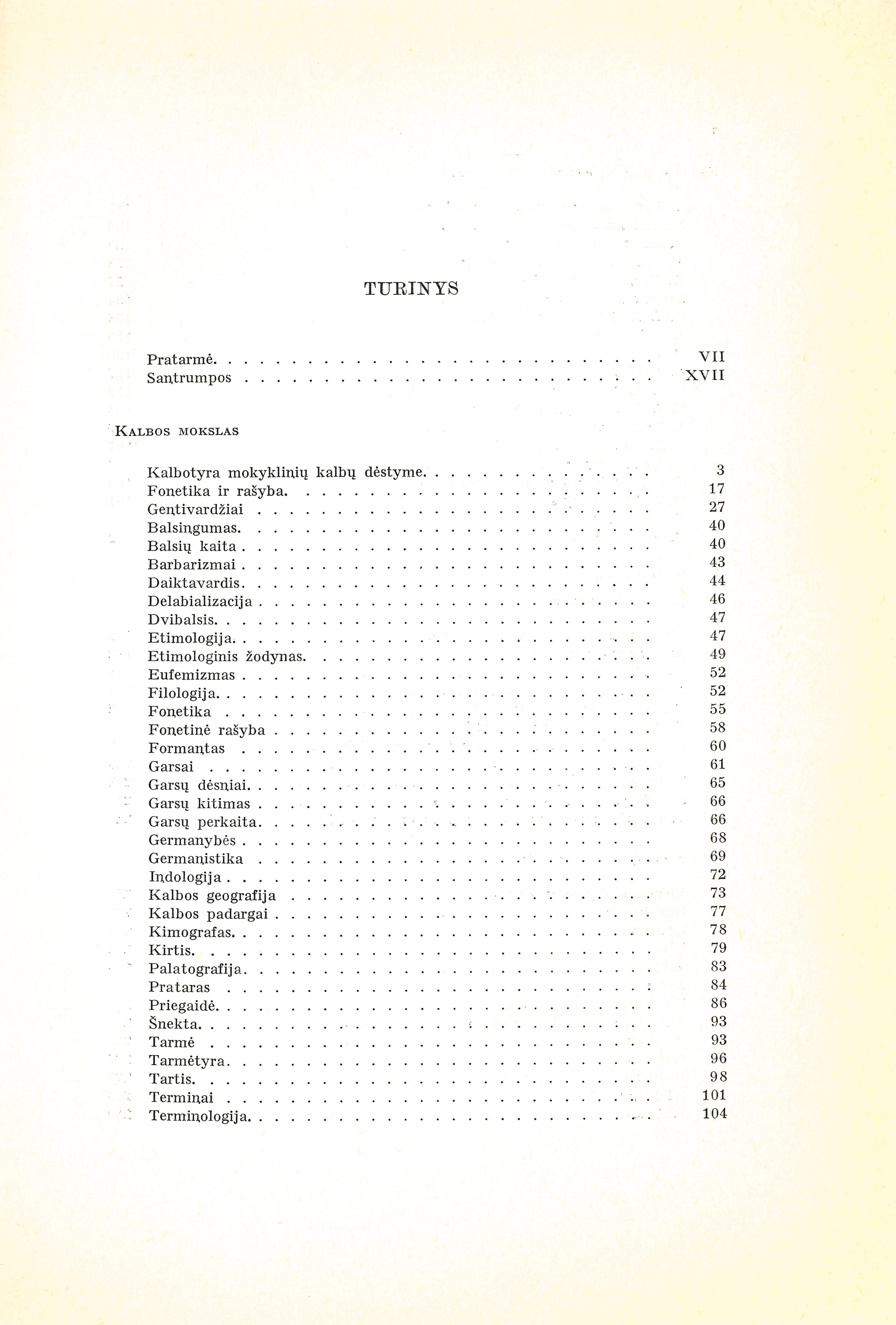 | Turinys: Kalbotyra mokyklinių kalbų dėstyme (1936); Fonetika ir rašyba (1930); Kalbos mokslo terminai Lietuvių enciklopedijoje (1954-1966); A. Baranauskas kalbos darbininkas (1935); Kazimieras Jaunius (1933); A. Jakštas kalbos darbininkas (1936); A. a. A. Dambrauskas-Jakštas (1938); K. Būgos darbo kelias (1934); Didysis kalbininkas [Būga] (1934); Prof. K. Būgos rašto palikimas (1925); Prof. A. Meillet ir jo santykiai su Lietuva (1936); Užsienio kalbininkai Lietuvių enciklopedijoje (1957-1965); Lietuvių kalba savo giminių tarpe (1935); An Ancient Language (1950); Žemaičių vardas ir ribos (1967); Aukštaičiai (1953); Martyno Mažvydo raštų kalba (1973); Kretingos vienuolyno lietuviškieji rankraščiai (1927); Kalbininkui po A. Smetonos raštus apsižvalgius (1931); Smetona mus rašto moko (1931); Žodynas (1966); 300 Ways to Say «Dear Brother» (1951); The Lithuanian Vocative Singular in -ai (1952); Atskirų žodžių istorija Lietuvių enciklopedijoje (1955-1965); The Derivation of «Kalėdos»(1951); Recenzija: A. Senn, Kleine Litauische Sprachlehre (1929) (1930); Recenzija: R. Sereiskis, Lietuviškai-rusiškas žodynas (1933); Recenzija: J. Žilinskas, Lietuvių protėviai (1937); Įvairios kalbos ir baltų kiltys Lietuvių enciklopedijoje (1953-1966). [lt] | |