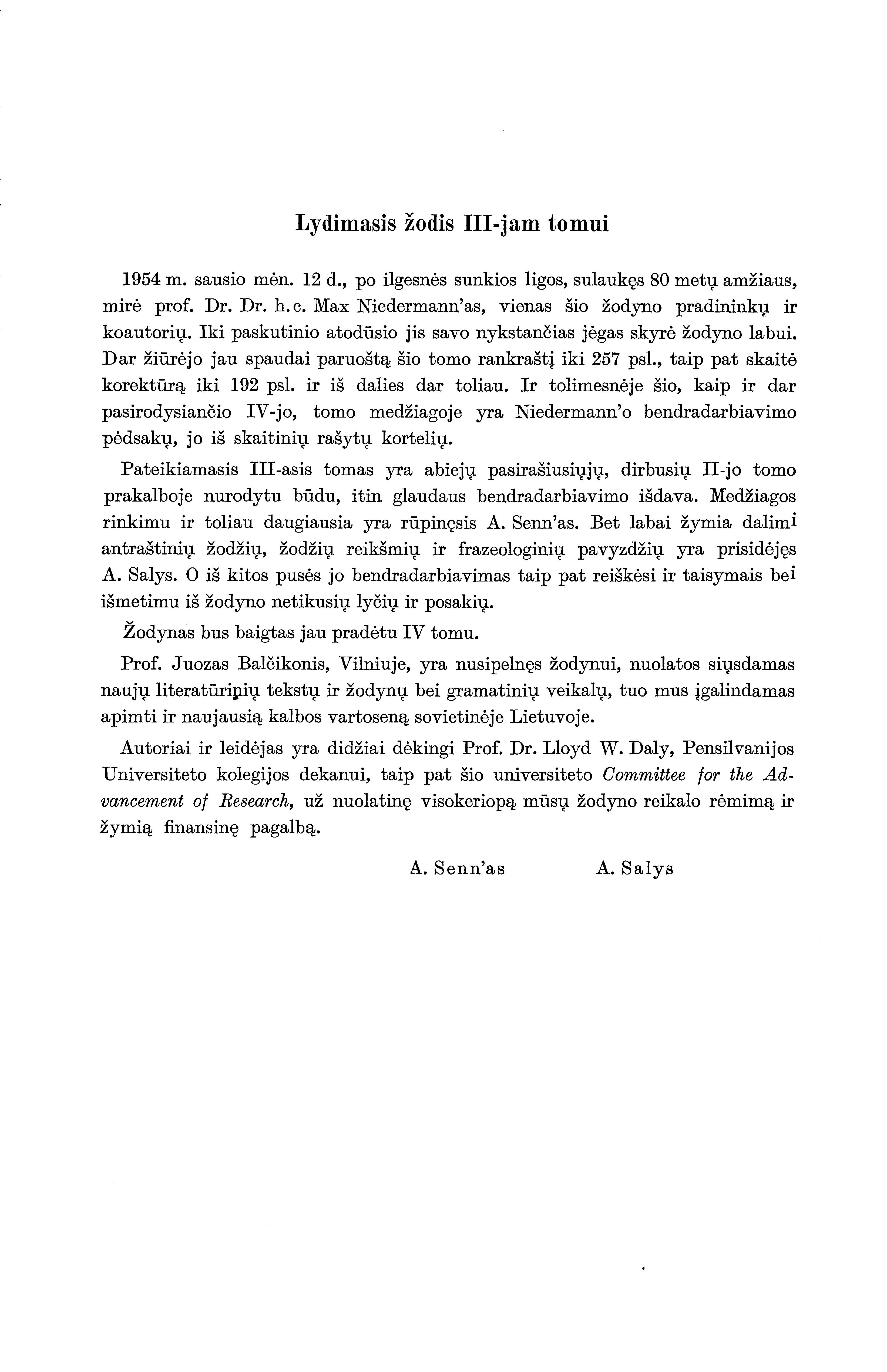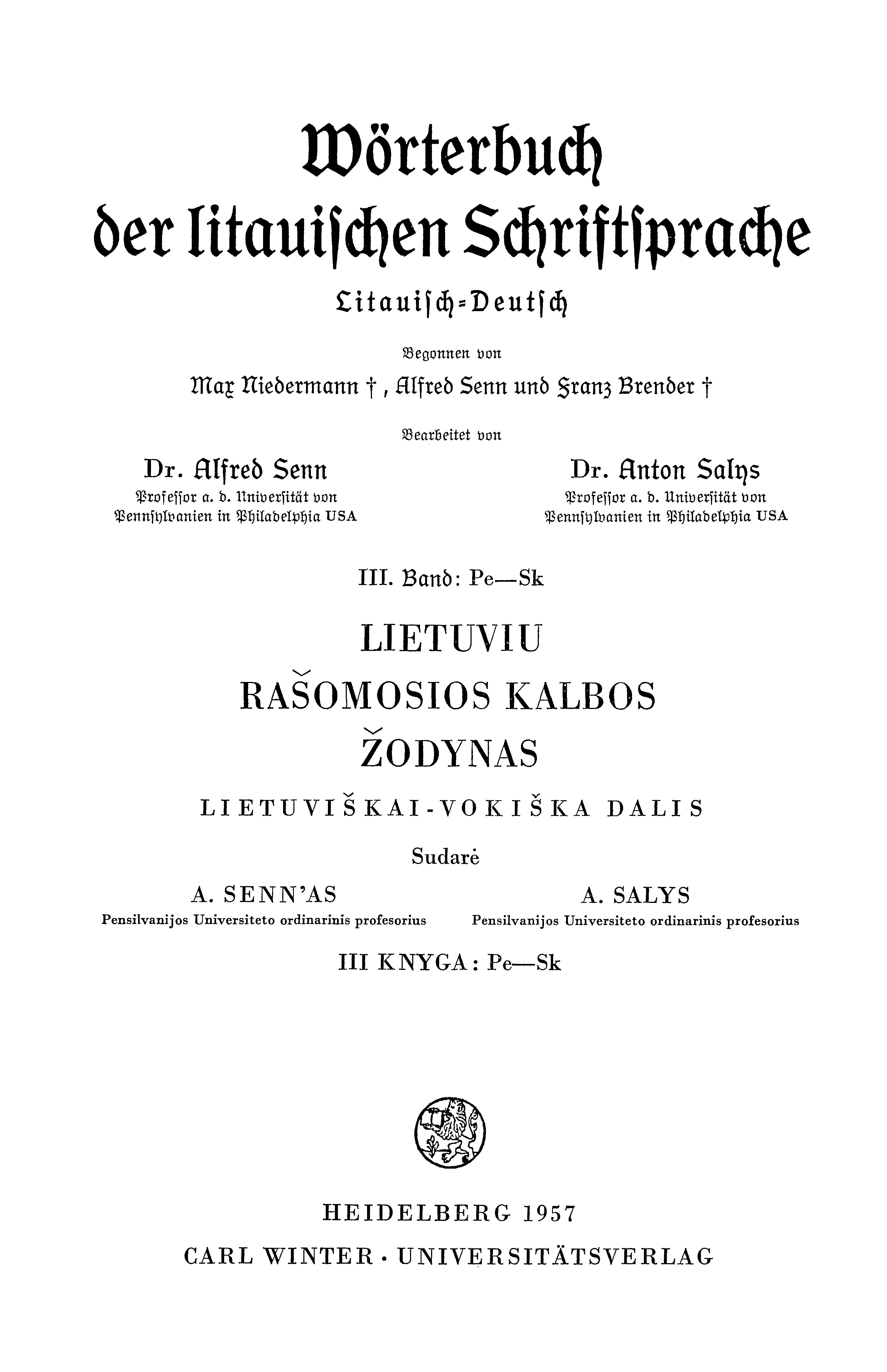 | Antraštė | Wörterbuch der litauischen Schriftsprache: Litauisch–Deutsch = Lietuvių rašomosios kalbos žodynas: lietuviškai–vokiška dalis. Bd. 3: Pe–Sk / bearbeitet von Alfred Senn, Anton Salys. – Heidelberg: Carl Winters Universitätsverlag, 1957. – [4], 718 p. [lt] |