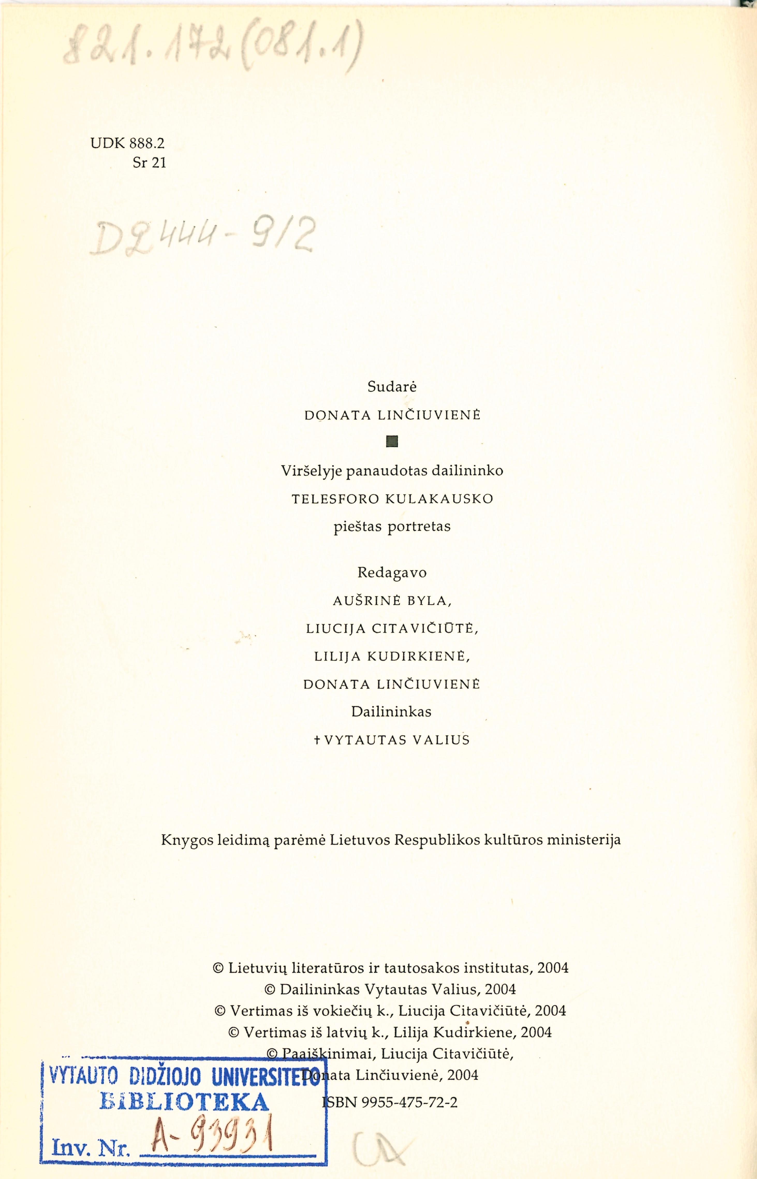 | Antraštė | Raštai. T. 9, Kn. 2: Tautosakos studijos kitomis kalbomis, 1924–1932 / Balys Sruoga; parengė Algis Samulionis ir Donata Linčiuvienė. – Vilnius: Lietuvių literatūros ir tautosakos institutas, 2004. – 494 p. [lt] |