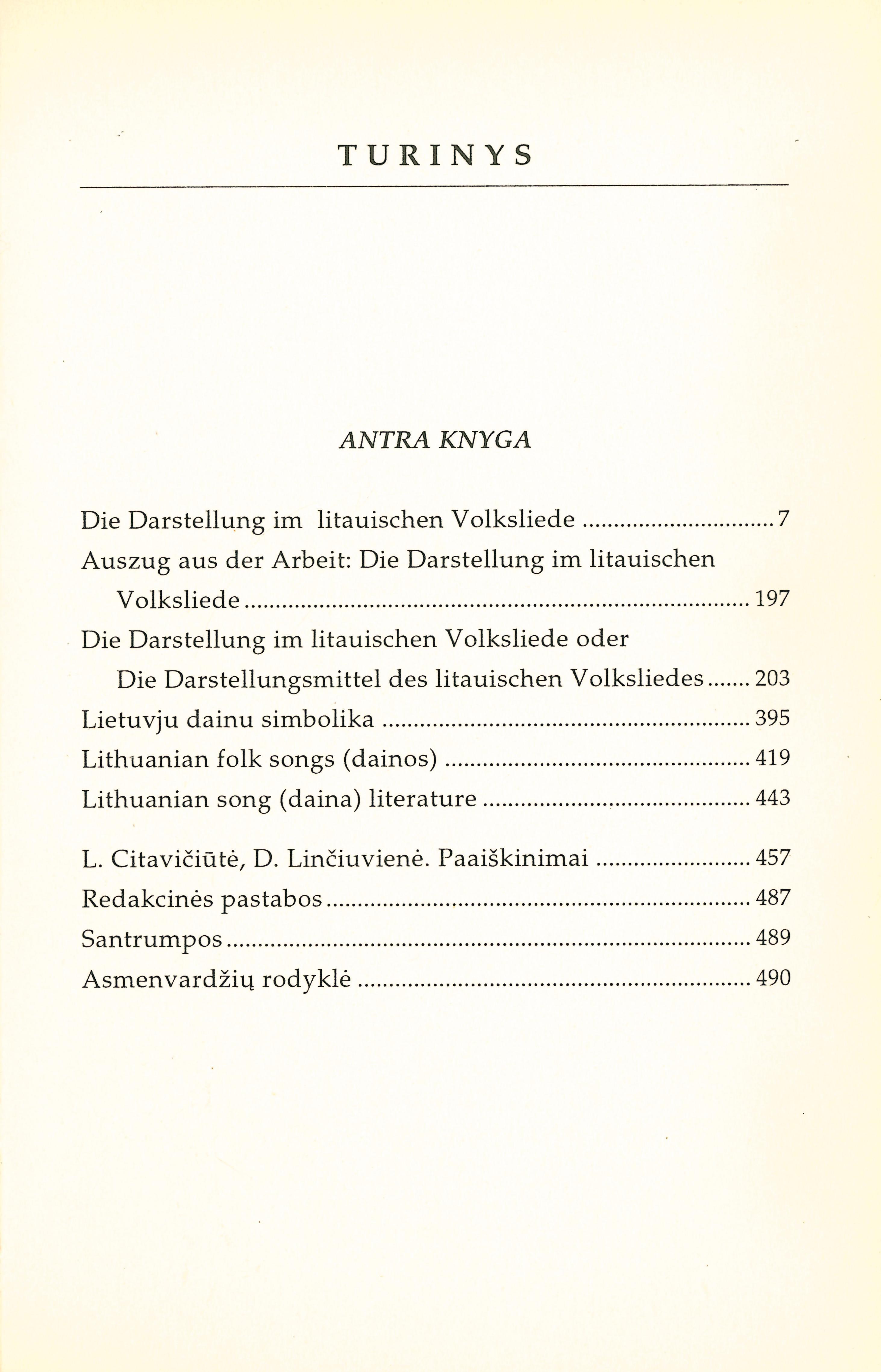 | Turinys: disertacija vokiškai: Die Darstellung im litauischen Volksliede (1924); disertacijos santrauka: Auszug aus der Arbeit: Die Darstellung im litauischen Volksliede (1924); disertacija rusiškai: Die Darstellung im litauischen Volksliede oder Die Darstellungsmittel des litauischen Volksliedes (1923); Lietuvju dainų simbolika (1925); Lithuanian folk songs (dainos) (1932); Lithuanian song (daina) literature (1932) [lt] | |