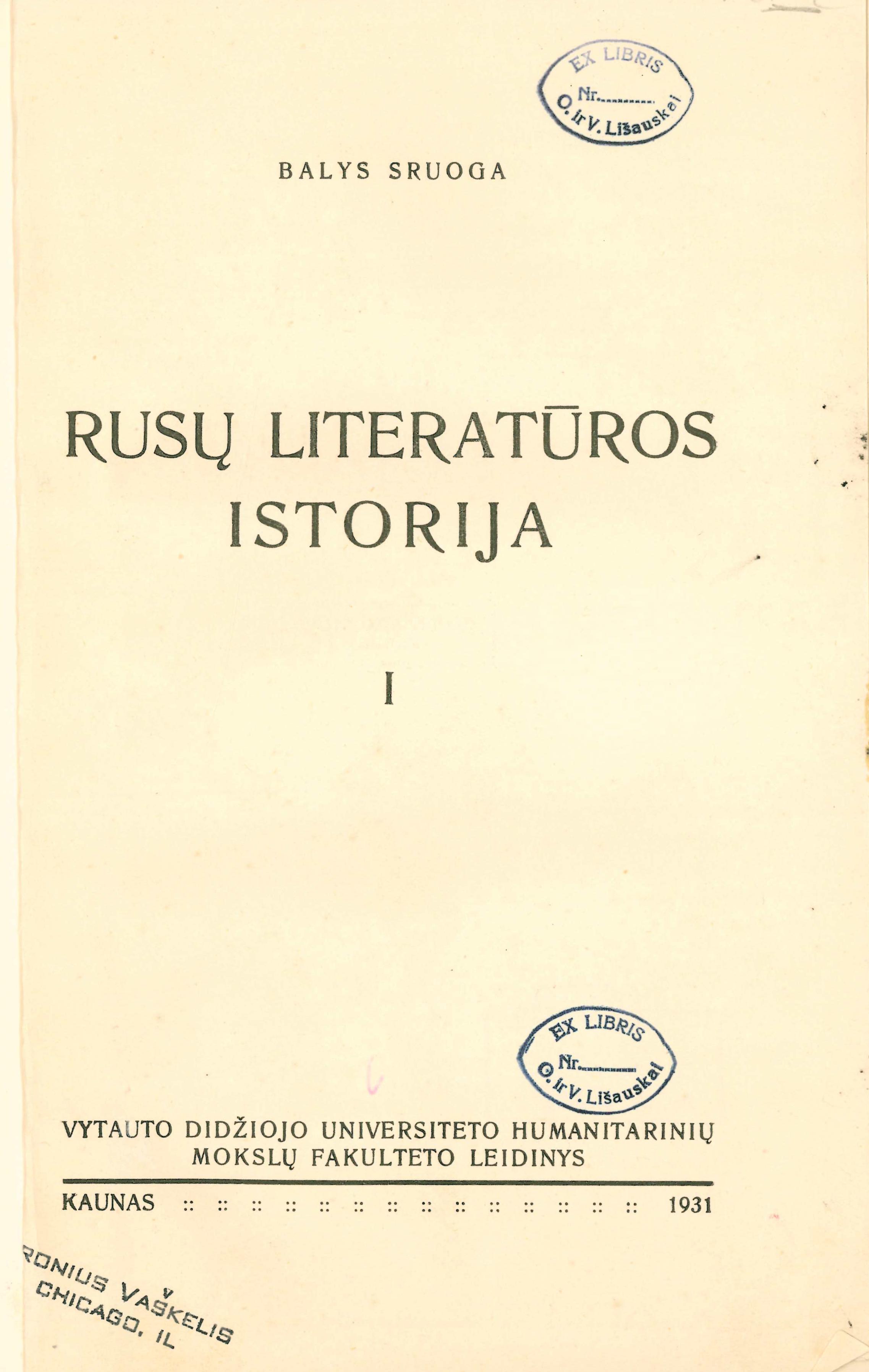 | Antraštė | Rusų literatūros istorija. T. 1: Rusų senoji literatūra/ Balys Sruoga. – Kaunas: [VDU Humanitarinių mokslų fakultetas], 1931. – 400 p. (Humanitarinių mokslų fakulteto raštai, kn. 12) [lt] |