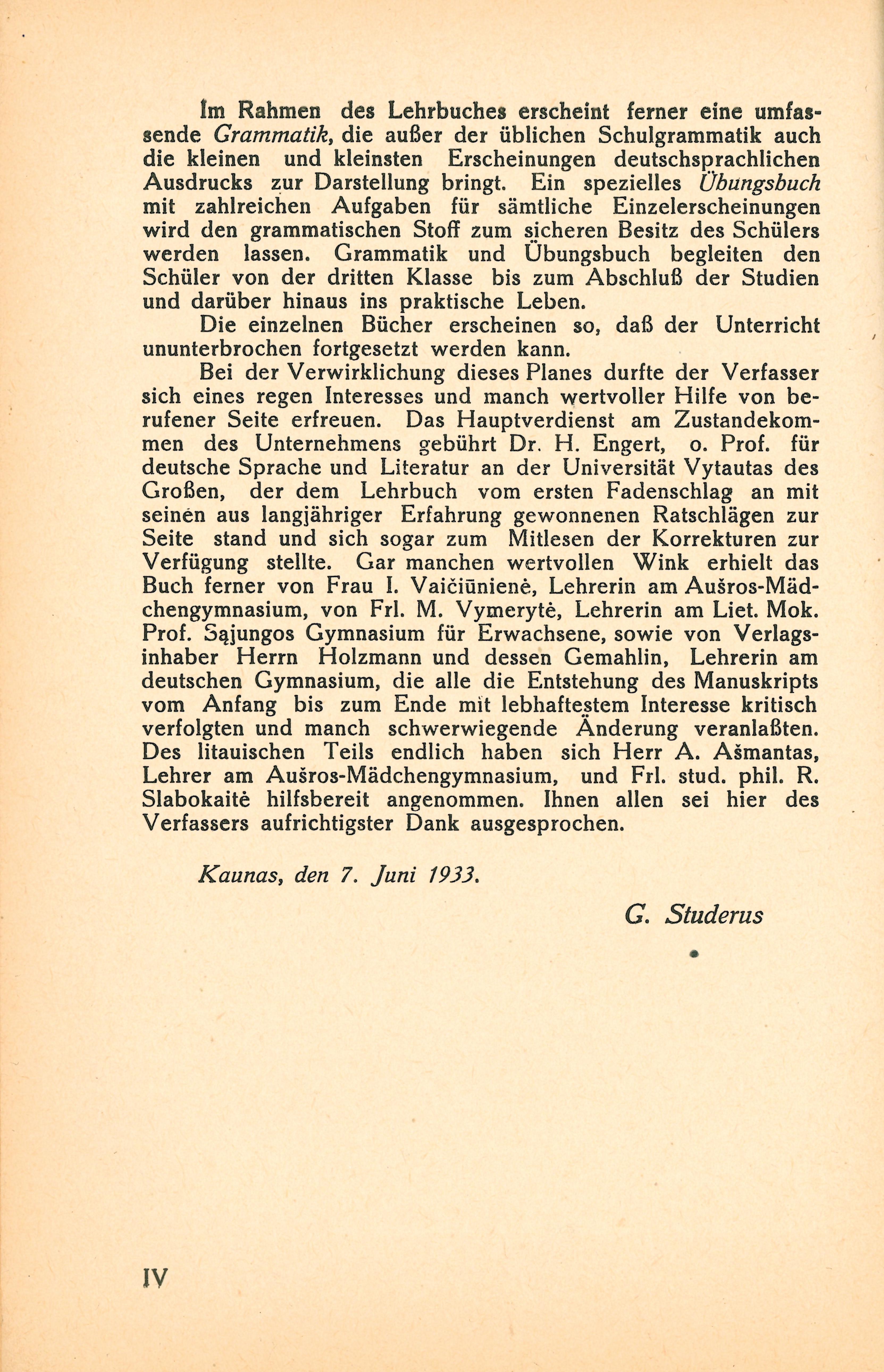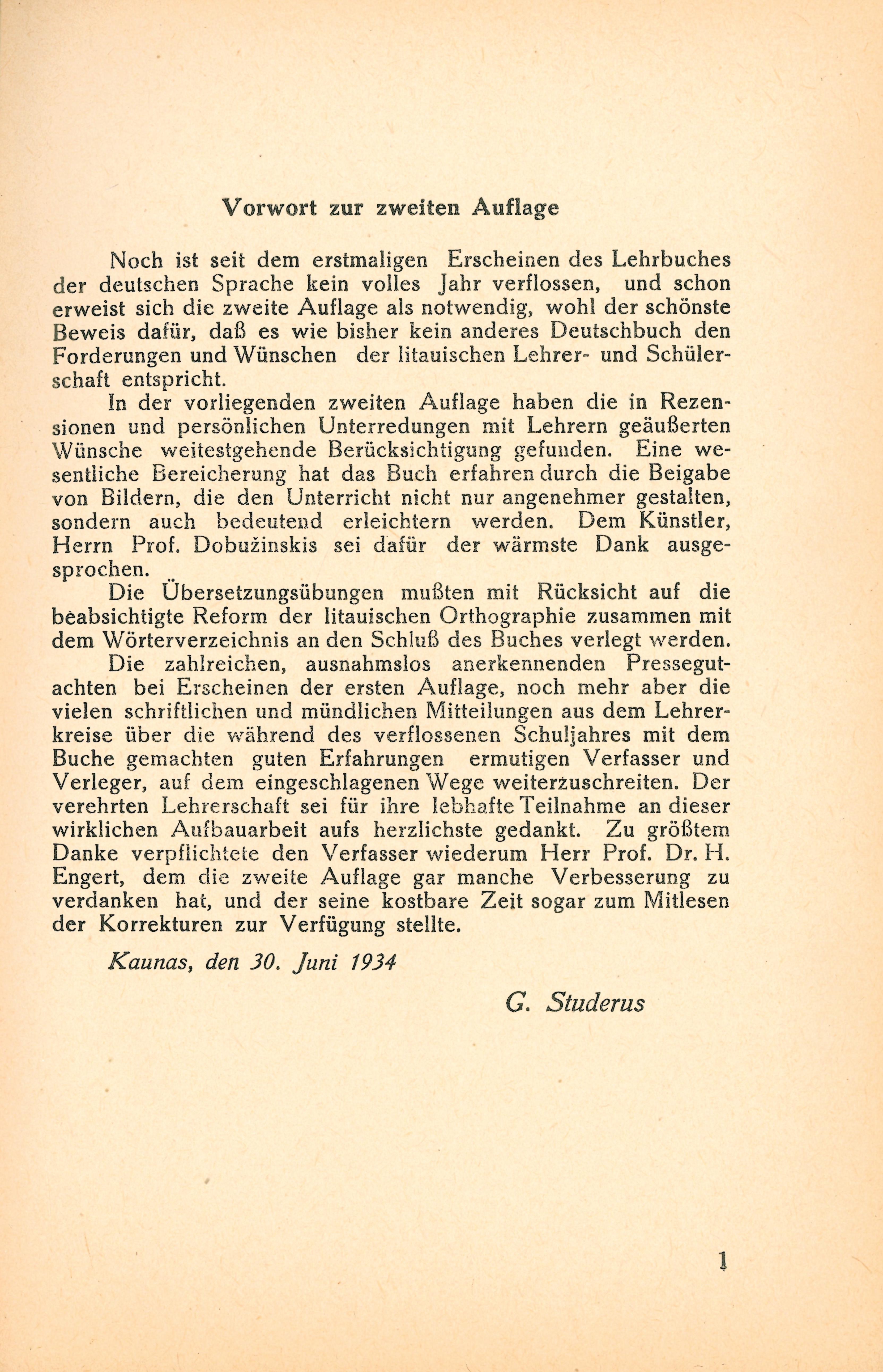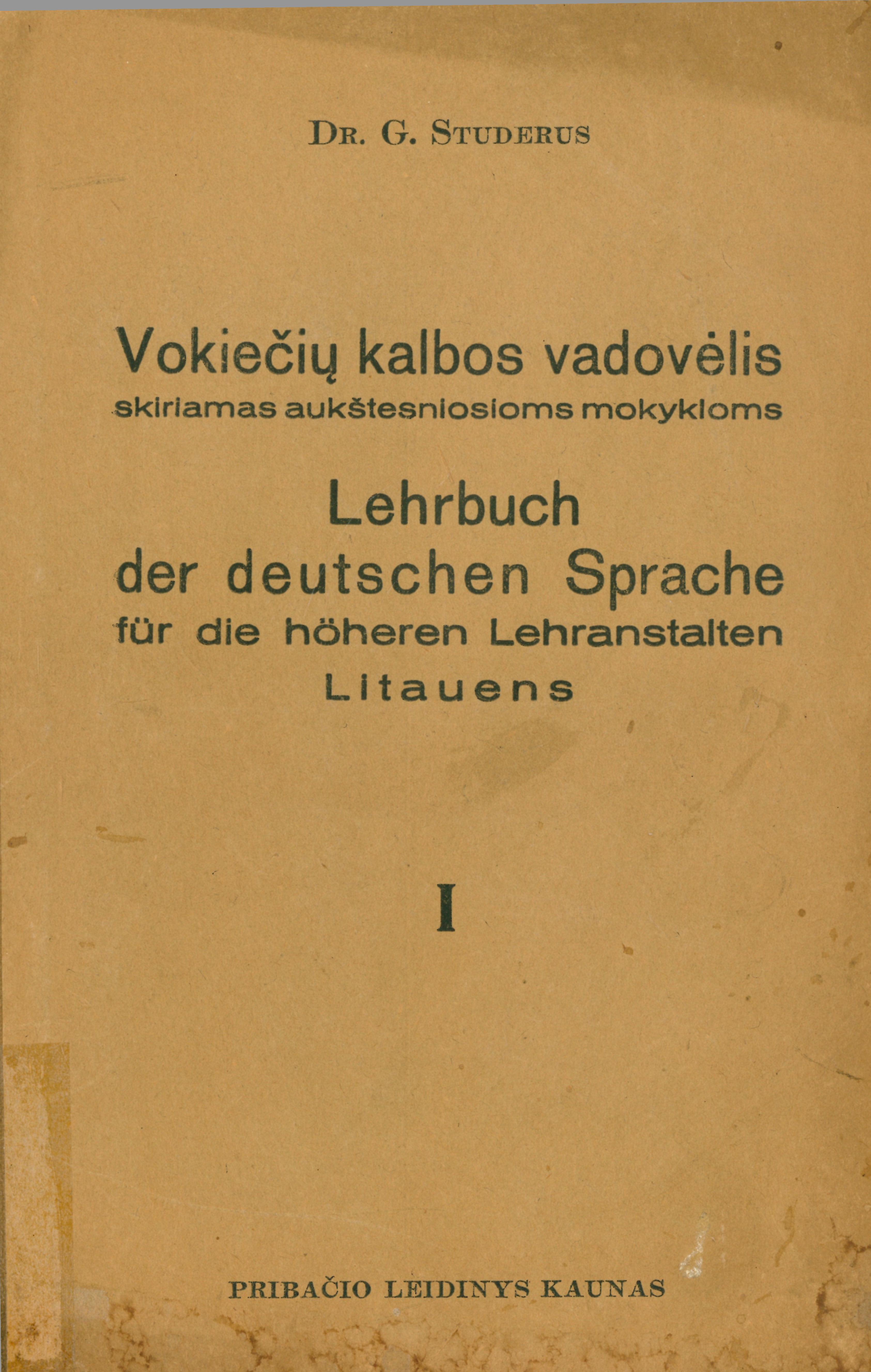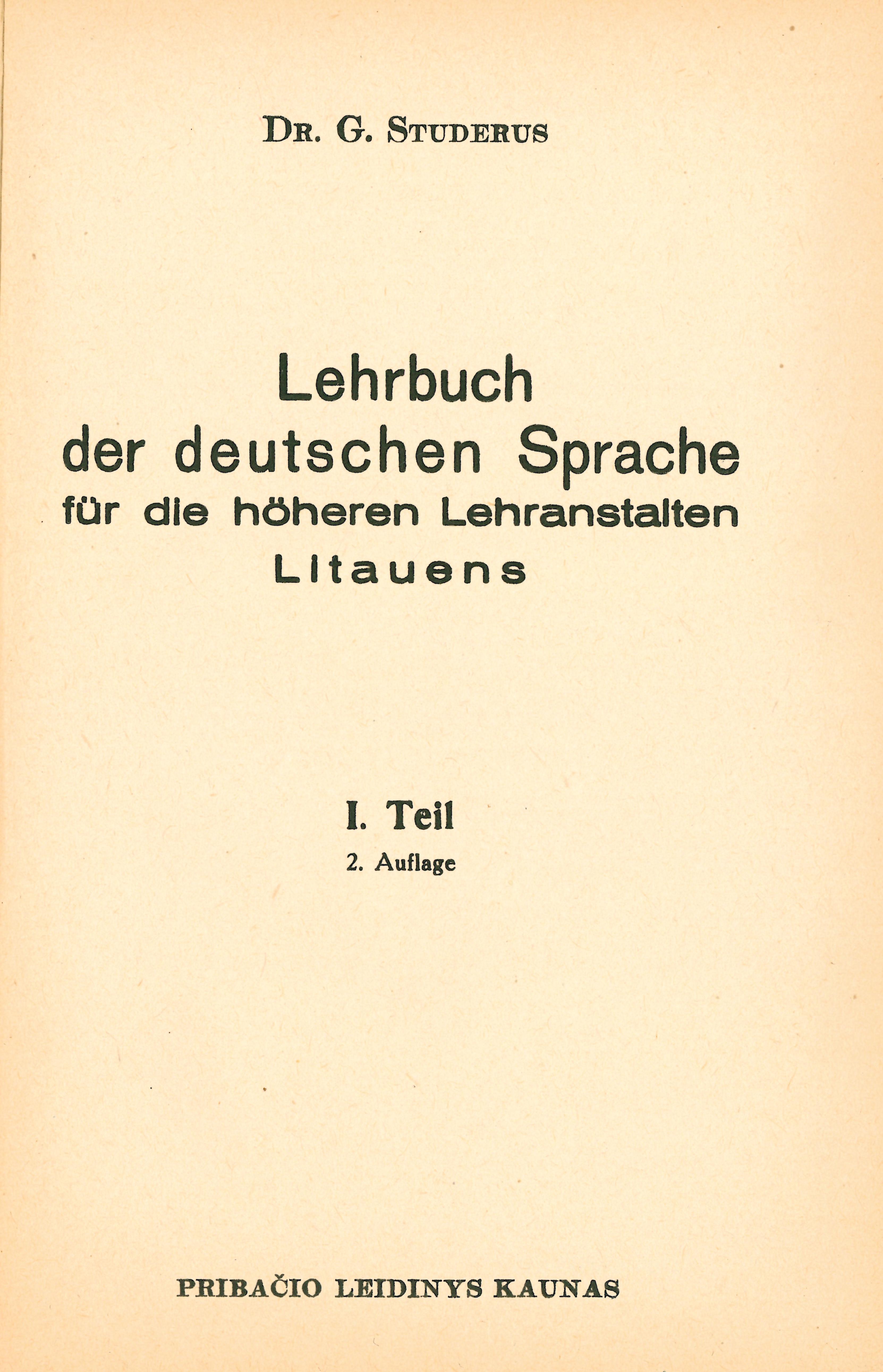 Vokiečių kalbos vadovėlis : skiriamas aukštesniosioms mokykloms = Lehrbuch der deutschen Sprache für die höheren Lehranstalten Litauens / G. Studerus. – 2. Aufl. – Kaunas : Pribačis, 1934-1938. – 4 d. : iliustr.
