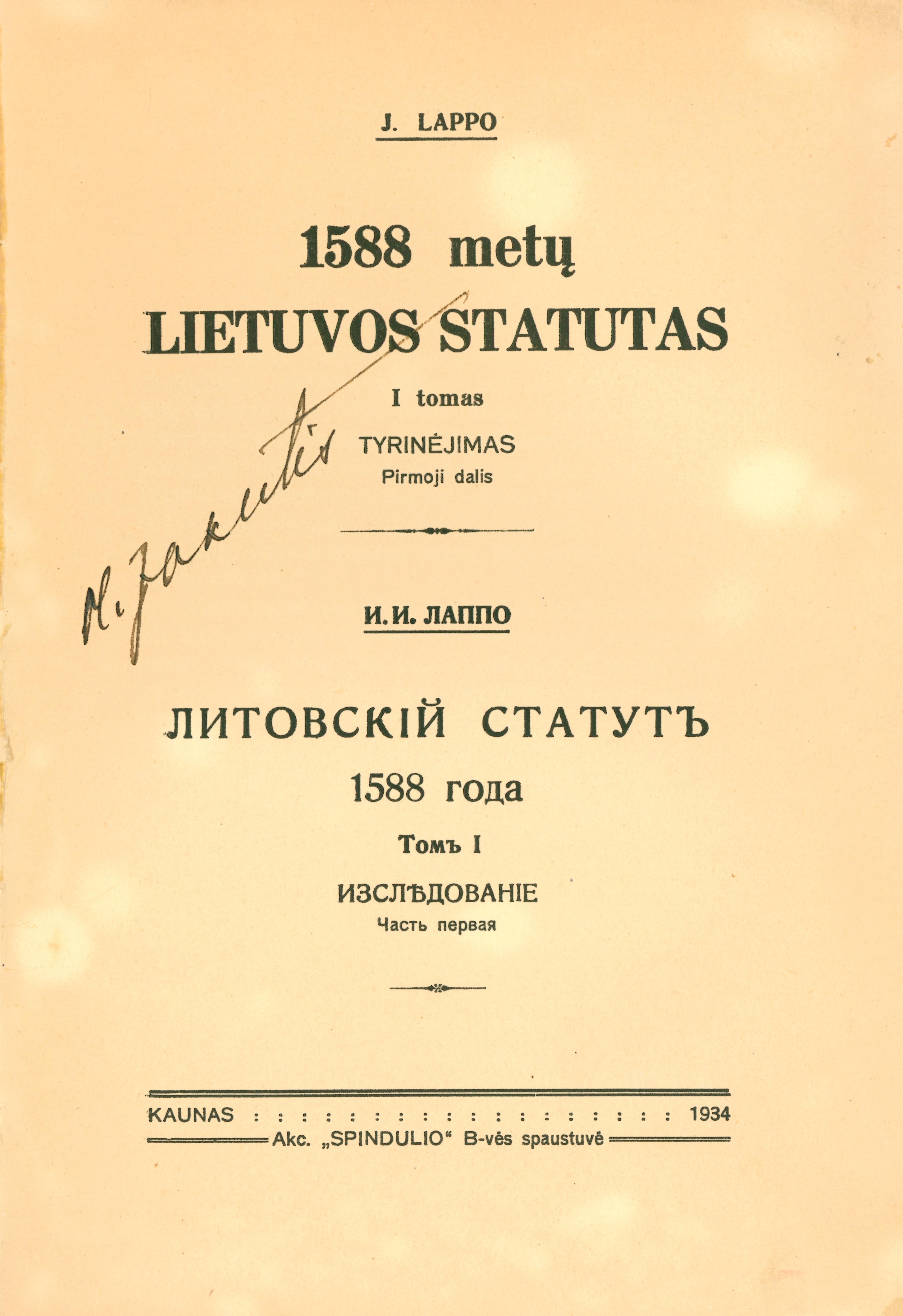 1588 metų Lietuvos Statutas = Литовскiй статутъ 1588 года / J. Lappo. – Kaunas : Spindulio sp, 1934-1938. – 2 tomai.