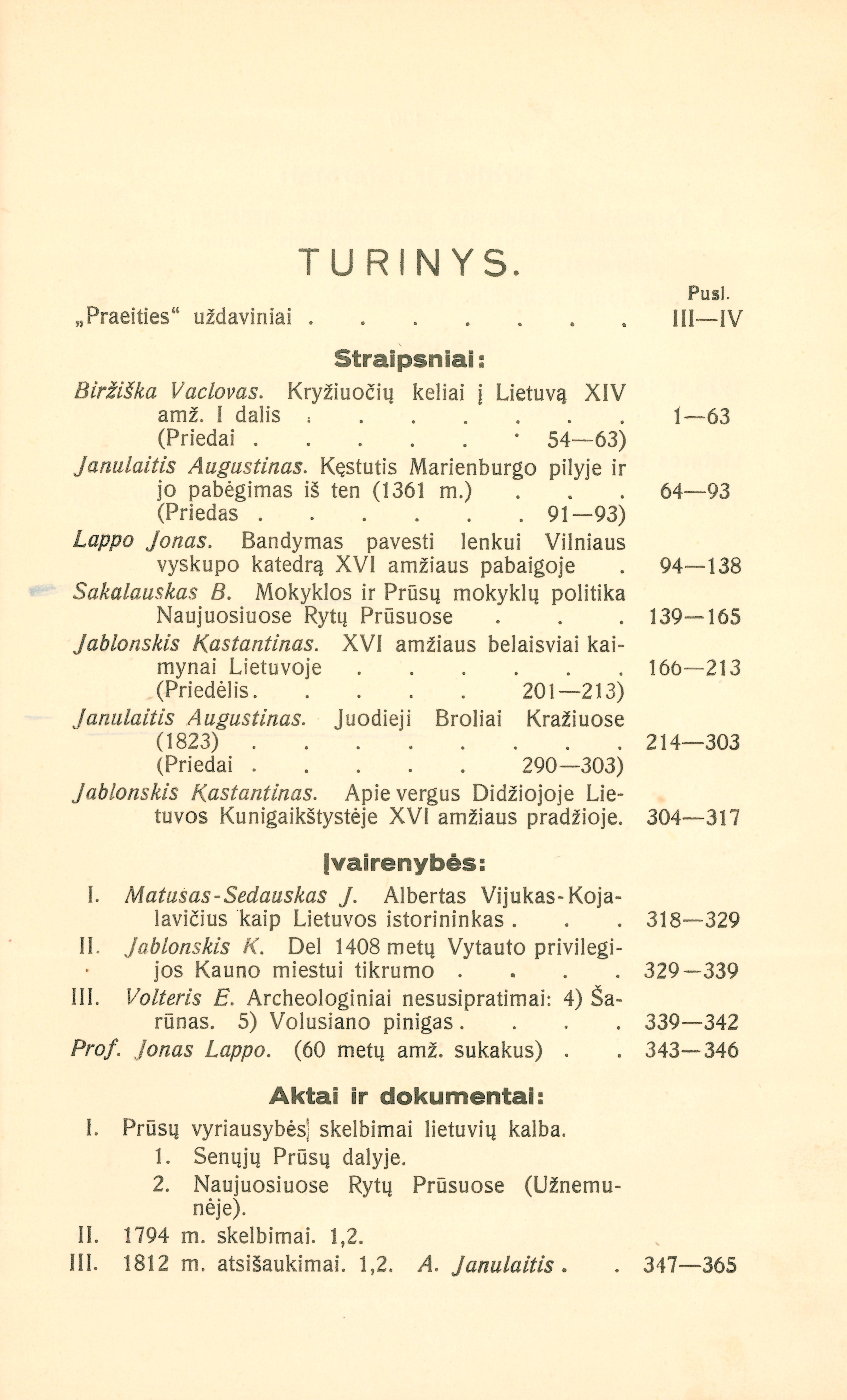 Janulaitis Augustinas. "Praeities" uždaviniai (p. III-IV); Biržiška Vaclovas. Kryžiuočių keliai į Lietuvą XIV amž. (p. 1-63); Janulaitis Augustinas. Kęstutis Marienburgo pilyje ir jo pabėgimas iš ten (1361 m.) (p. 64-93); Lappo Jonas. Bandymas pavesti lenkui Vilniaus vyskupo katedrą XVI amžiaus pabaigoje (p. 94-138); Sakalauskas Juozas. Mokyklos ir Prūsų mokyklų politika Naujuosiuose Rytų Prūsuose (p. 139-165); Jablonskis Konstantinas. XVI amžiaus belaisviai kaimynai Lietuvoje (p. 166-213); Janulaitis Augustinas. Juodieji Broliai Kražiuose (1823 m.) (p. 214-303); Jablonskis Konstantinas. Apie vergus Didžiojoje Lietuvos Kunigaikštystėje XVI amžiaus pradžioje (p. 304-317); Matusas-Sedauskas Jonas. Albertas Vijūkas-Kojalavičius kaip Lietuvos istorininkas (p. 318-329); Jablonskis Konstantinas. Del 1408 metų Vytauto privilegijos Kauno miestui tikrumo (p. 329-339); Volteris Eduardas. Archeologiniai nesusipratimai. D. 3 (p. 339-342); Prof. Jonas Lappo. (60 metų amž. sukakus) (p. 343-346); Aktai ir dokumentai / parengė Augustinas Janulaitis (p. 347-365); Kritika ir referatai (p. 366-383); 1928 ir 1929 metų Lietuvos istorijos bibliografija / parengė Konstantinas Jablonskis (p. 384-396); Lietuvos Istorijos Draugijos Įstatai (p. 396-397)