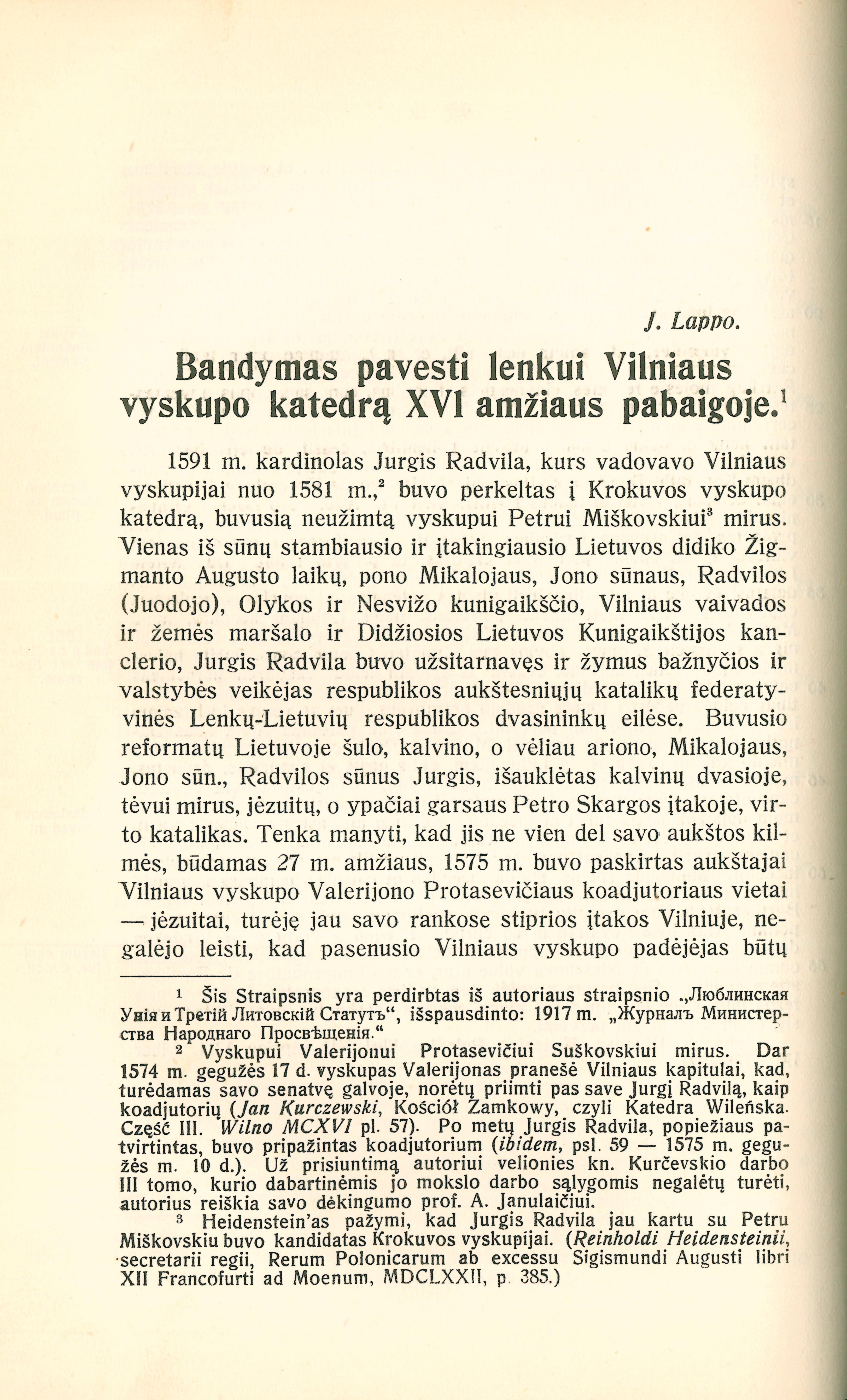 Bandymas pavesti lenkui Vilniaus vyskupo katedrą XVI amž. pabaigoje / J. Lappo. – Iš: Praeitis, t. 1. – Kaunas, 1930, p. 94-138.