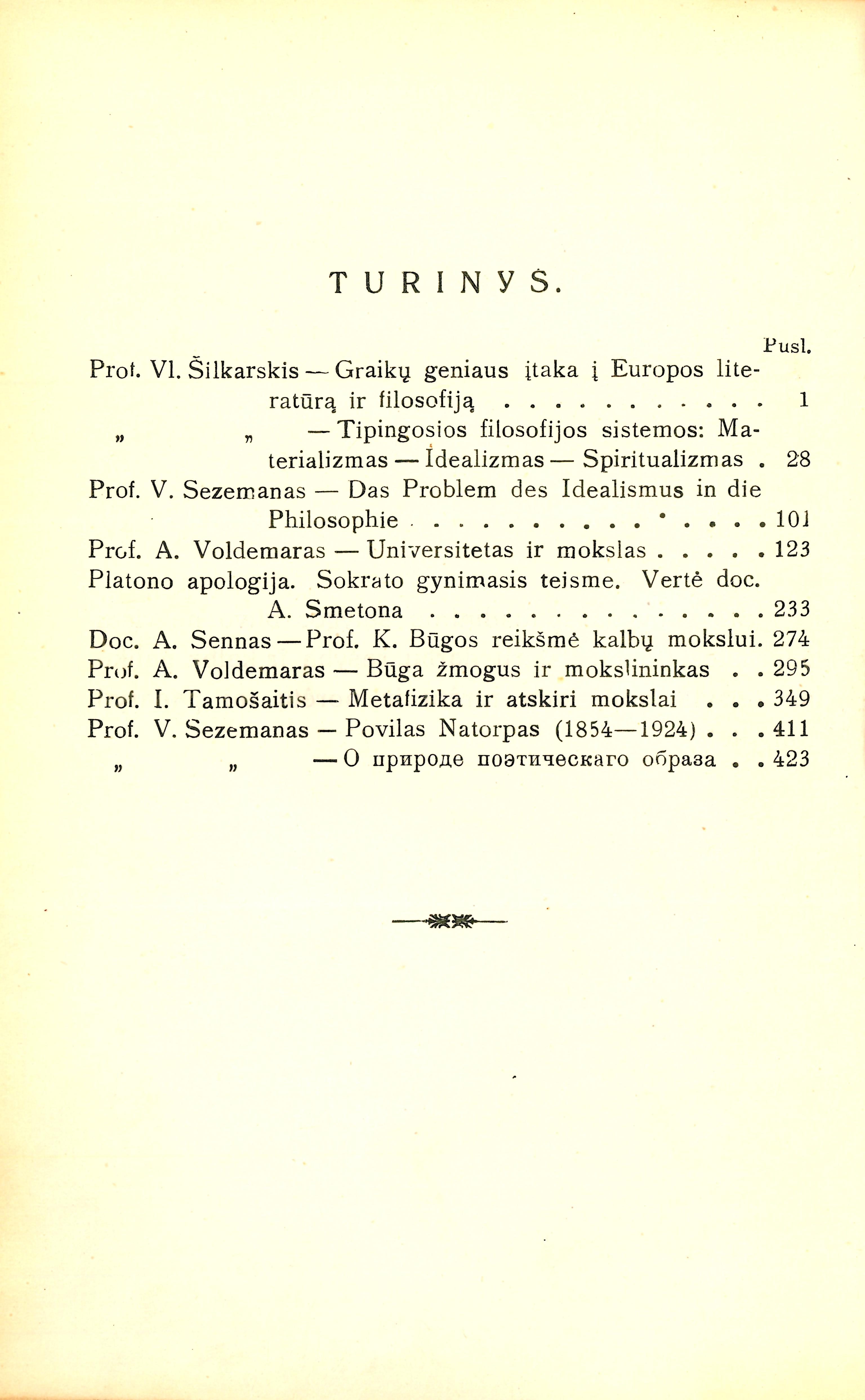 Šilkarskis Vladimiras, Graikų genijaus įtaka į Europos literatūras ir filosofiją (p. 1-27); Šilkarskis Vladimiras, Tipingosios filosofijos sistemos. materializmas - Idealizmas – Spiritualizmas (p. 28-100); Sezemanas Vosylius. Das problem des idealismus in der philosophie (p. 101-122); Voldemaras Augustinas, Universitetas ir mokslas (p. 123-232); Platono apologija. Sokrato gynimasis teisme / Antano Smetonos vertimas (p. 233-273); Sennas Alfredas, Prof. K. Būgos reikšmė kalbų mokslui (p. 274-294); Voldemaras Augustinas, Būga žmogus ir mokslininkas (p. 295-348); Tamošaitis Izidorius, Metafizika ir atskiri mokslai (p. 349-410); Sezemanas Vosylius, Povilas Natorpas (1854-1924) (p. 411-422); Сеземан Василий, О природе поетического образа (p. 423-481)