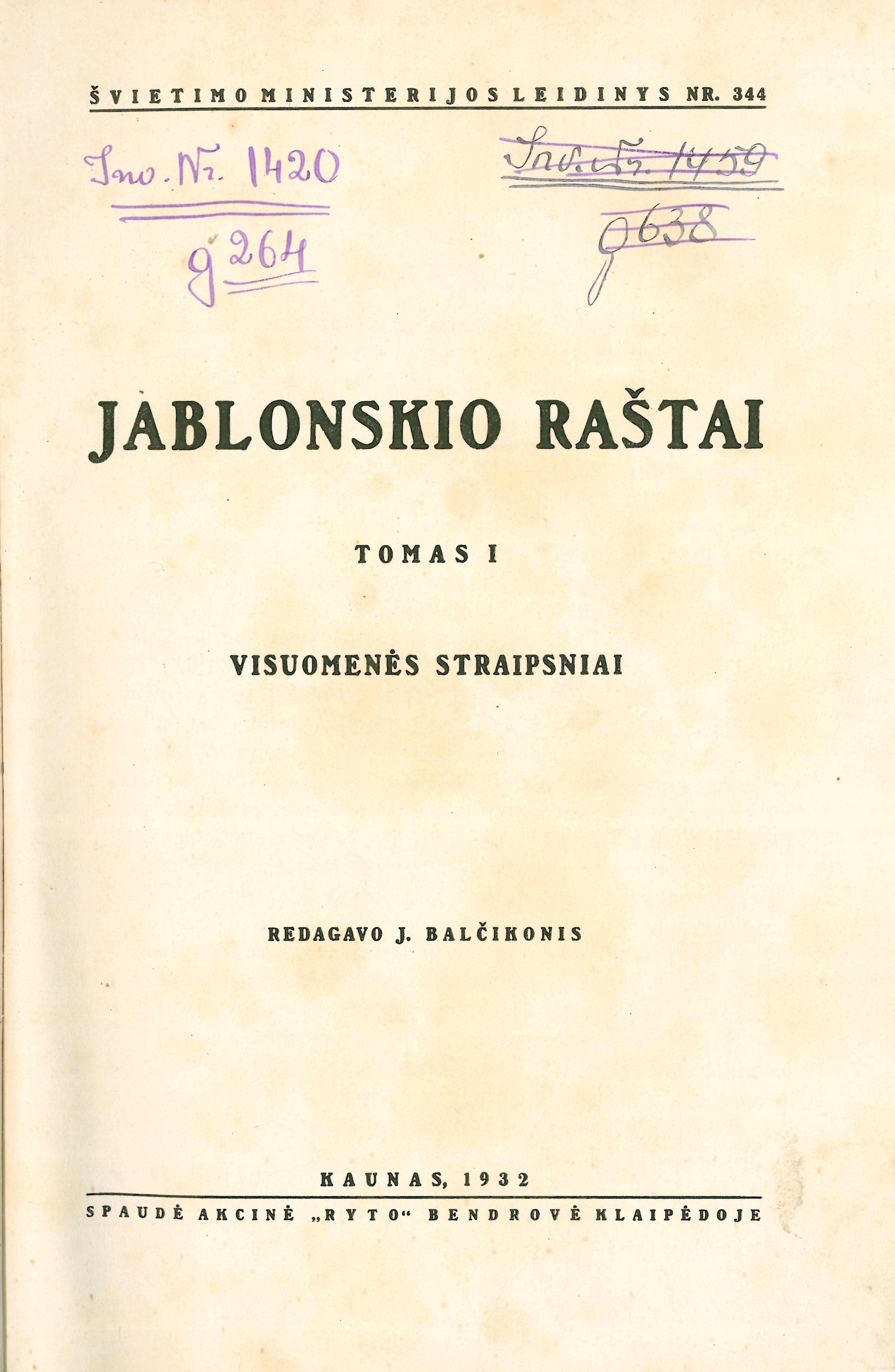 | Antraštė | Jablonskio raštai. T. 1: Visuomenės straipsniai / redagavo J. Balčikonis. – Kaunas: Švietimo ministerija, 1932. – XXXII, 320, [12] p. (Švietimo ministerijos leidinys; Nr. 344) [lt] |
