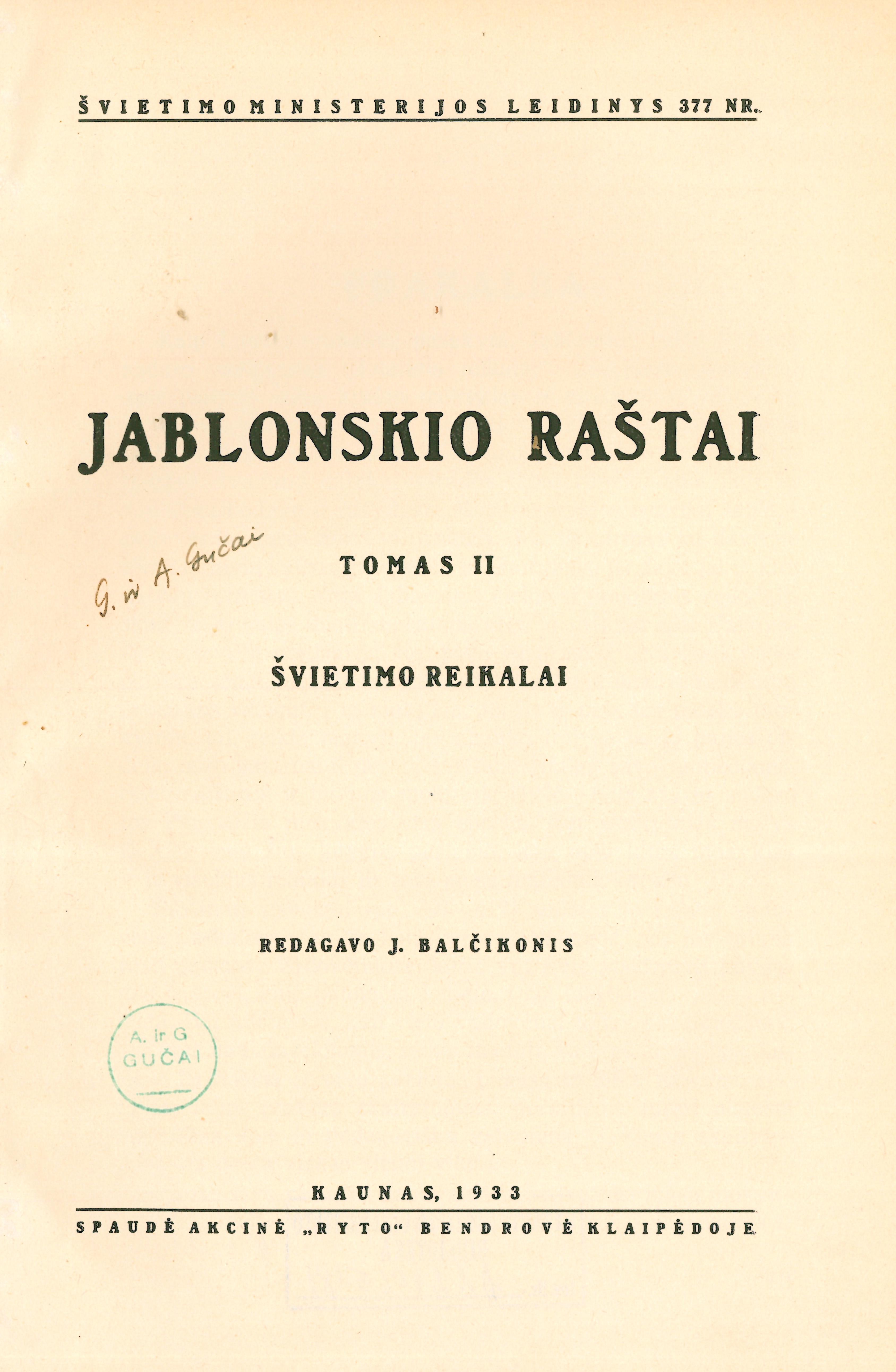| Antraštė | Jablonskio raštai. T. 2: Švietimo reikalai / redagavo J. Balčikonis. – Kaunas: Švietimo ministerija, 1933. – XII, 428, [10] p. (Švietimo ministerijos leidinys; Nr. 377) [lt] |