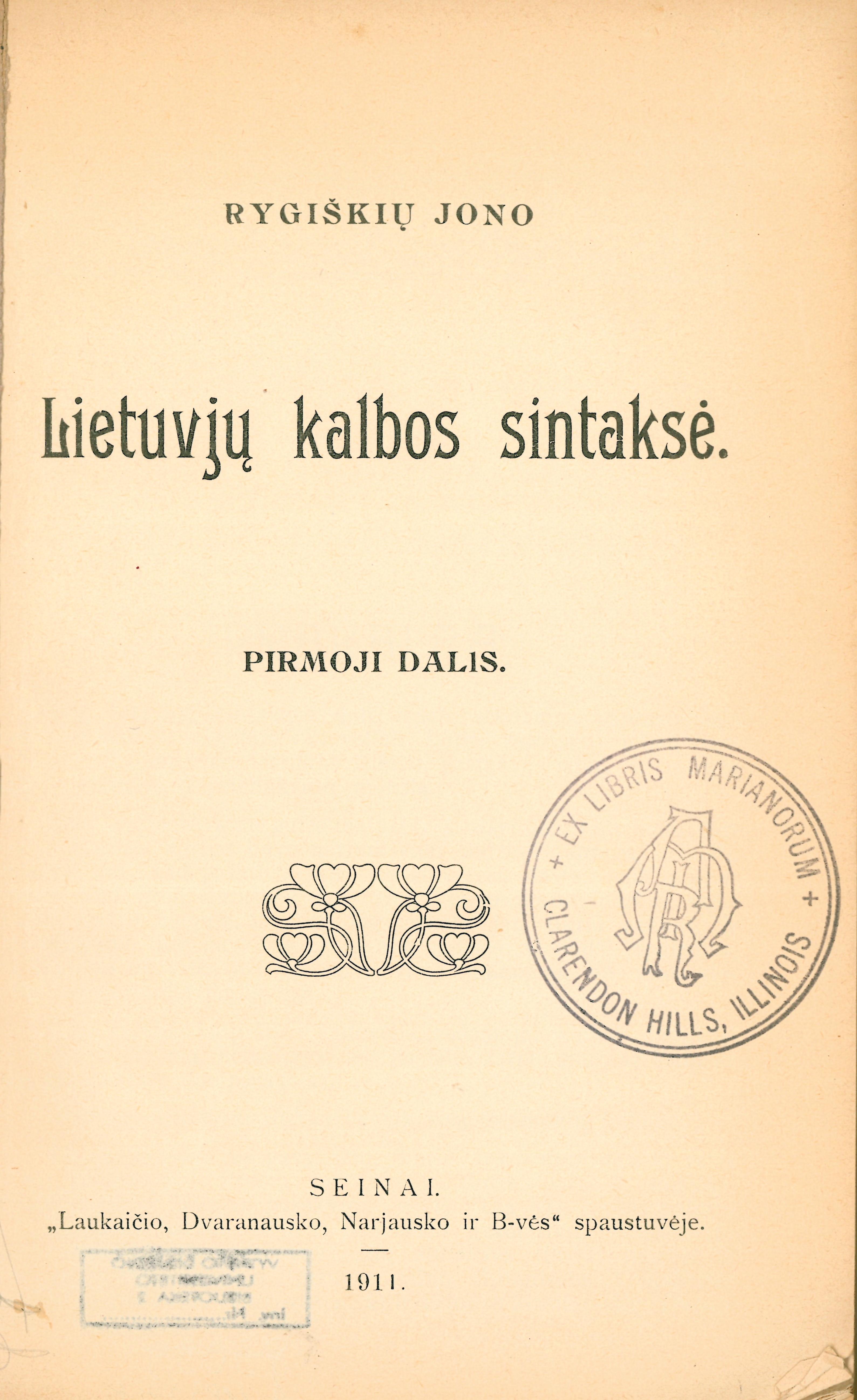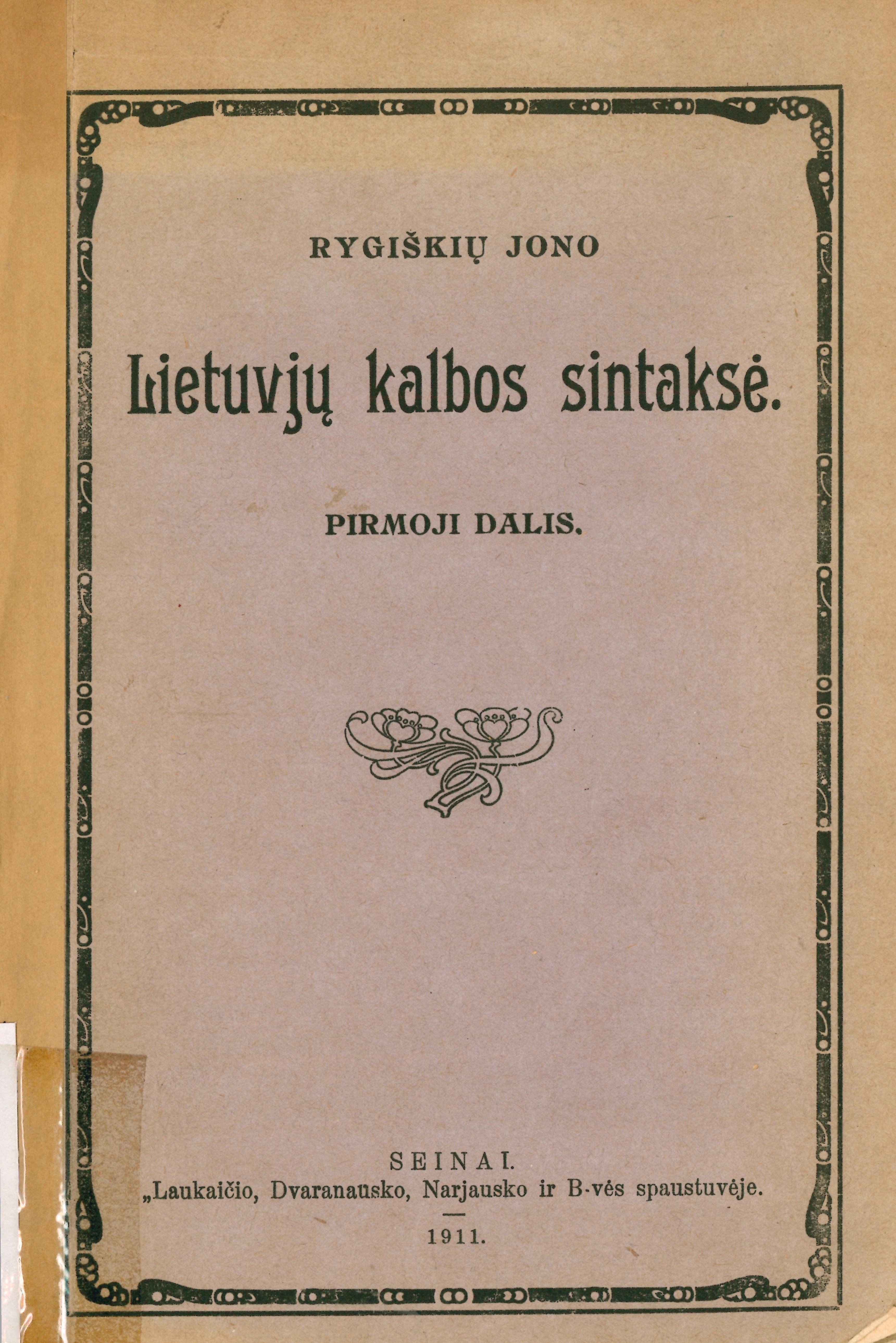 | Antraštė | Lietuvjų kalbos sintaksė. D. 1 / Rygiškių Jono. – Seinai: [s.n.], 1911. – 104 p. [lt] |