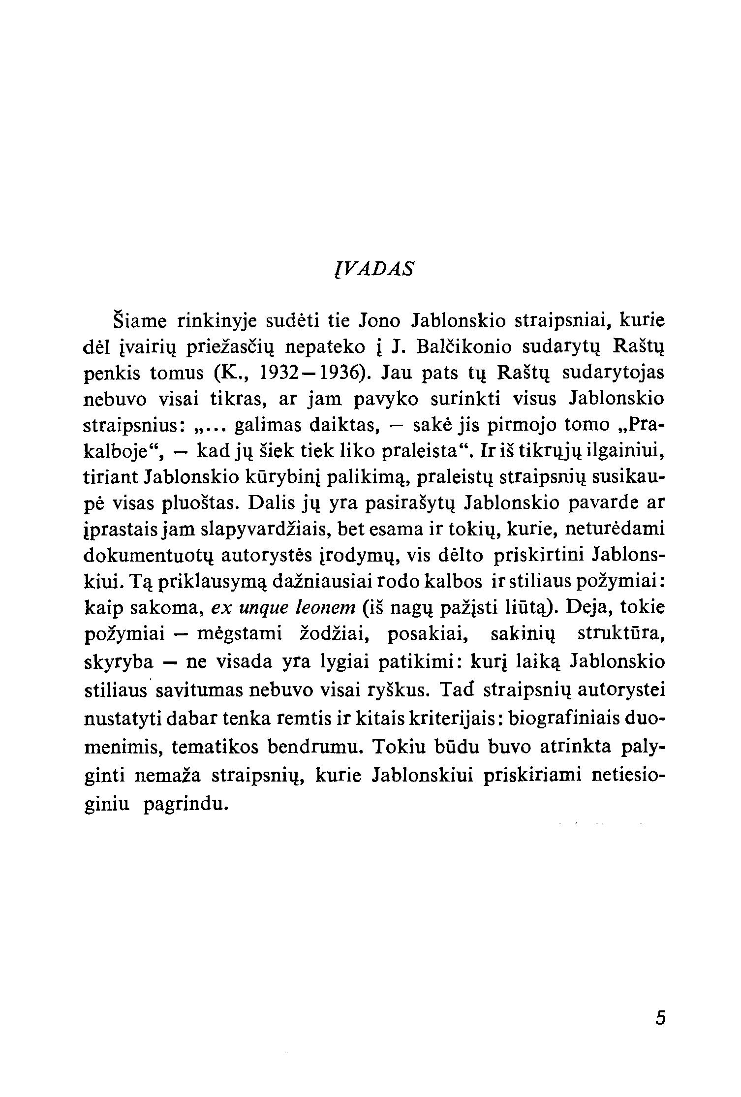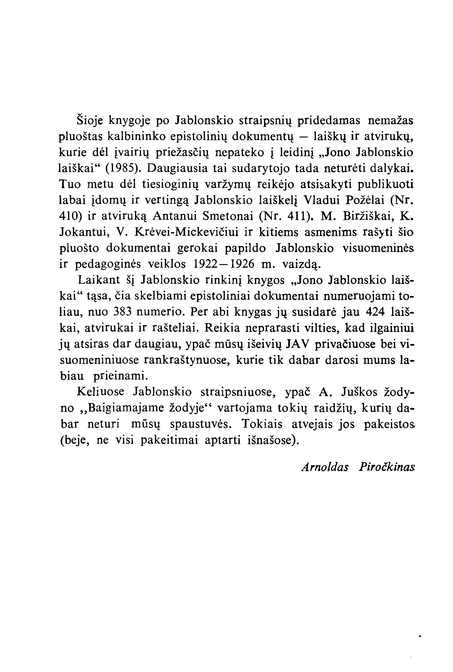 | Antraštė | Straipsniai ir laiškai / Jonas Jablonskis; sudarė, įvadą, paaiškinimus parašė ir straipsnius išvertė Arnoldas Piročkinas. – Vilnius: Mokslas, 1991. – 267 p. [lt] |