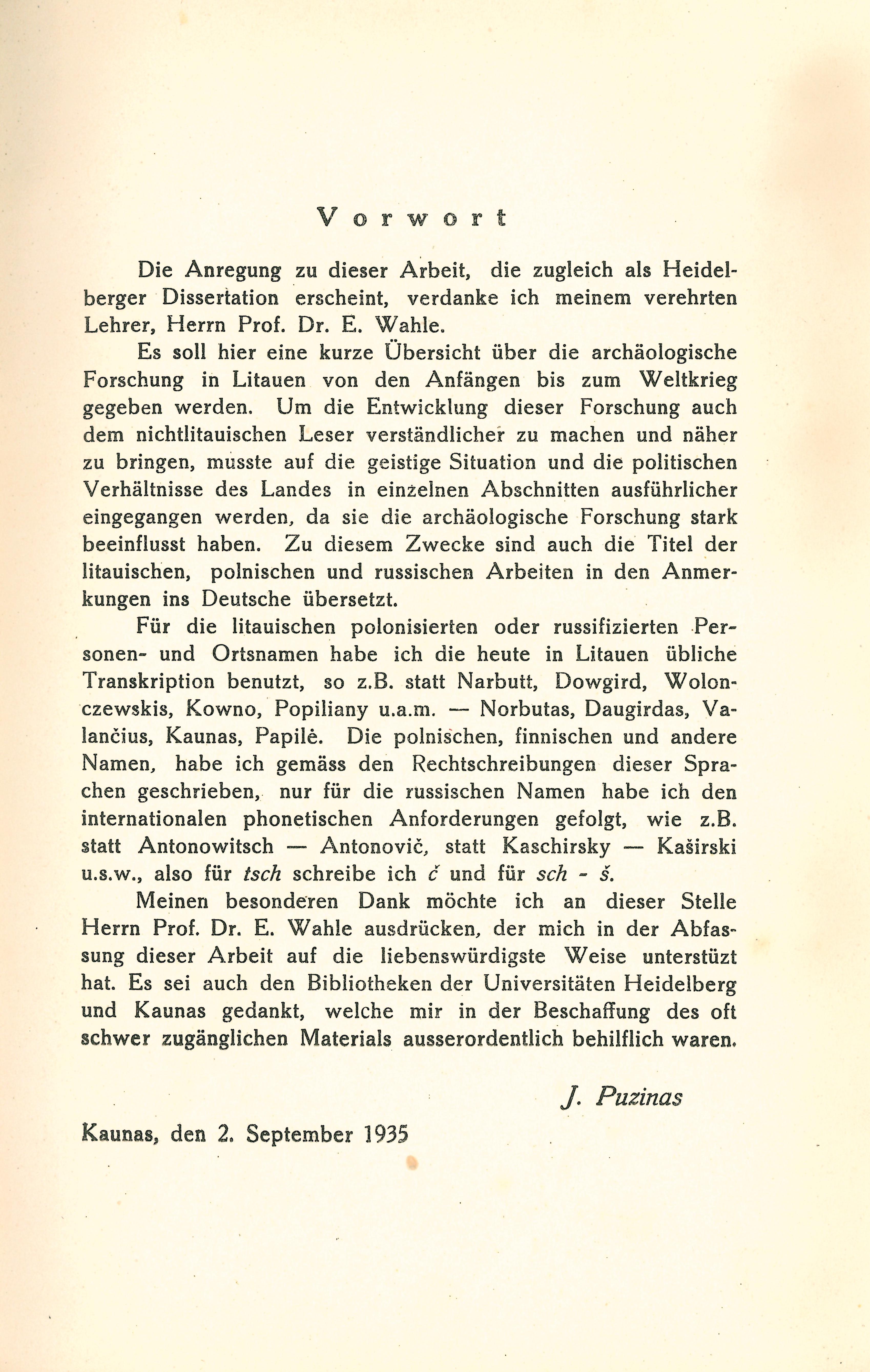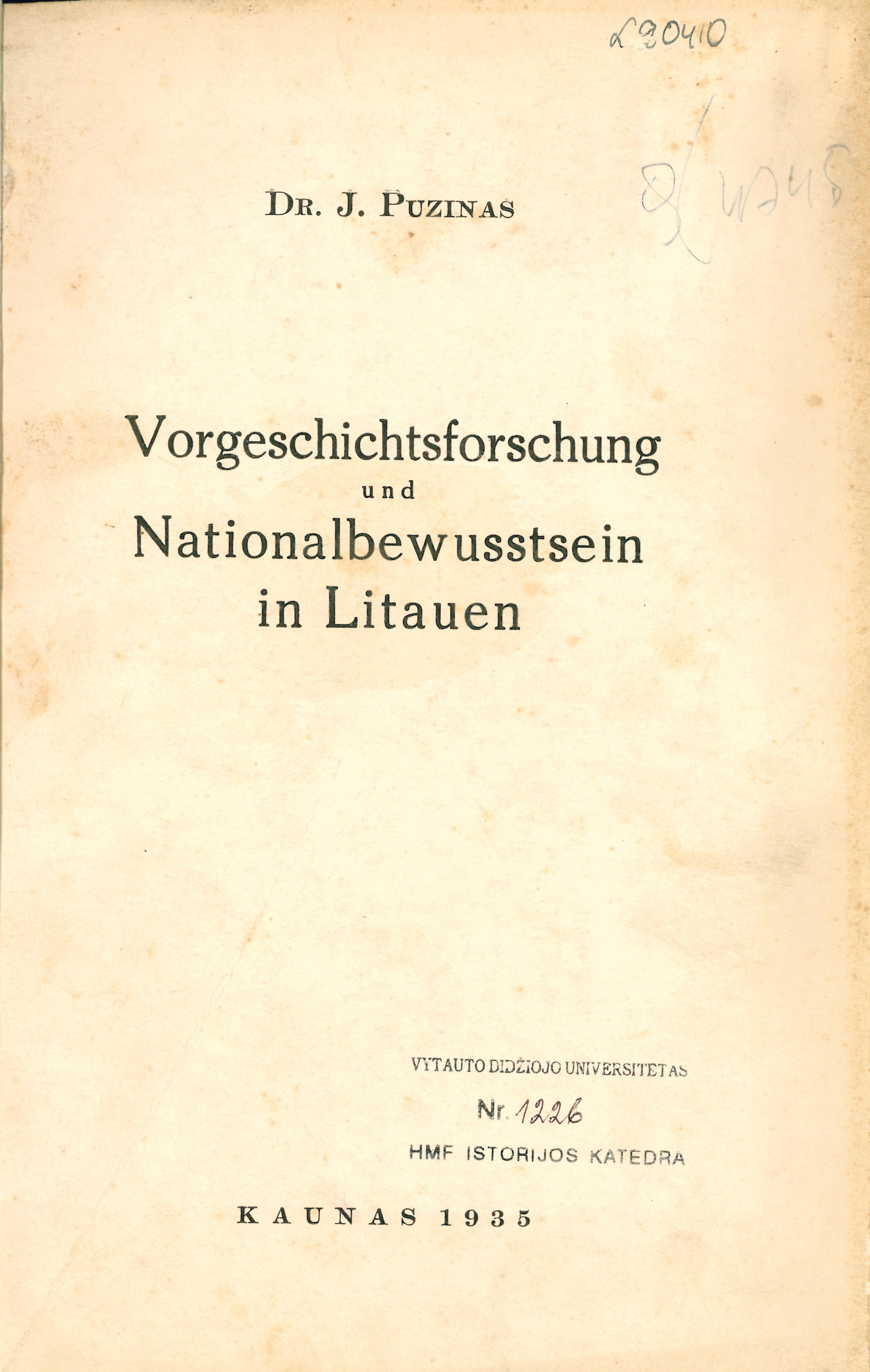 | Antraštė | Vorgeschichtsforschung und Nationalbewusstsein in Litauen / J. Puzinas. – Kaunas: [Autoriaus leidinys], 1935. – 134 p. [de] |