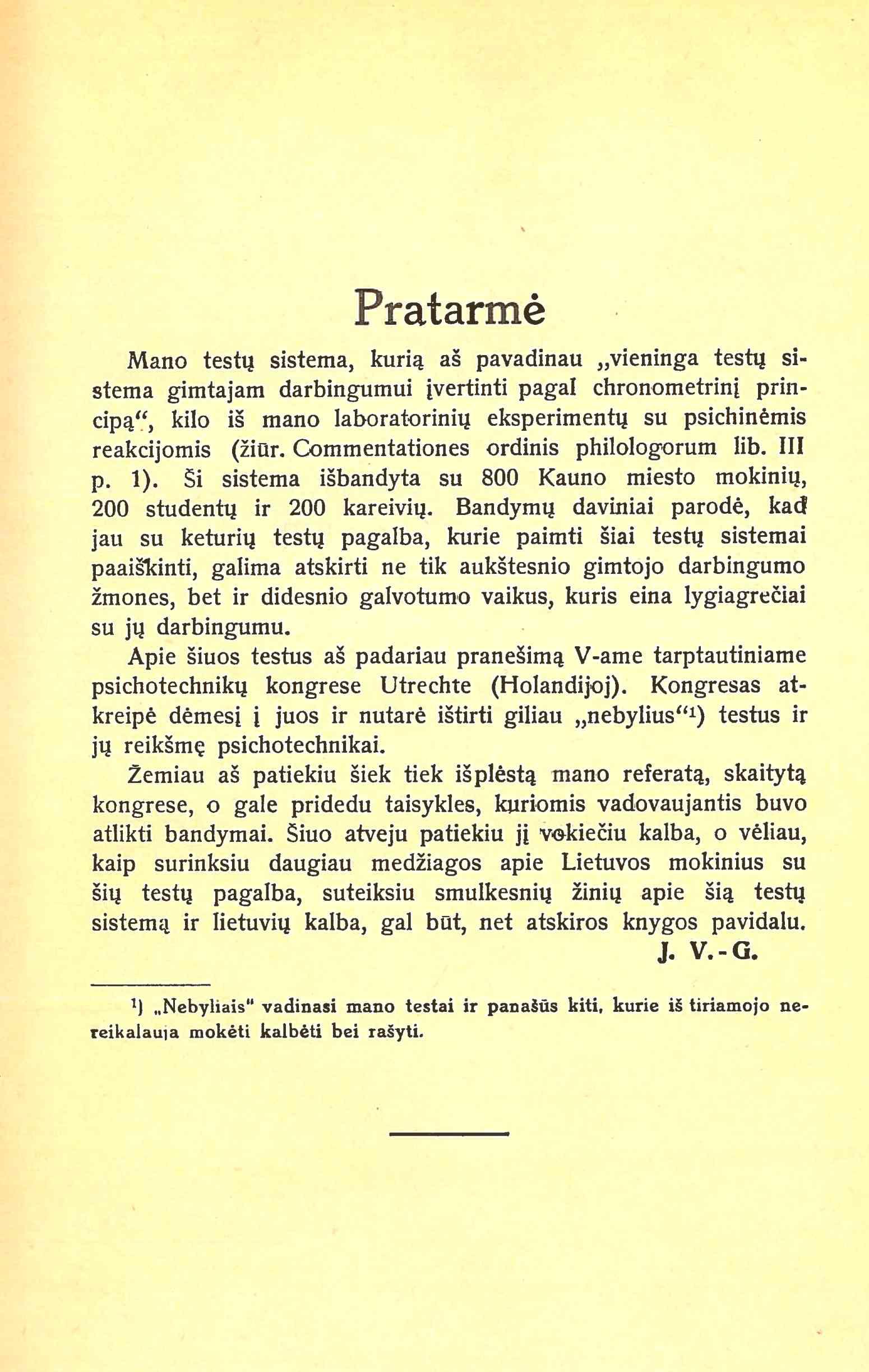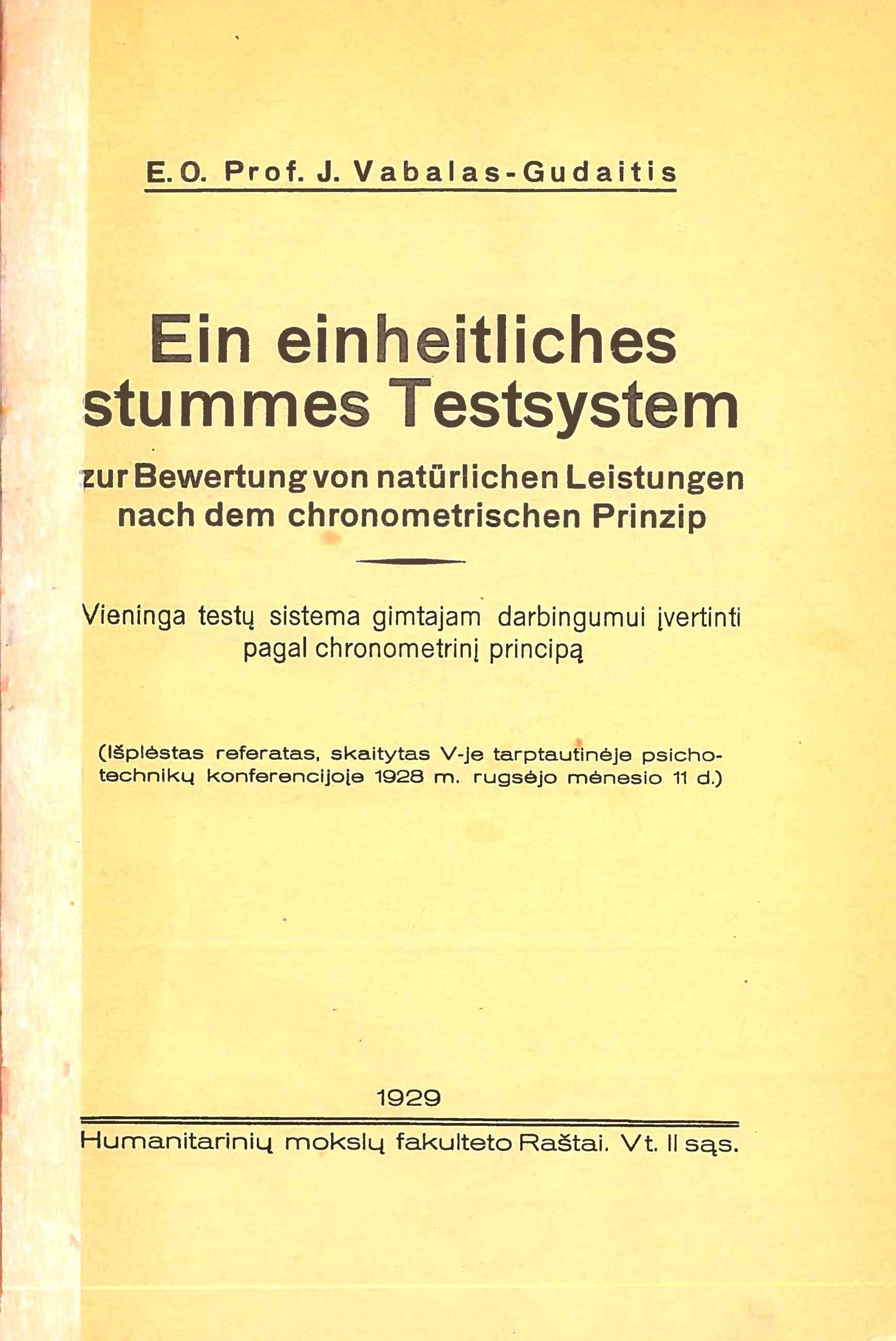 Ein einheitliches stummes Testsystem zur Bewertung von natürlichen Leistungen nach dem chronometrischen Prinzip = Vieninga testų sistema gimtajam darbingumui įvertinti pagal chronometrinį principą : (išplėstas referatas, skaitytas V-je tarptautinėje psichotechnikų konferencijoje 1928 m. rugsėjo mėnesio 11 d.) / J. Vabalas-Gudaitis. – Kaunas : Humanitarinių mokslų fakultetas, 1929. – 47 puslapiai, 8 nenumeruoti puslapiai : iliustracijos. – (Humanitarinių mokslų fakulteto raštai ; T. 5, Sąs. 2)