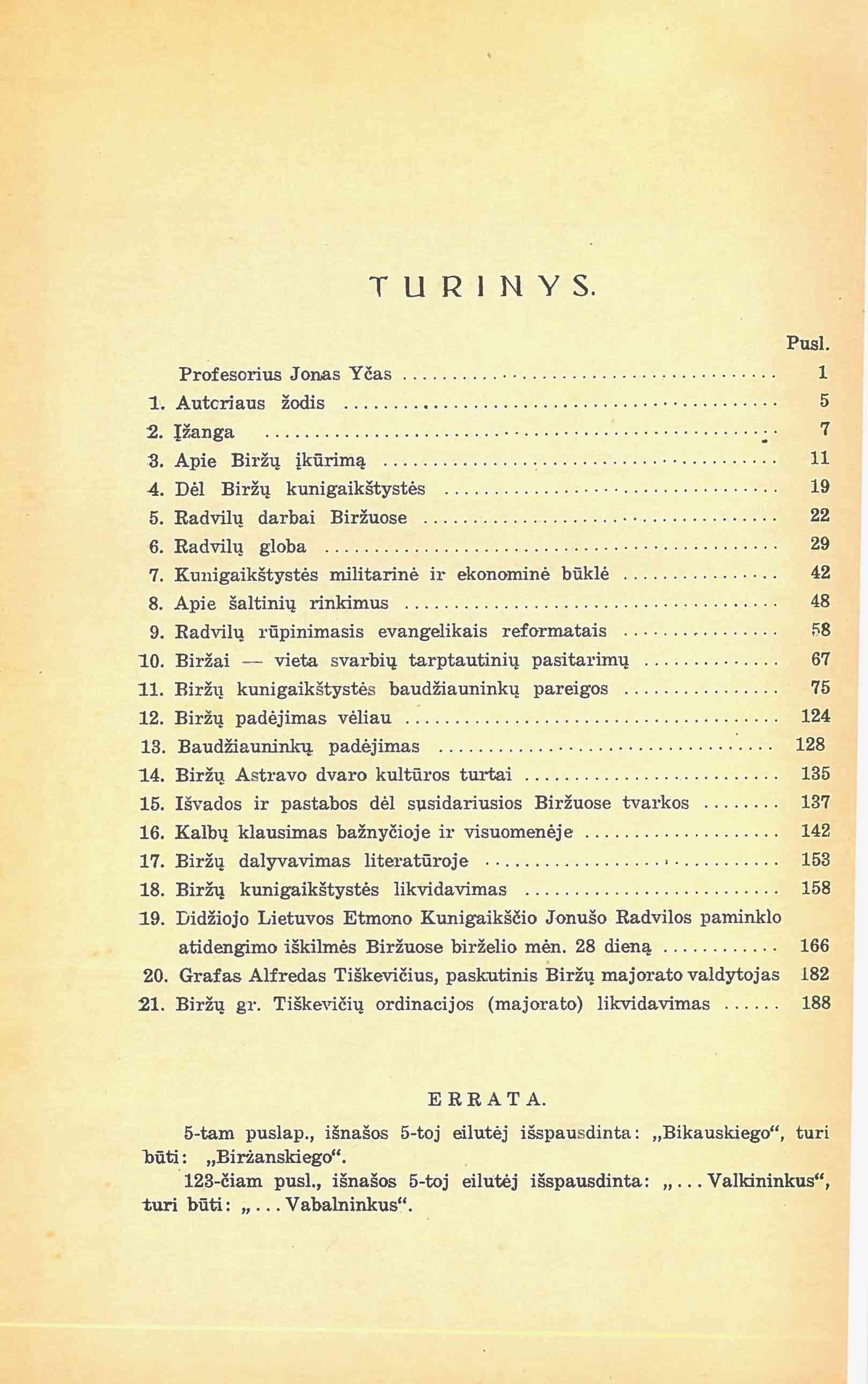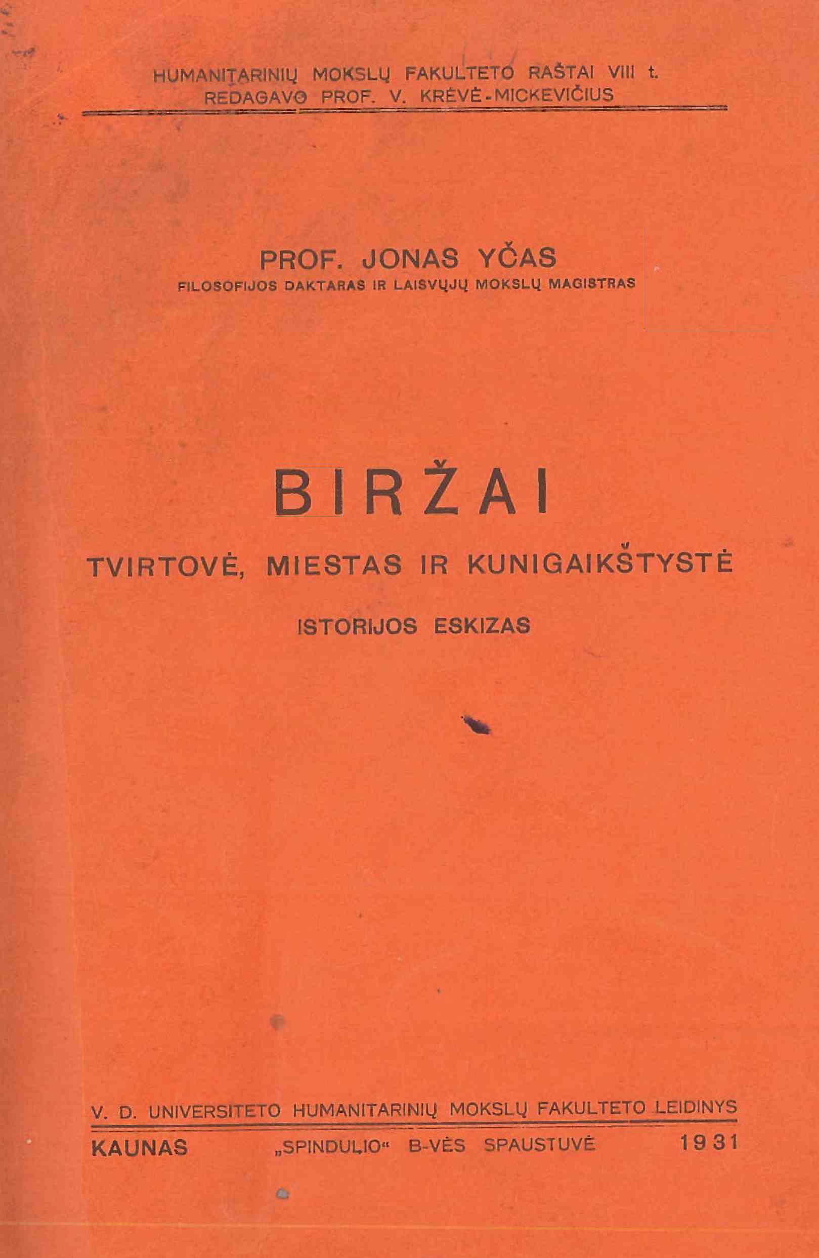 | Antraštė | Biržai: tvirtovė, miestas ir kunigaikštystė / Jonas Yčas. – Kaunas: [VDU Humanitarinių mokslų fakultetas], 1931. – XV, 192 p. (Humanitarinių mokslų fakulteto raštai, kn. 8) [lt] |