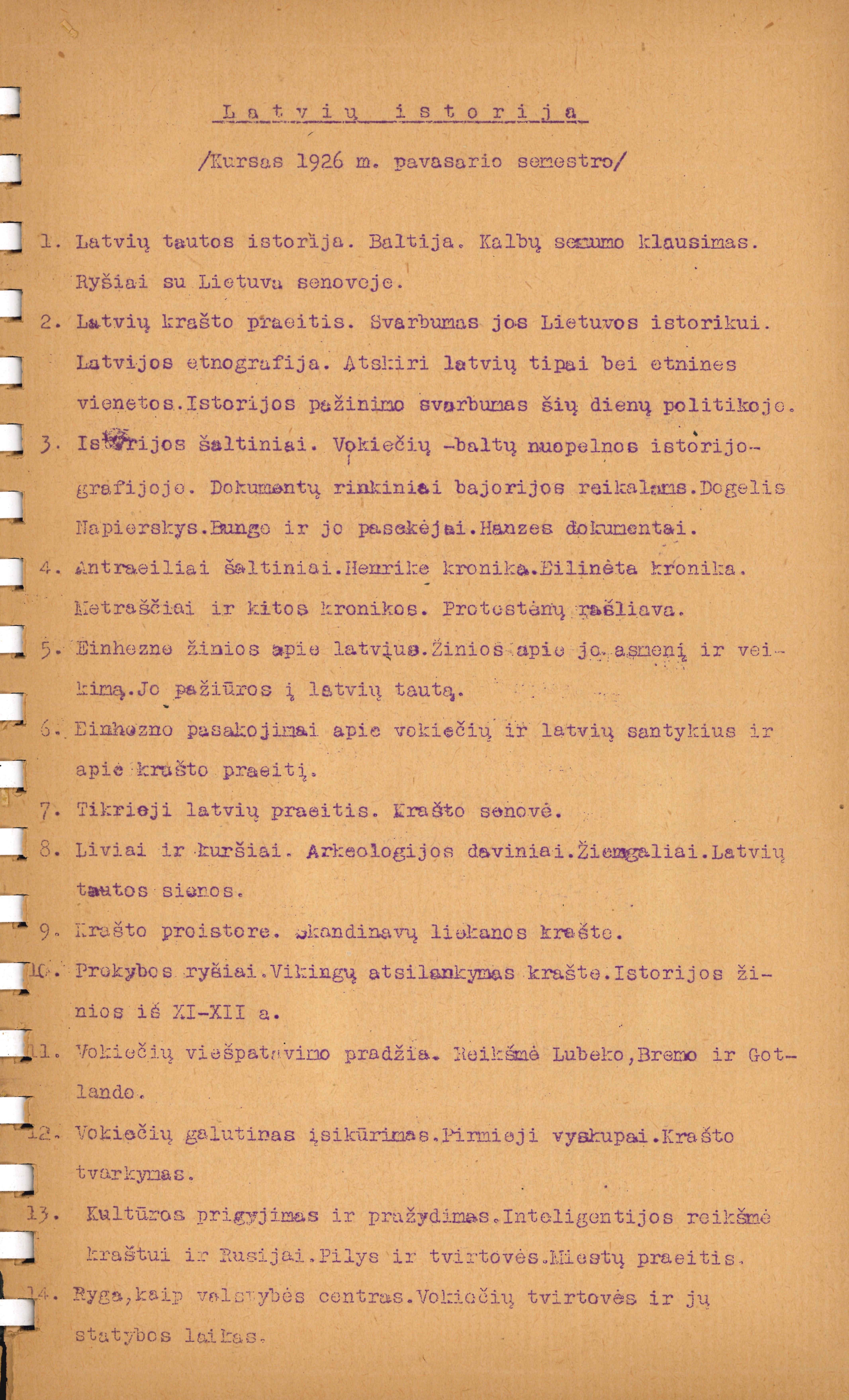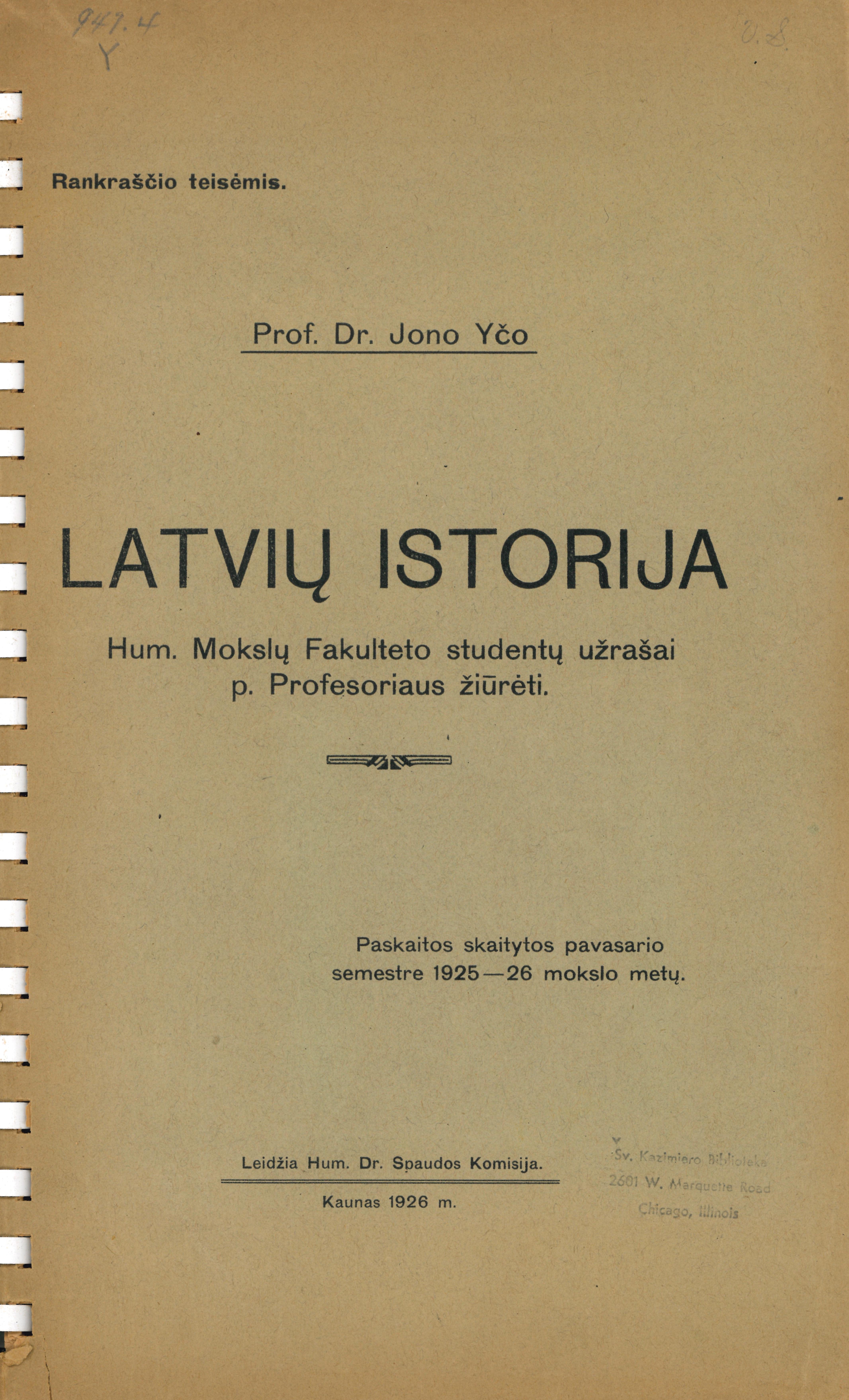 Latvių istorija: paskaitos skaitytos pavasario semestre 1925–26 mokslo metų / Jonas Yčas. – Kaunas: [Lietuvos universiteto studentų humanitarų draugijos spaudos komisija], 1926. – 157 l.