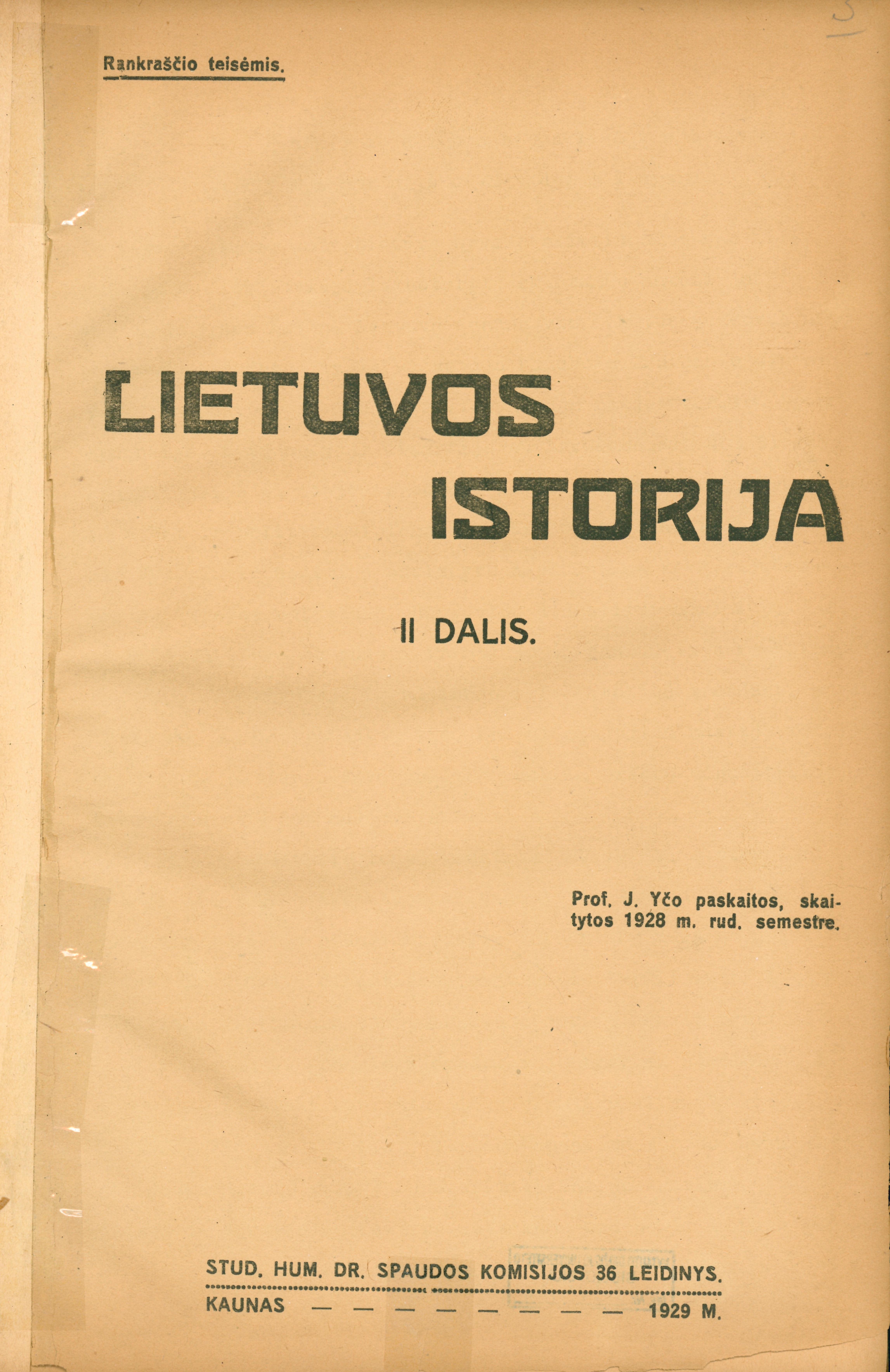 | Antraštė | Lietuvos istorija. D. 2: Prof. J. Yčo paskaitos, skaitytos 1928 m. rudens semestre. – Kaunas: Studentų humanitarų draugijos spaudos komisija, 1929. – 155 l. [lt] |