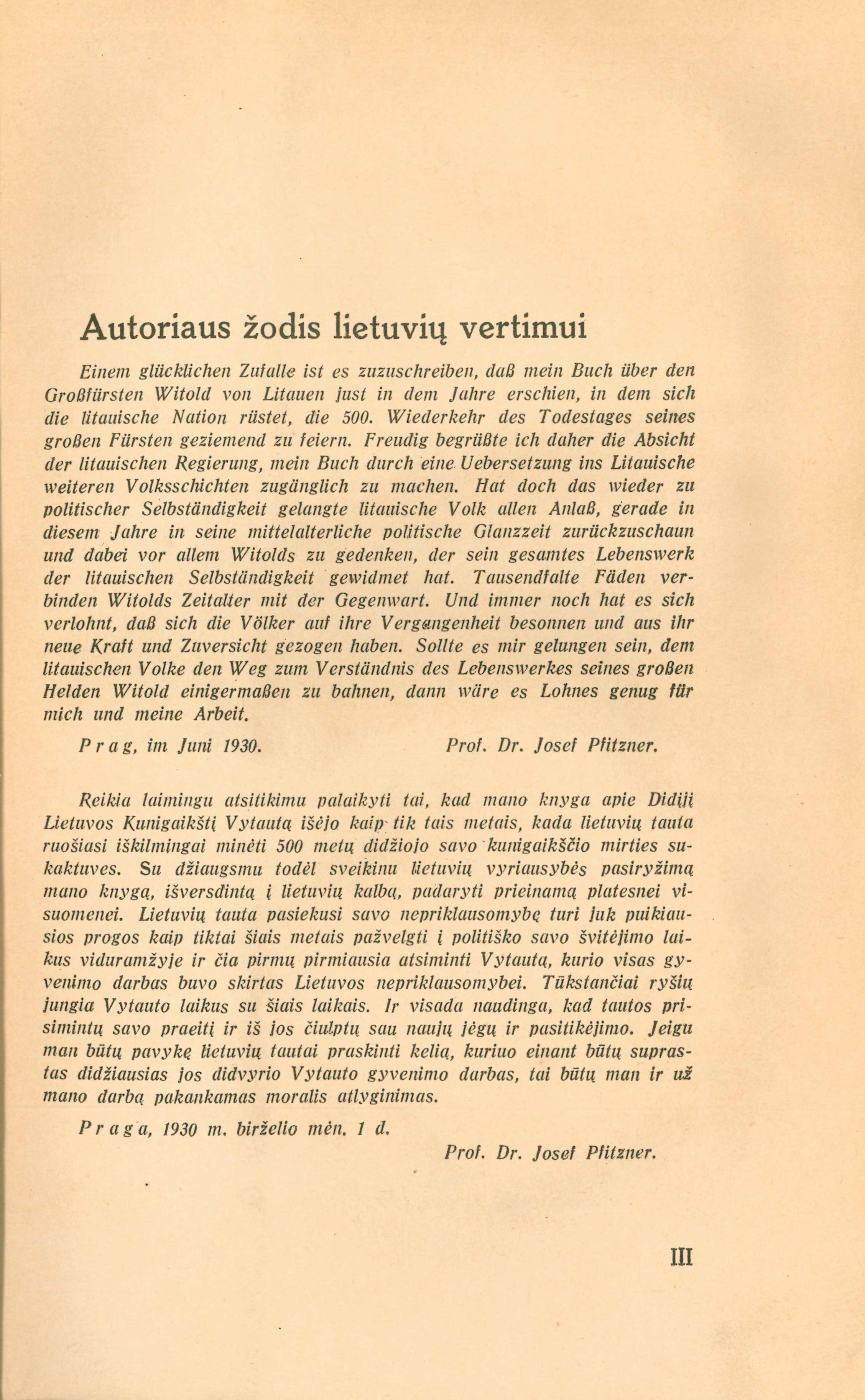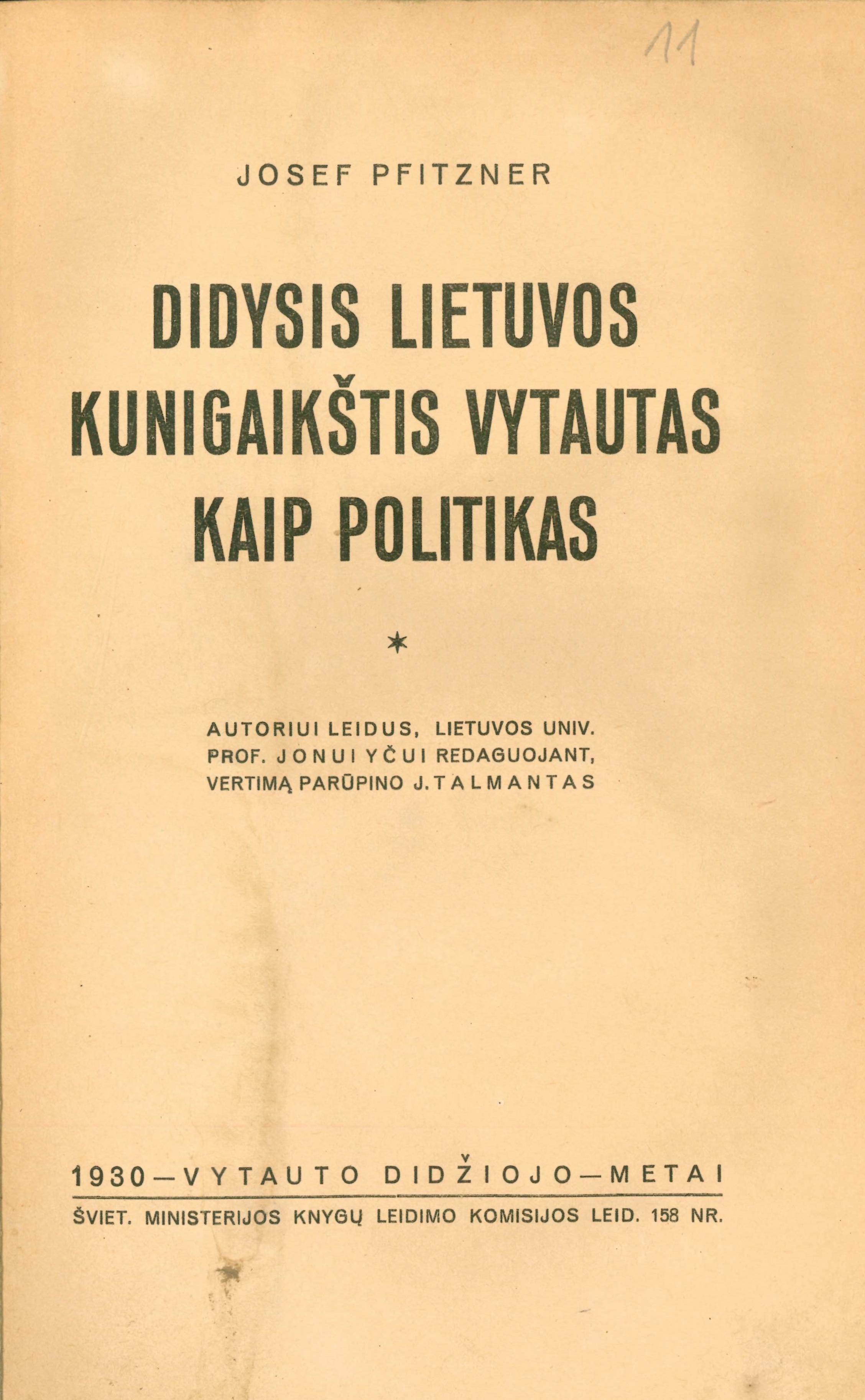 | Didysis Lietuvos kunigaikštis Vytautas kaip politikas / Josef Pfitzner; Jonui Yčui redaguojant, vertimą parūpino J. Talmantas. – Kaunas: Švietimo ministerijos Knygų leidimo komisija, 1930. – VII, 270 p. [lt] | |