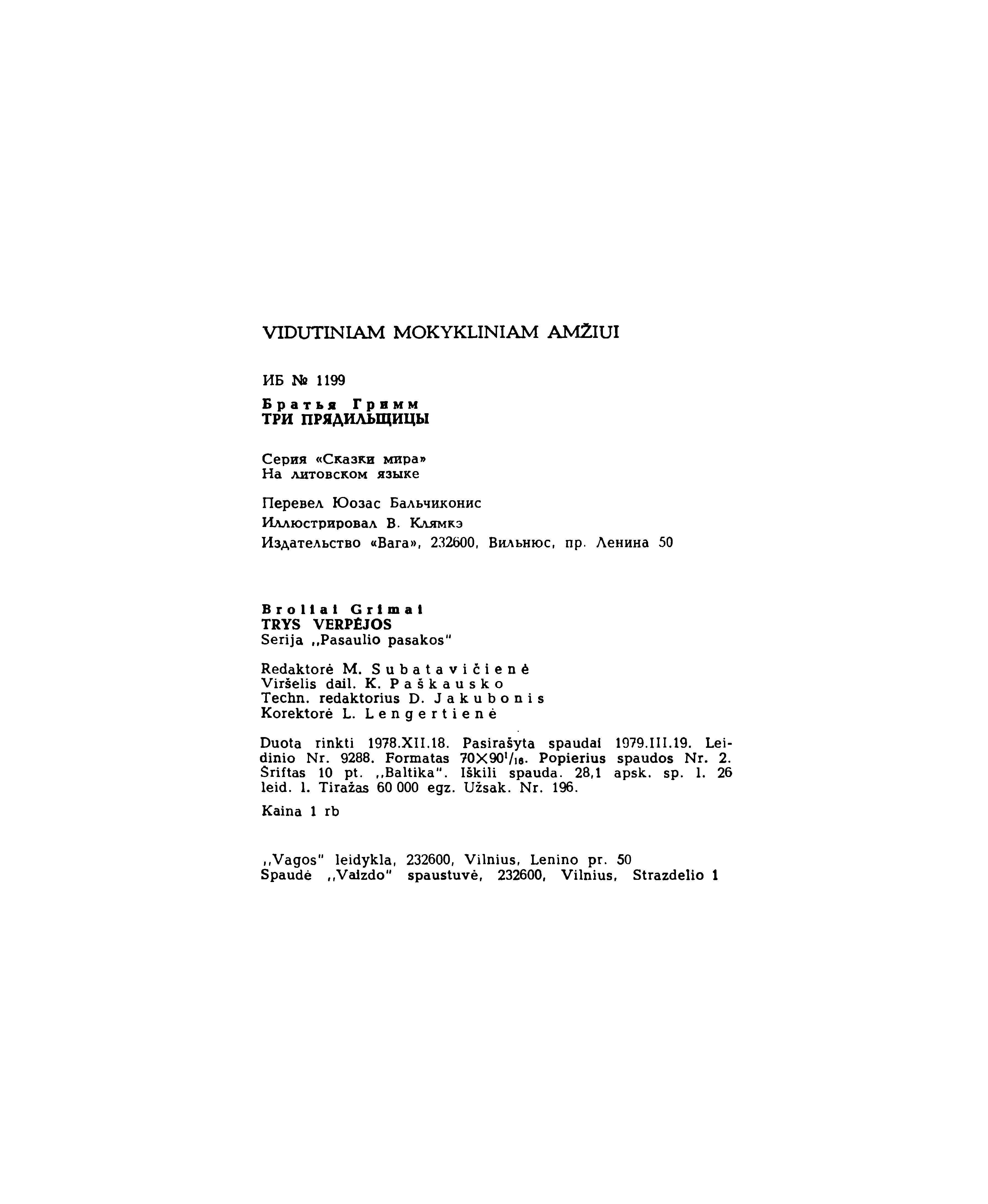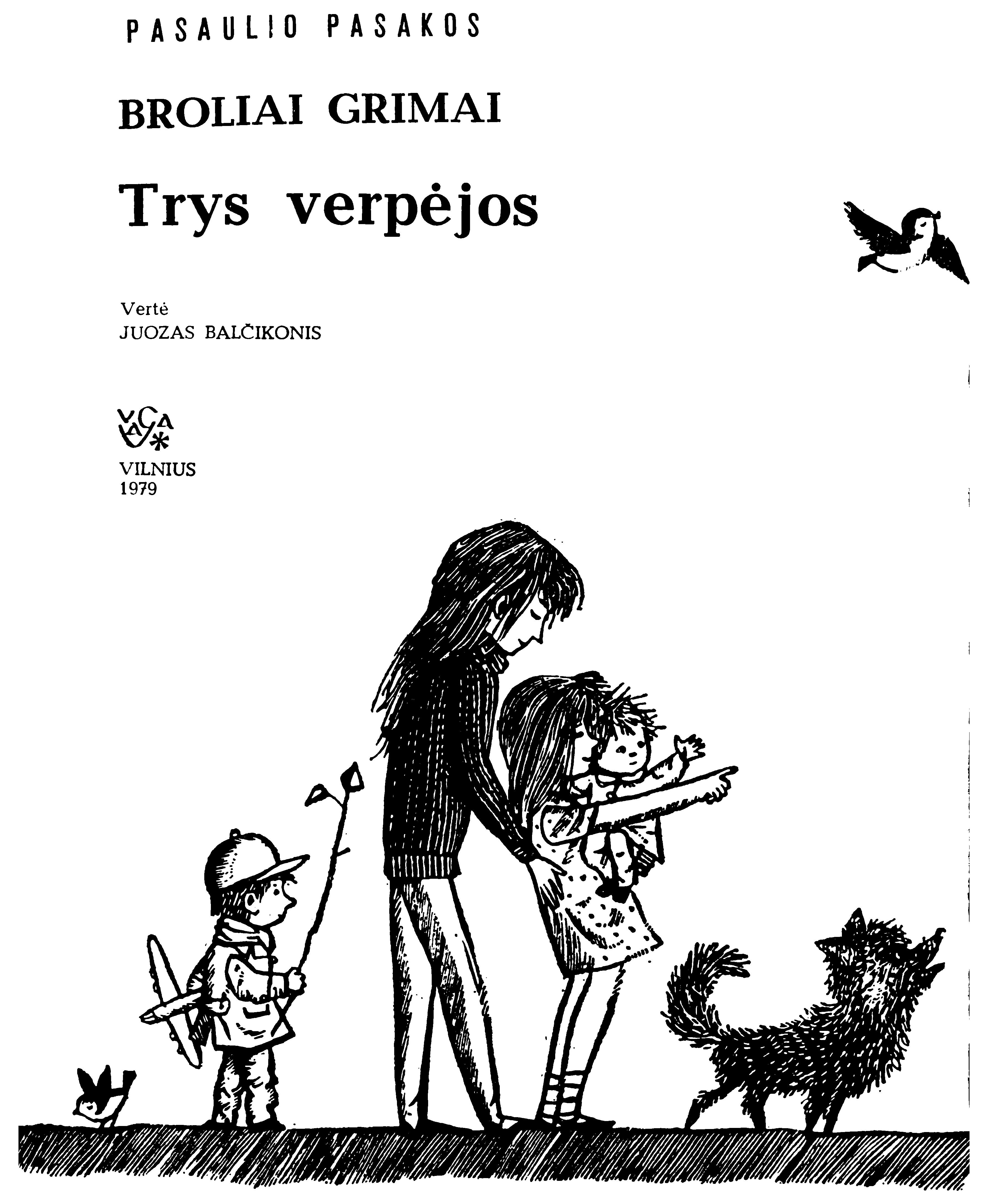 | Antraštė | Trys verpėjos / Broliai Grimai; vertė Juozas Balčikonis. – 3-ias leidimas. – Vilnius: Vaga, 1979. – 382, [2] p. [lt] |