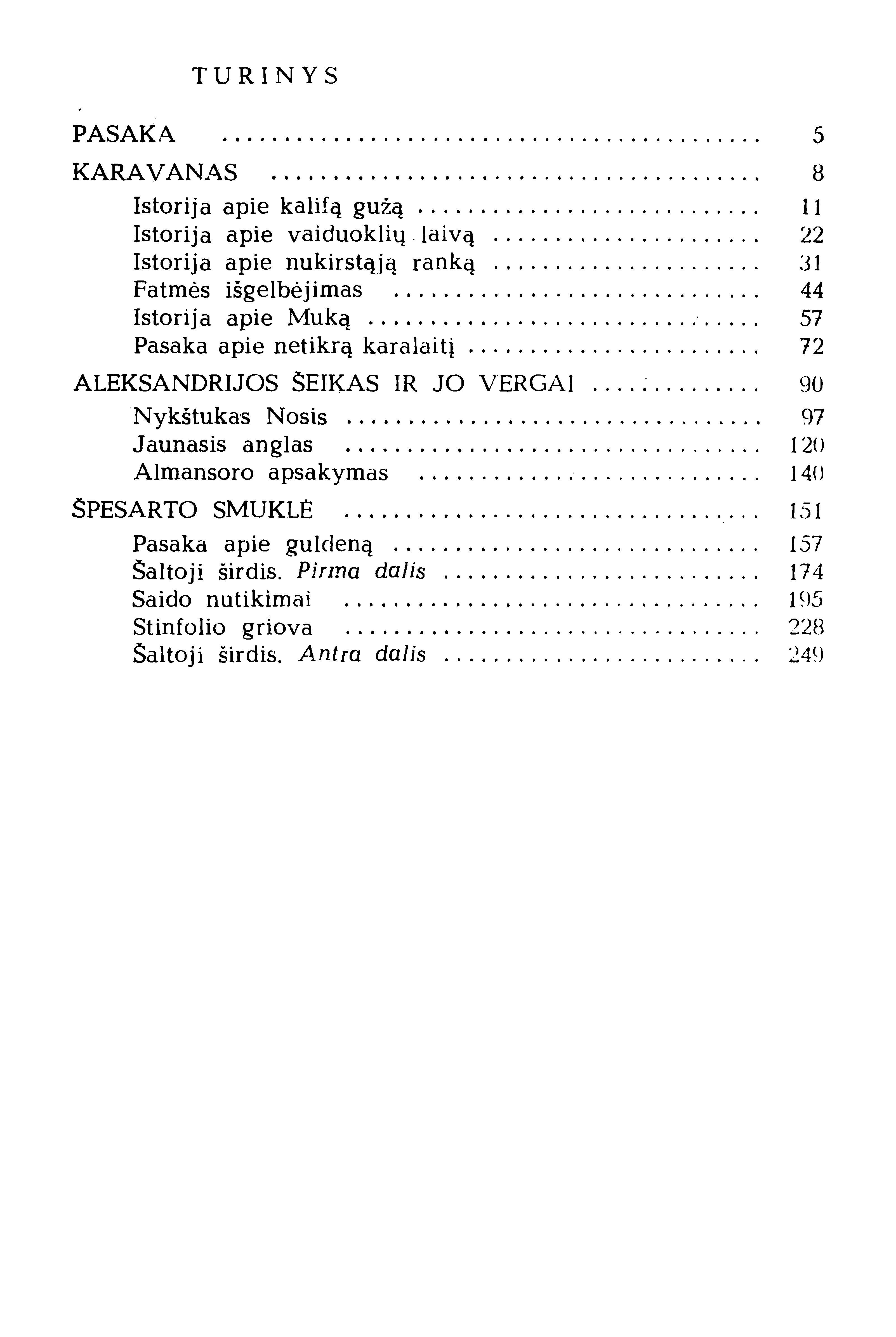| Šaltoji širdis / Vilhelmas Haufas; vertė Juozas Balčikonis. – 2-asis leidimas. – Vilnius: Vyturys, 1989. – 270, [2] p. [lt] | |