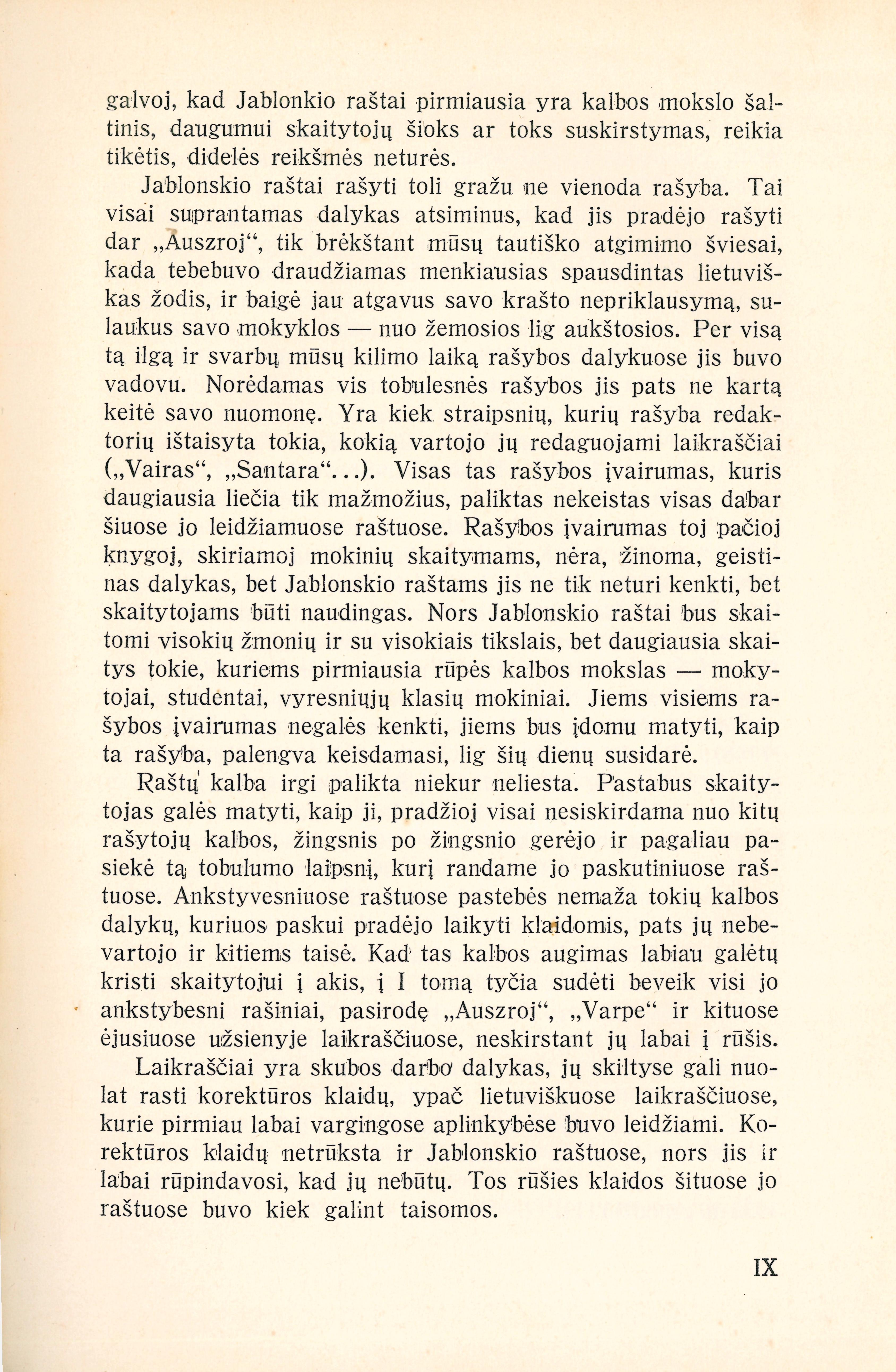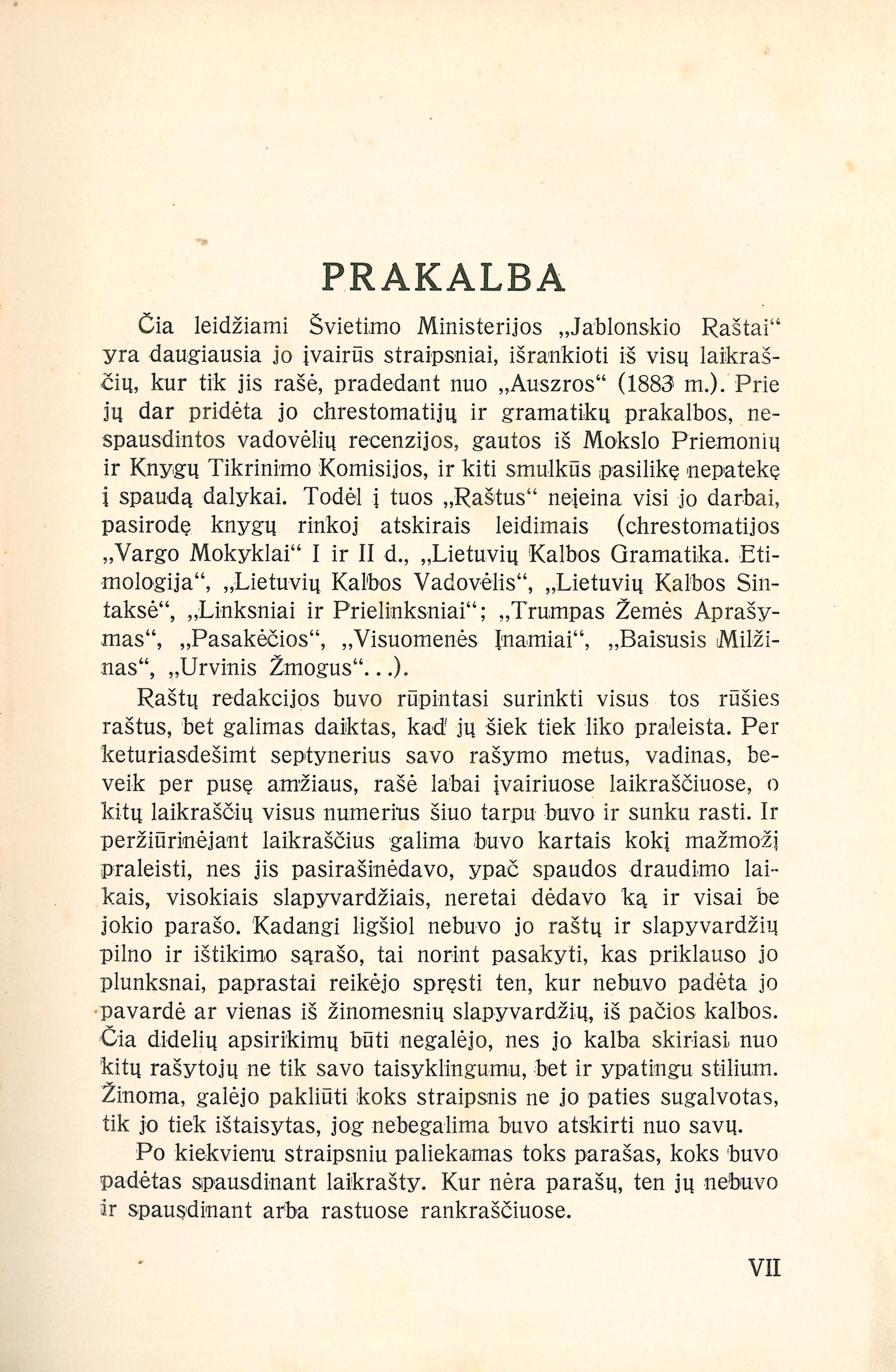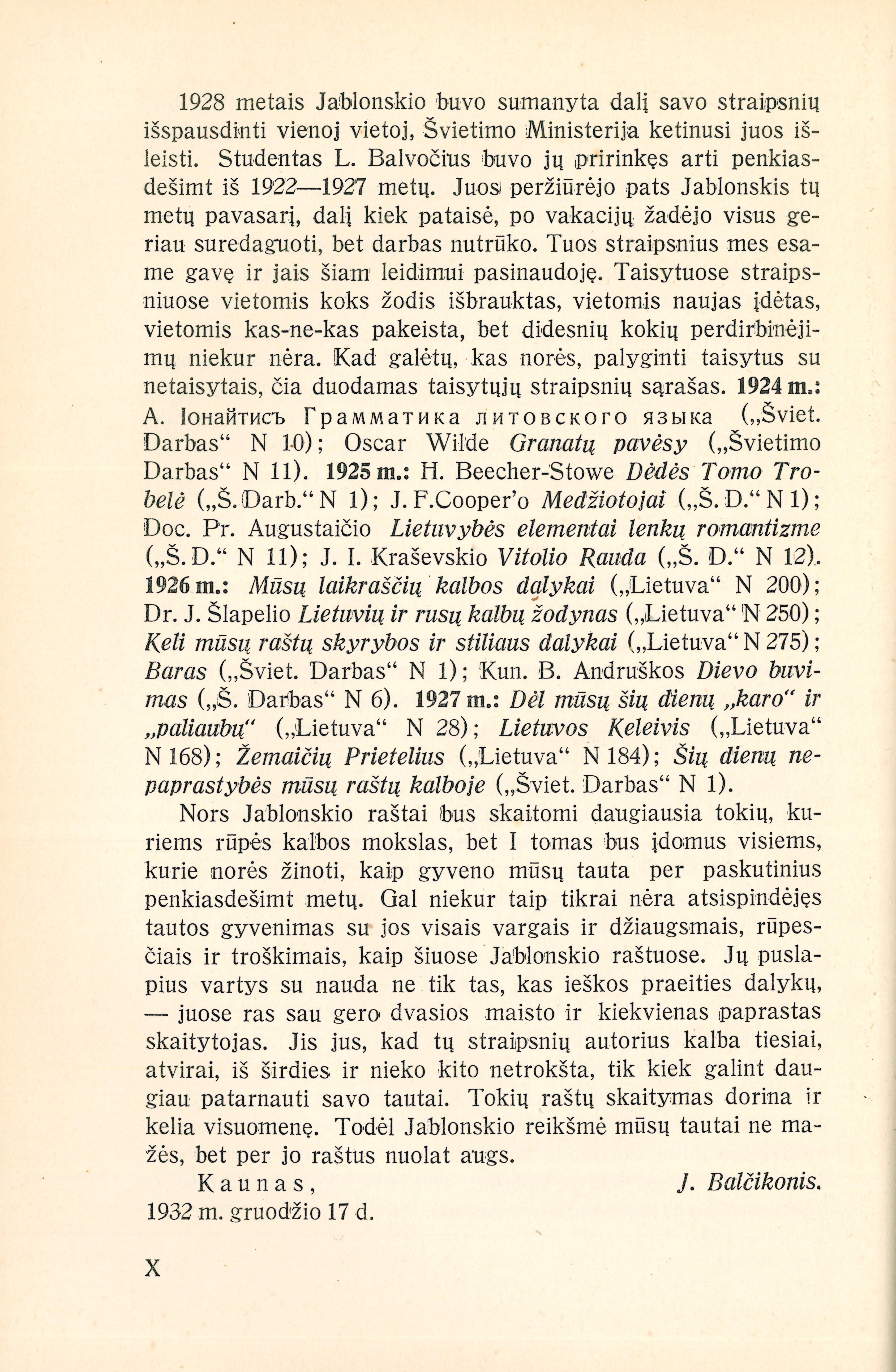 | Antraštė | Jablonskio raštai. T. 1: Visuomenės straipsniai / redagavo J. Balčikonis. – Kaunas: Švietimo ministerija, 1932. – XXXII, 320, [12] p. (Švietimo ministerijos leidinys; Nr. 344) [lt] |