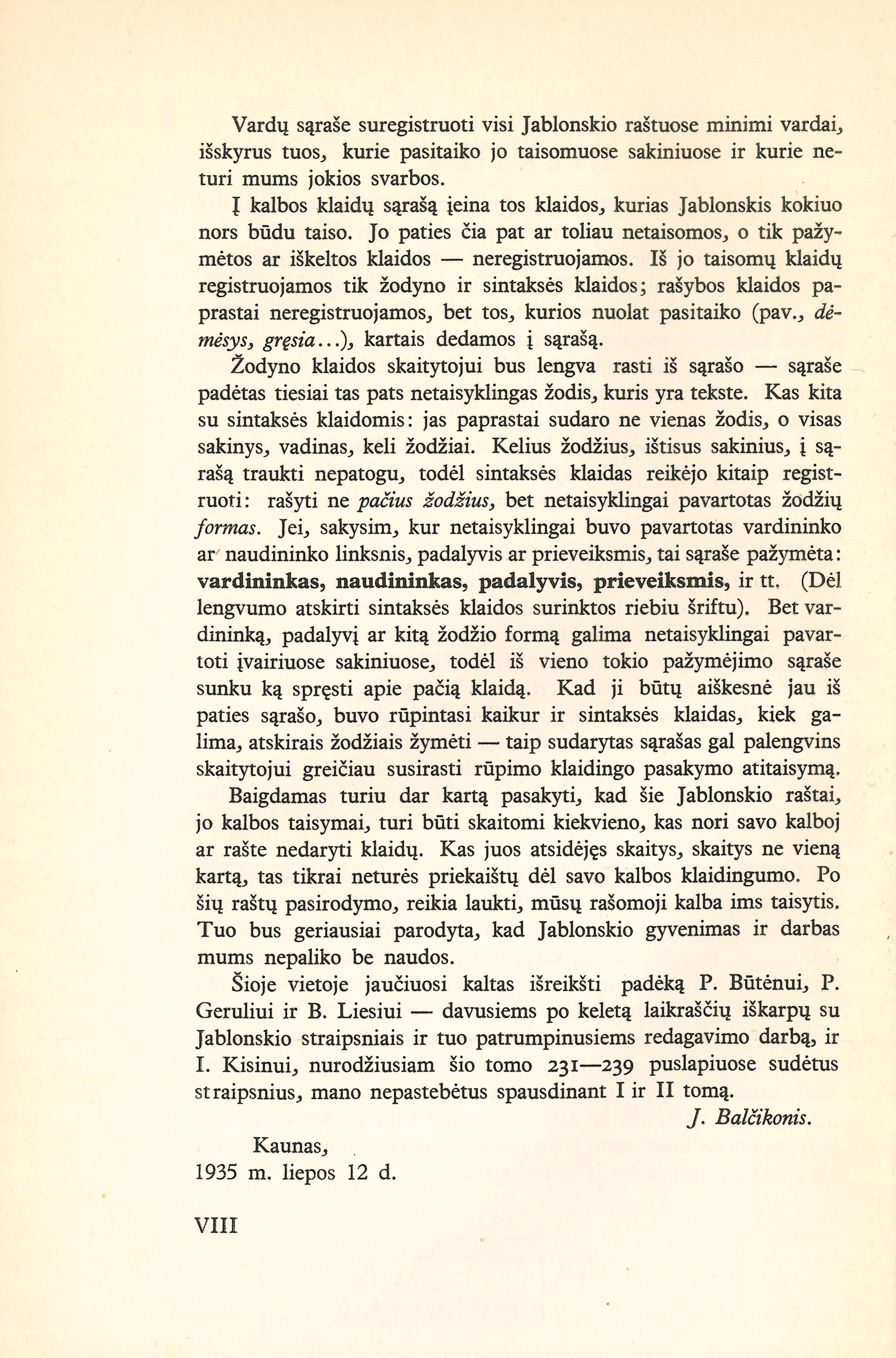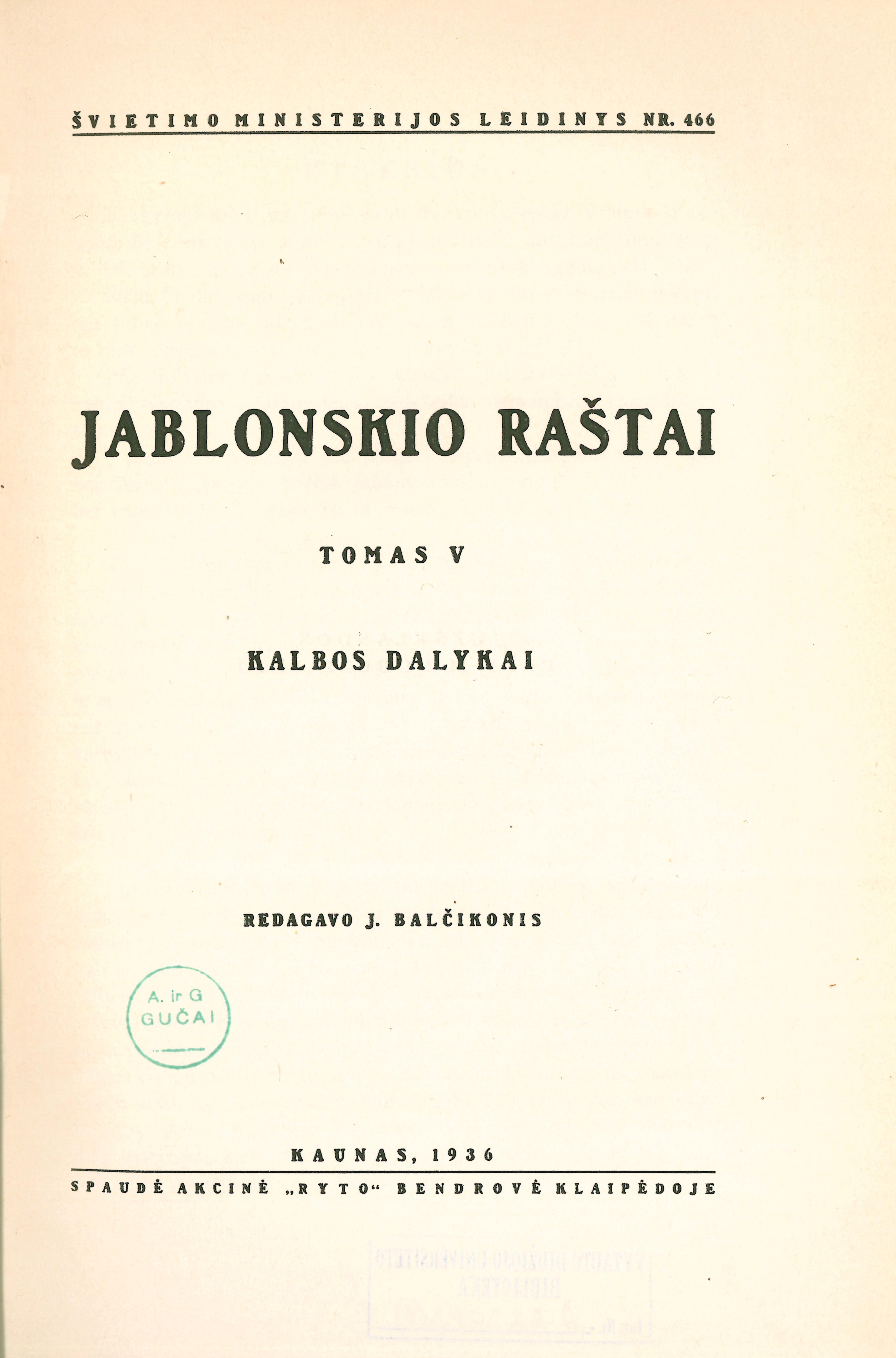 | Antraštė | Jablonskio raštai. T. 5: Kalbos dalykai / redagavo J. Balčikonis. – Kaunas: Švietimo ministerija, 1936. – IX, 280, [17] p. (Švietimo ministerijos leidinys; Nr. 466) [lt] |