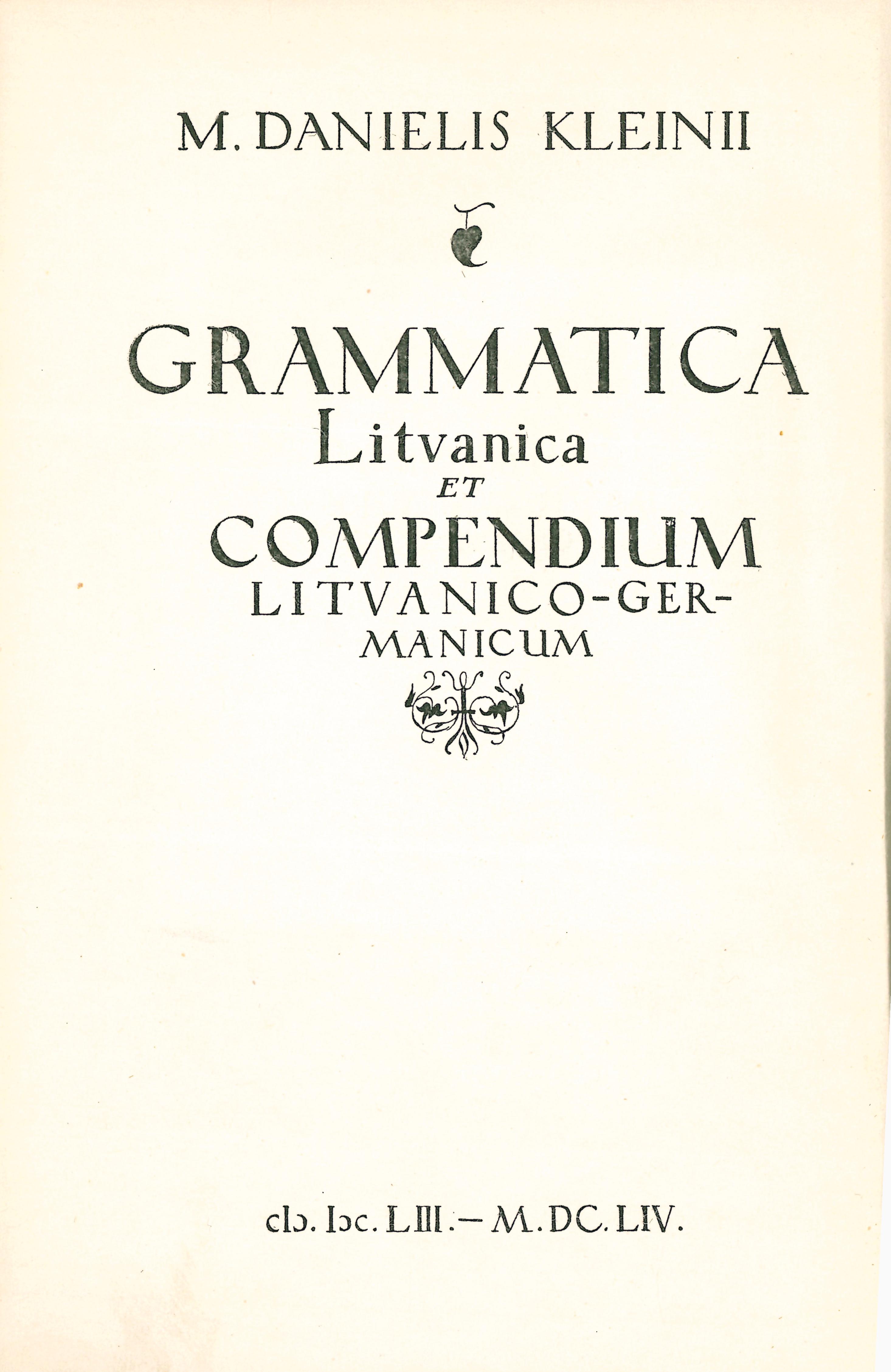 | Pirmoji lietuvių kalbos gramatika: 1653 metai / [D. Kleino „Grammatica Lituanica et Compendium Lituanico-Germanicum“ fotografuotini tekstai ir vertimai]; [vyr. redaktoriai: J. Balčikonis ir B. Larinas]; [gramatiką iš lotynų k. išvertė K. Eigminas, kompendiumą išvertė E. Kraštinaitis]; [paaiškinimus, rodykles ir parengė ir leidinį redagavo V. Ambrazas, T. Buchienė, J. Kruopas, J. Sabaliauskas, J. Senkus, K. Ulvydas, A. Vidugiris]. - Vilnius: Valstybinė politinės ir mokslinės literatūros leidykla, 1957. – 654, [2] p. [lt] | |