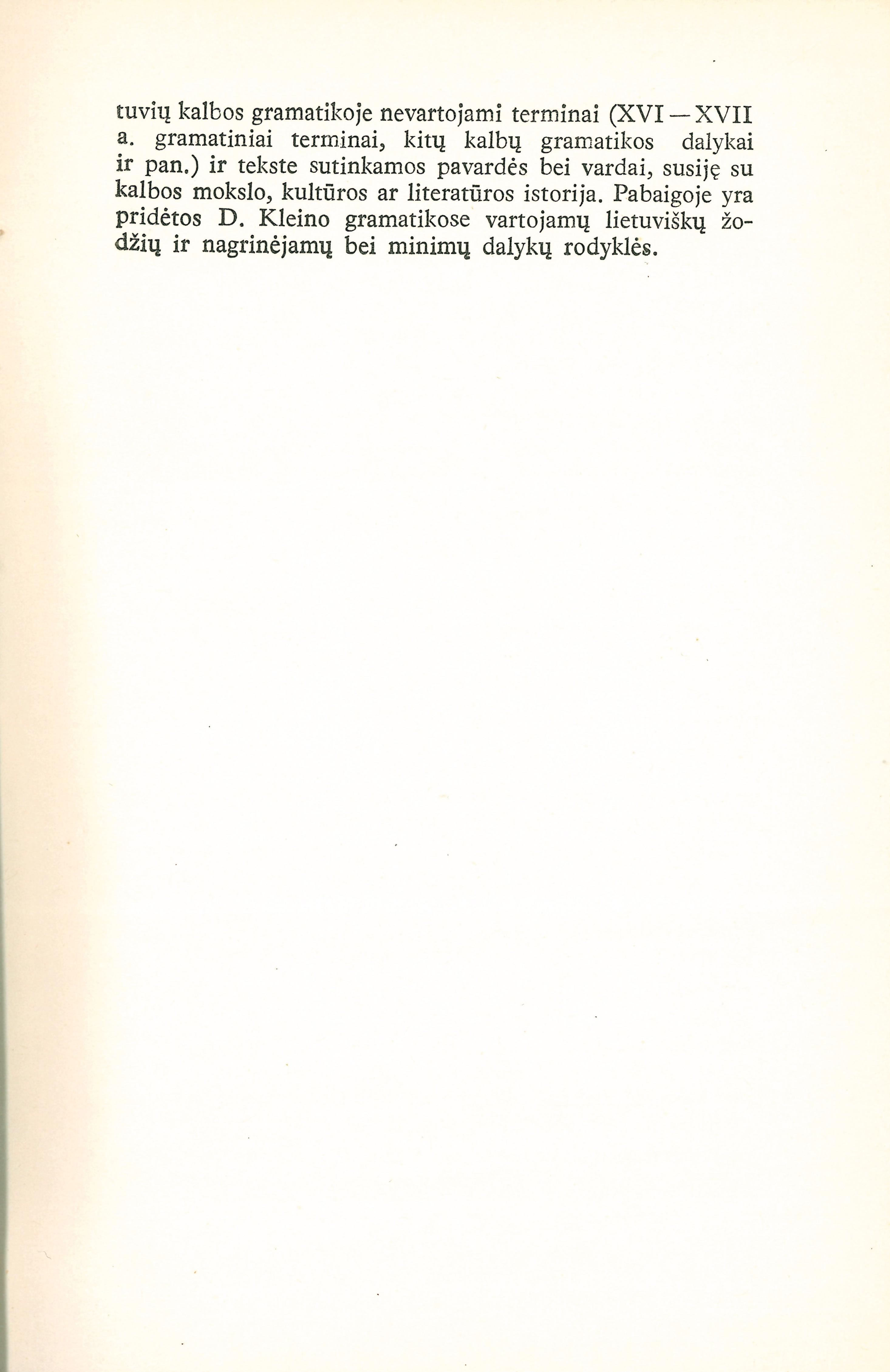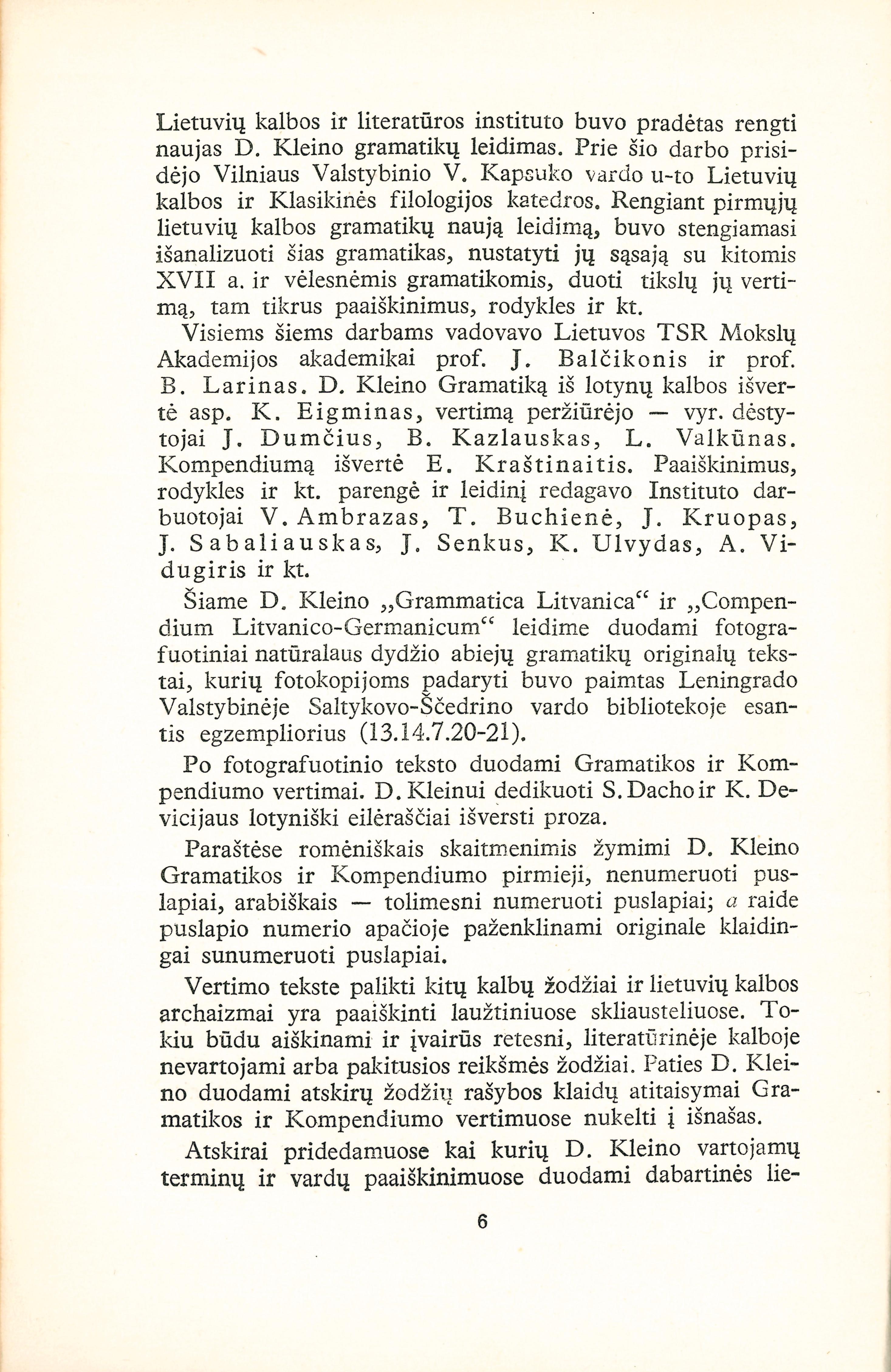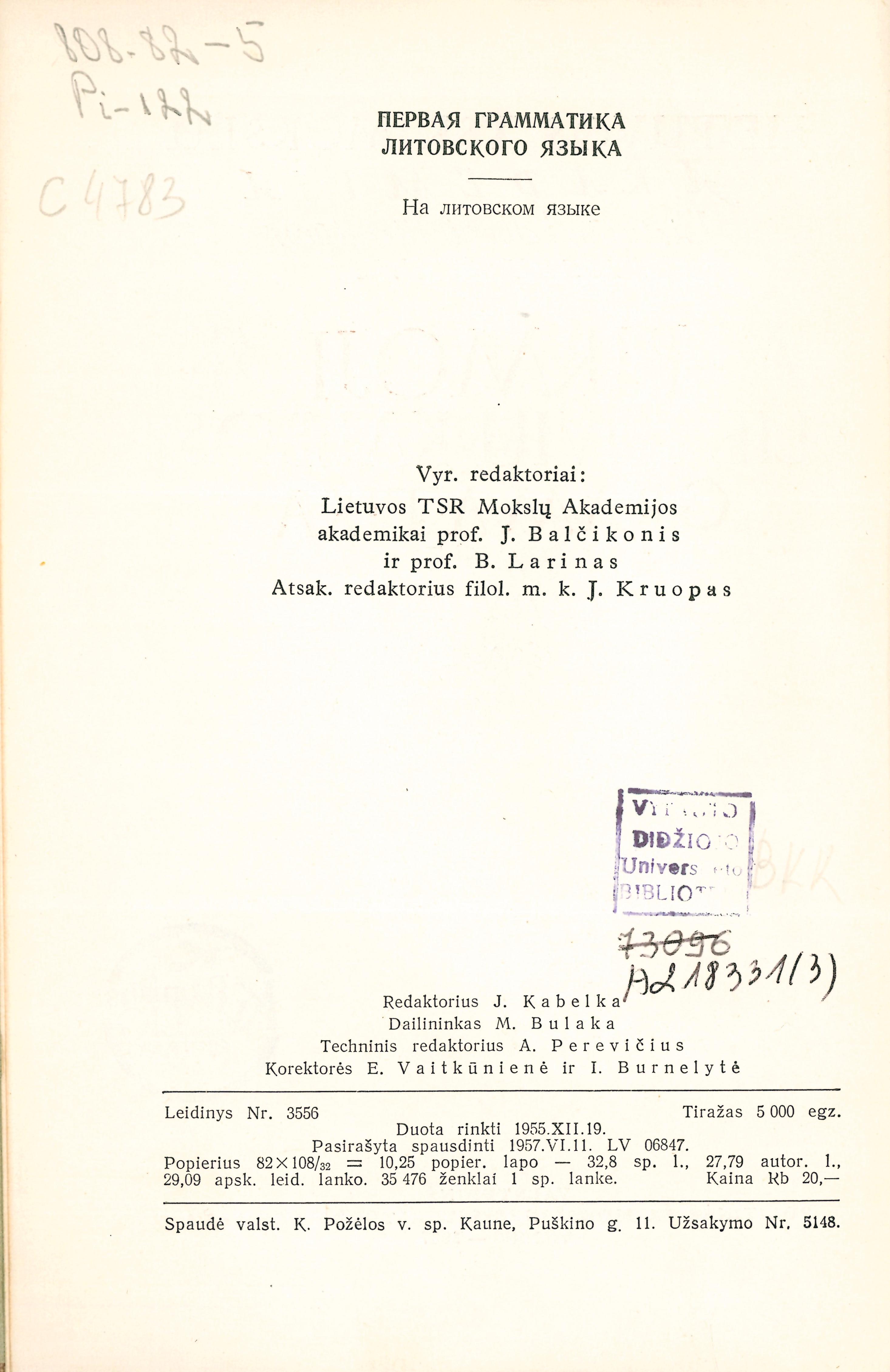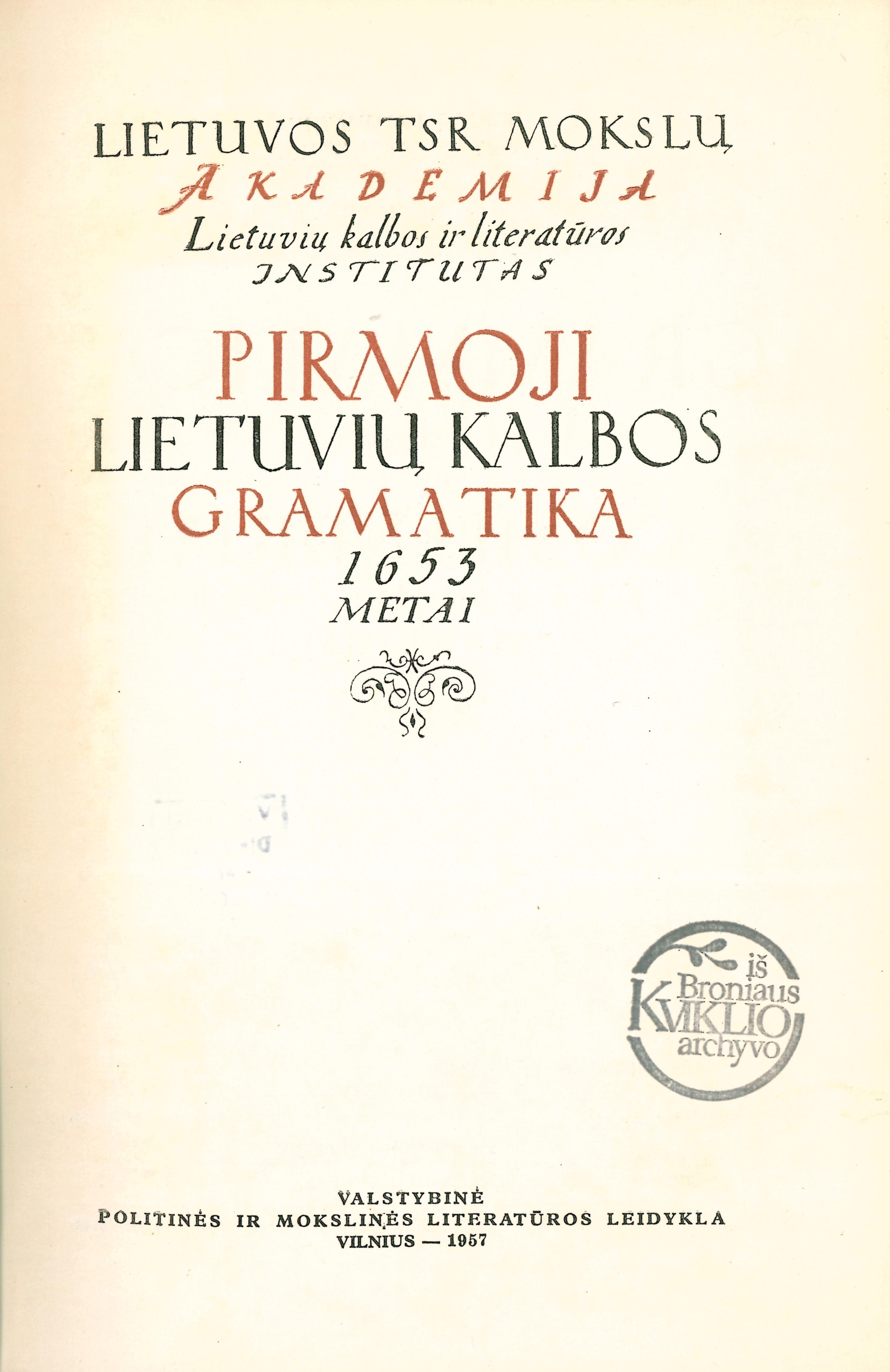 | Antraštė | Pirmoji lietuvių kalbos gramatika: 1653 metai / [D. Kleino „Grammatica Lituanica et Compendium Lituanico-Germanicum“ fotografuotini tekstai ir vertimai]; [vyr. redaktoriai: J. Balčikonis ir B. Larinas]; [gramatiką iš lotynų k. išvertė K. Eigminas, kompendiumą išvertė E. Kraštinaitis]; [paaiškinimus, rodykles ir parengė ir leidinį redagavo V. Ambrazas, T. Buchienė, J. Kruopas, J. Sabaliauskas, J. Senkus, K. Ulvydas, A. Vidugiris]. - Vilnius: Valstybinė politinės ir mokslinės literatūros leidykla, 1957. – 654, [2] p. [lt] |