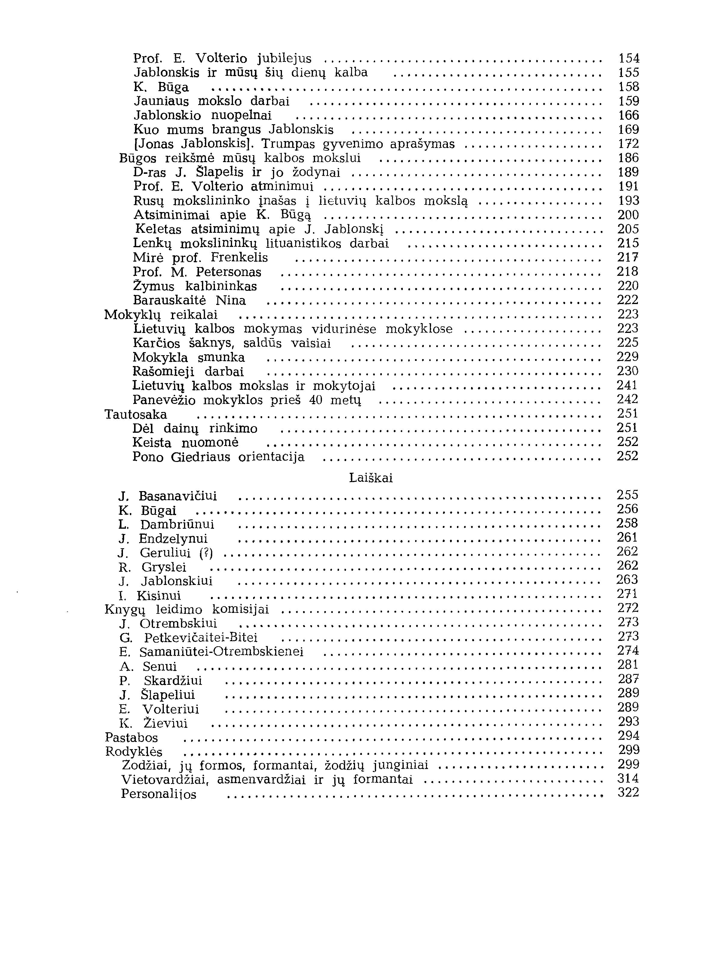 | Turinys: Fonetika ir rašyba: paskaitos (apie 1924); Sintaksė: paskaitos (po 1924); Lietuvių kalbos tarmės (1924-1930); Kun. Jauniaus gyvenimas (1908); Prof. E. Volterio jubilejus (1910); Jablonskis ir mūsų šių dienų kalba (1920); K. Būga (1924); Jauniaus mokslo darbai (1928); Jablonskio nuopelnai (1930); Kuo mums brangus Jablonskis (1931); [Jonas Jablonskis], Trumpas gyvenimo aprašymas (1933); Būgos reikšmė mūsų kalbos mokslui (1934); D-ras J. Šlapelis ir jo žodynai (1941); Prof. E. Volterio atminimui (1942); Rusų mokslininko įnašas į lietuvių kalbos mokslą; Atsiminimai apie K. Būgą (1956); Keletas atsiminimų apie J. Jablonskį (1956); Lenkų mokslininkų lituanistikos darbai (1957); Mirė prof. Frenkelis (1957); Prof. M. Petersonas (1963); Žymus kalbininkas [Jan Otrębski (1964); Barauskaitė Nina; Lietuvių kalbos mokymas vidurinėse mokyklose (1912); Karčios šaknys, saldūs vaisiai (1921); Mokykla smunka (1927); Rašomieji darbai (1928); Lietuvių kalbos mokslas ir mokytojai (1935); Panevėžio mokyklos prieš 40 metų (1942); Dėl dainų rinkimo (1911); Keista nuomonė (1927); Pono Giedriaus orientacija (1927); Laiškai. [lt] | |