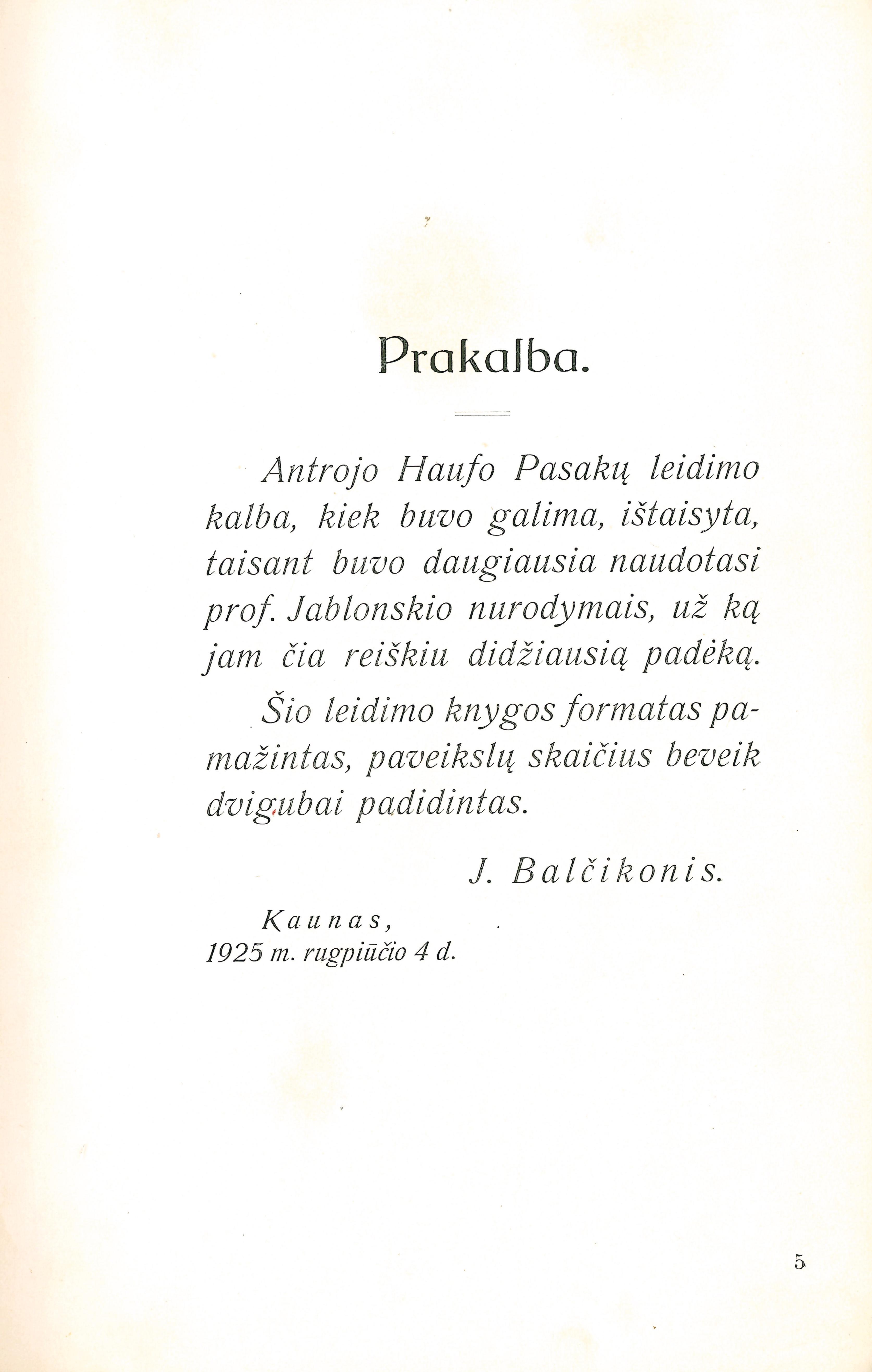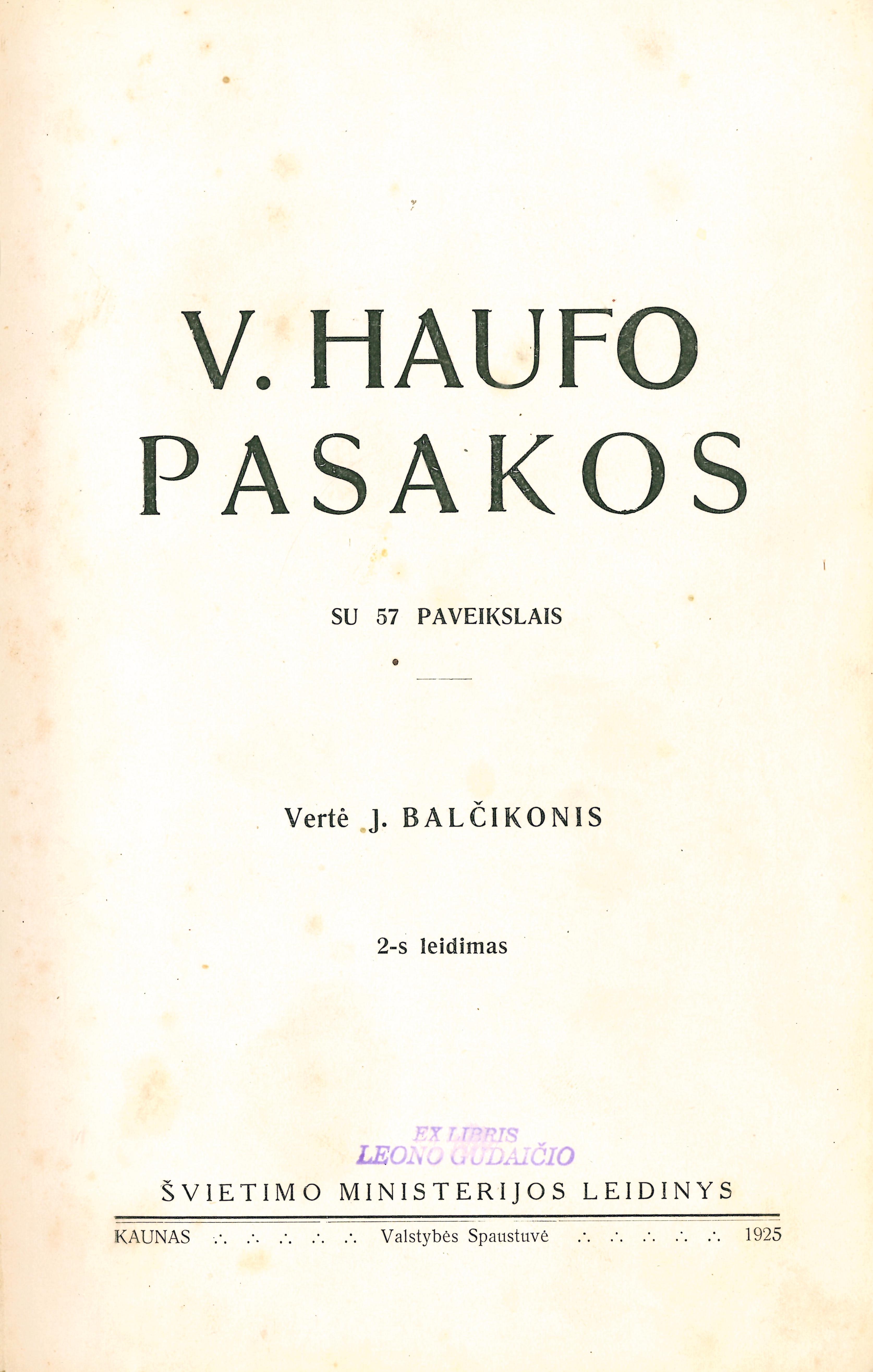 V. Haufo pasakos : su 57 paveikslais / vertė J. Balčikonis. – 2-as leid. – Kaunas : Švietimo ministerija, 1925. – 350 p. : iliustracijos.