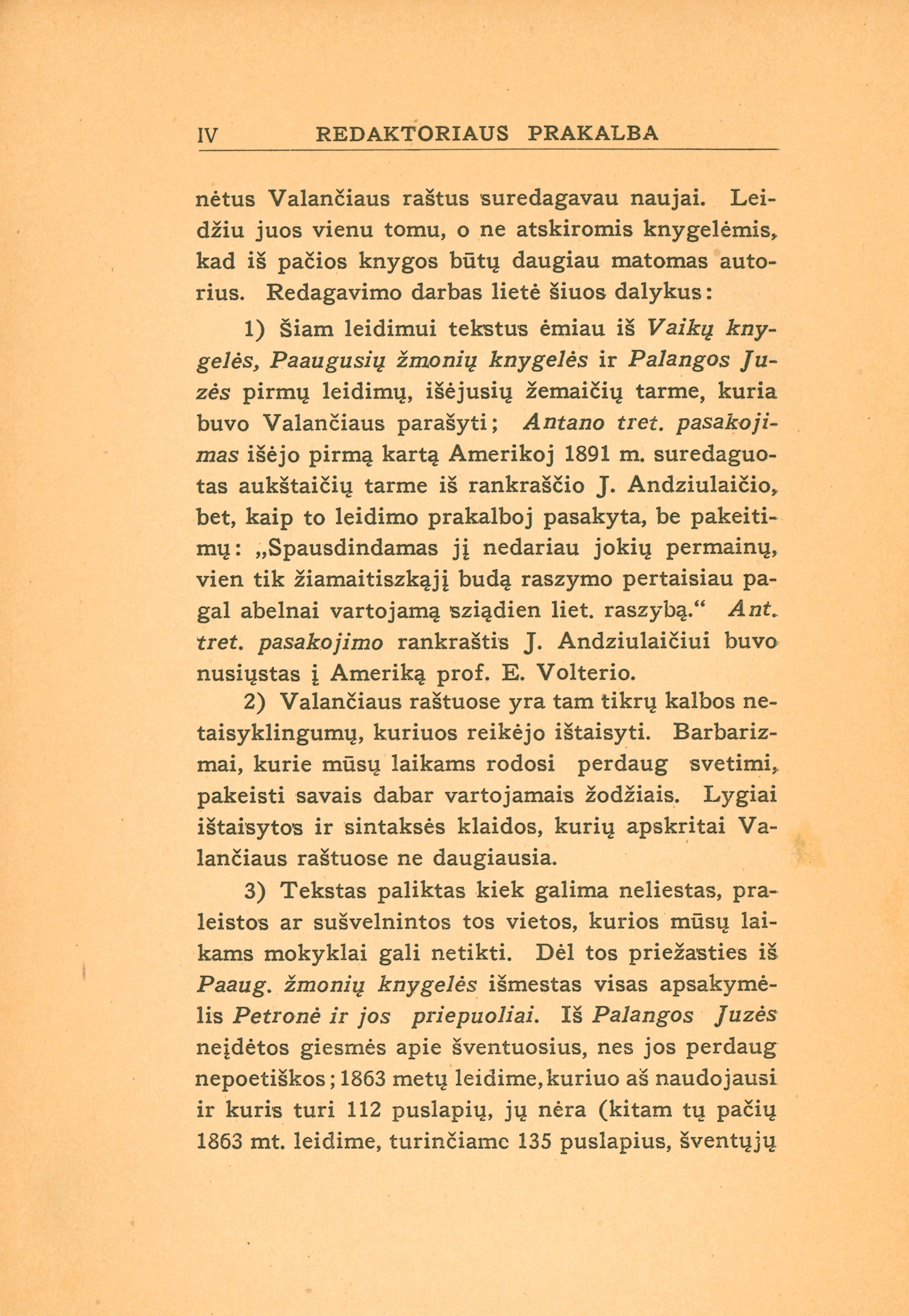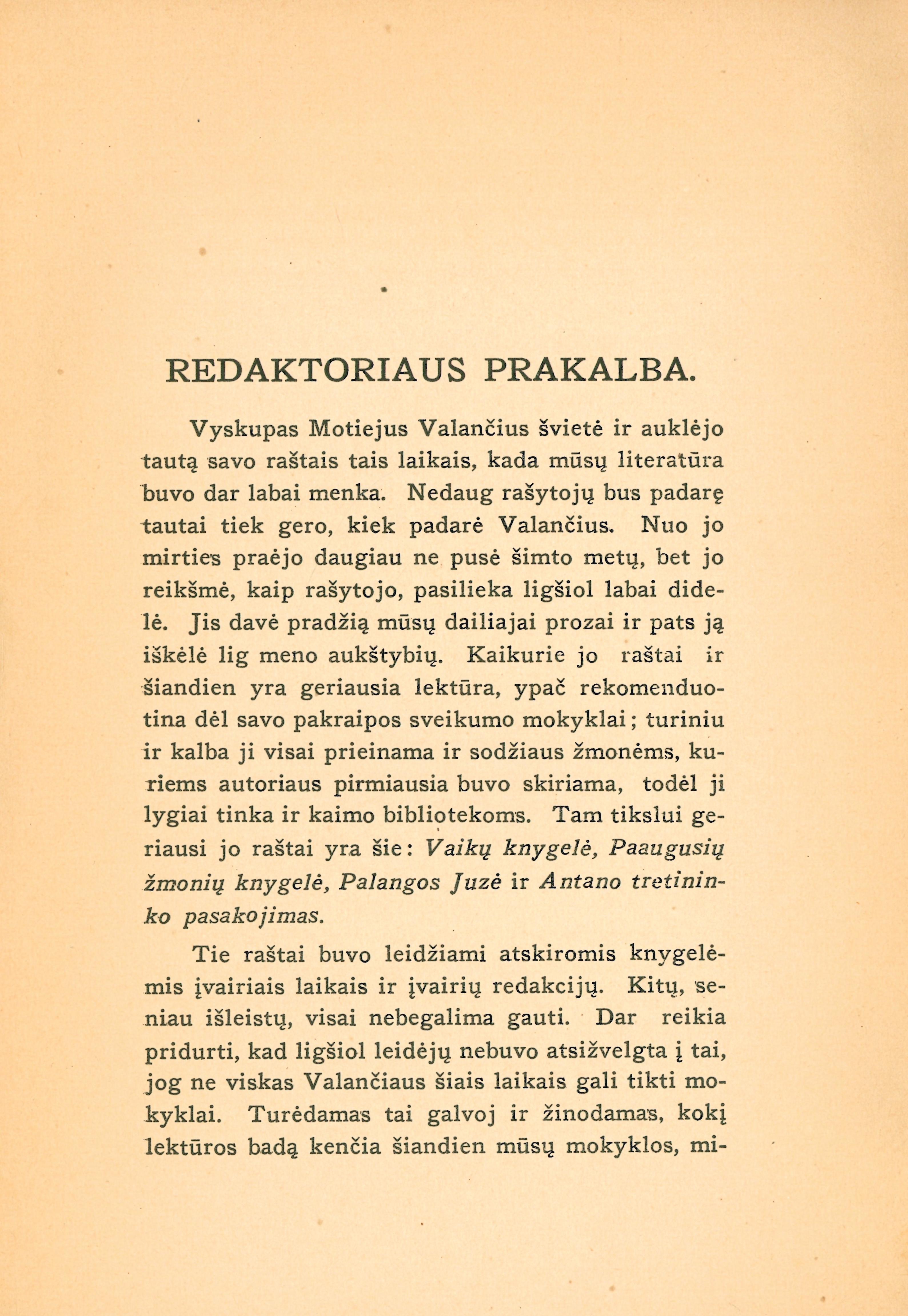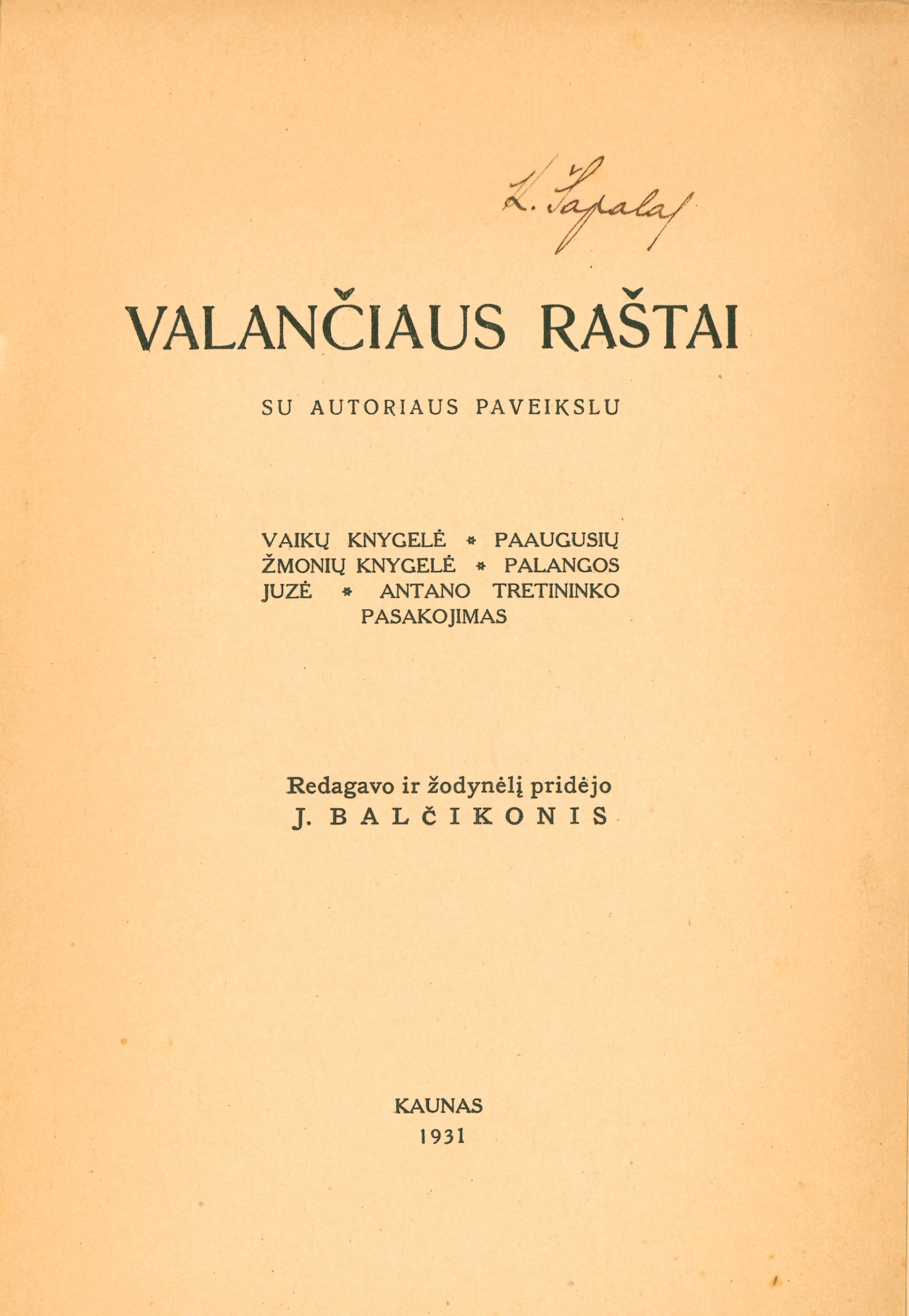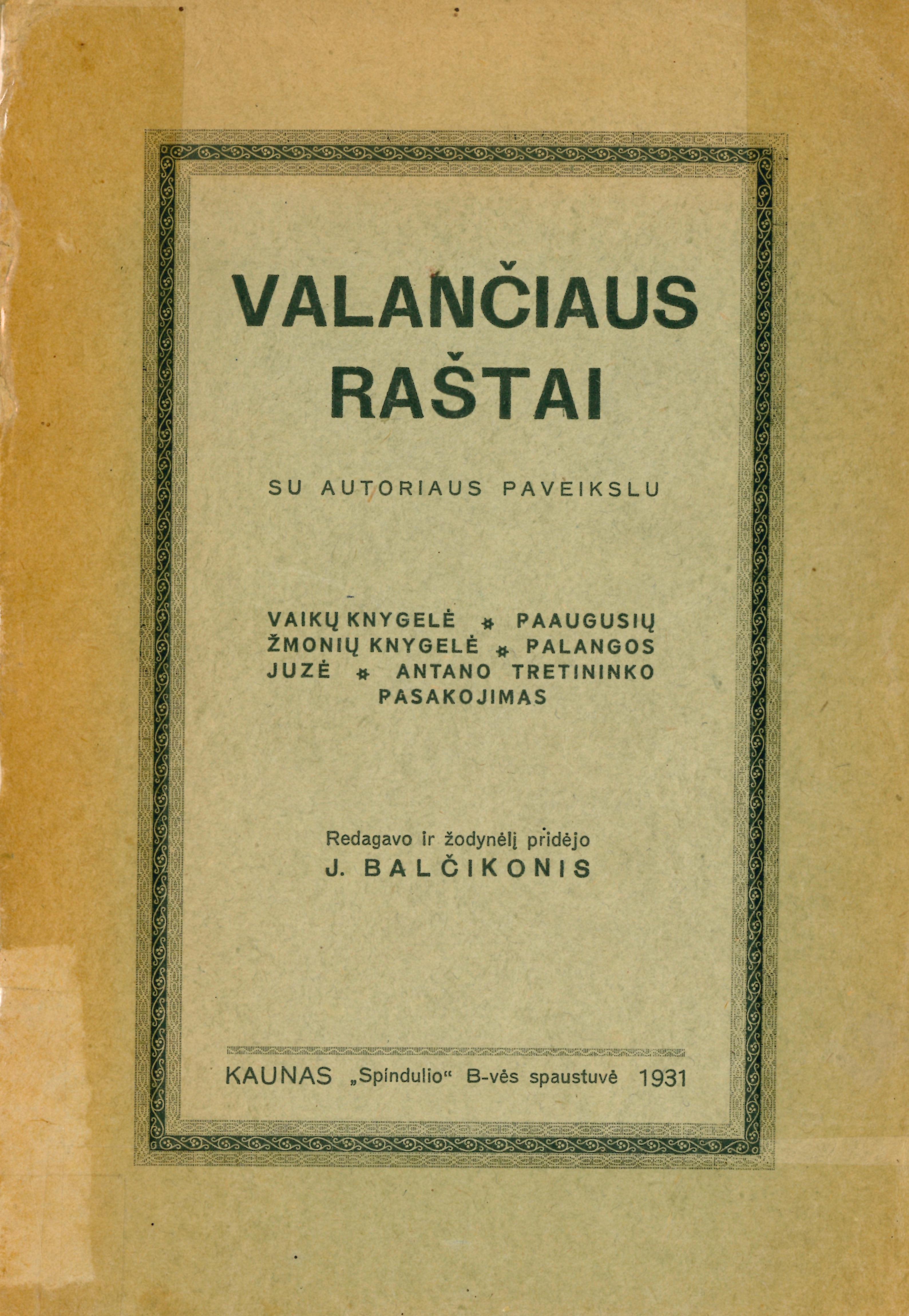 | Valančiaus raštai : su autoriaus paveikslu : Vaikų knygelė ; Paaugusių žmonių knygelė ; Palangos Juzė ; Antano Tretininko pasakojimas / redagavo ir žodynėlį pridėjo J. Balčikonis. - Kaunas, 1931. - VIII, 487 p. [lt] | |